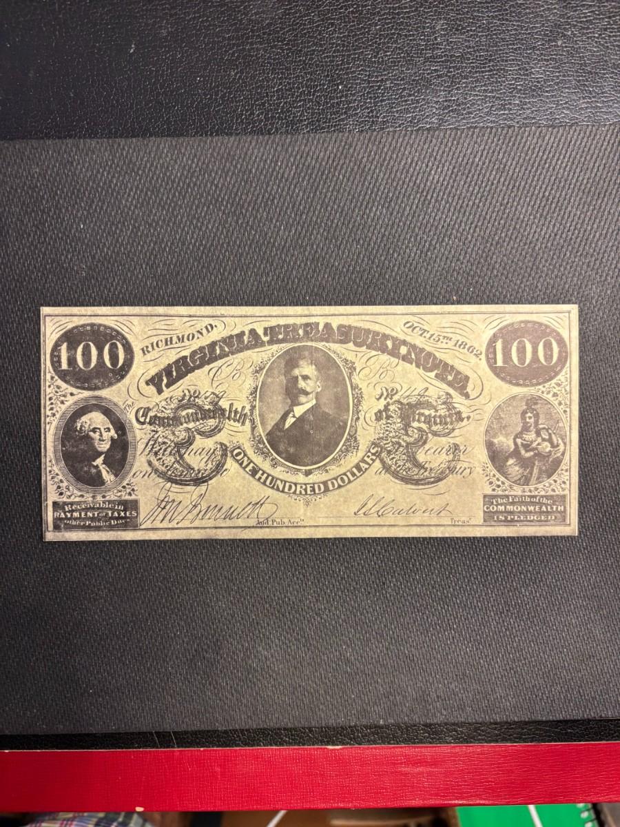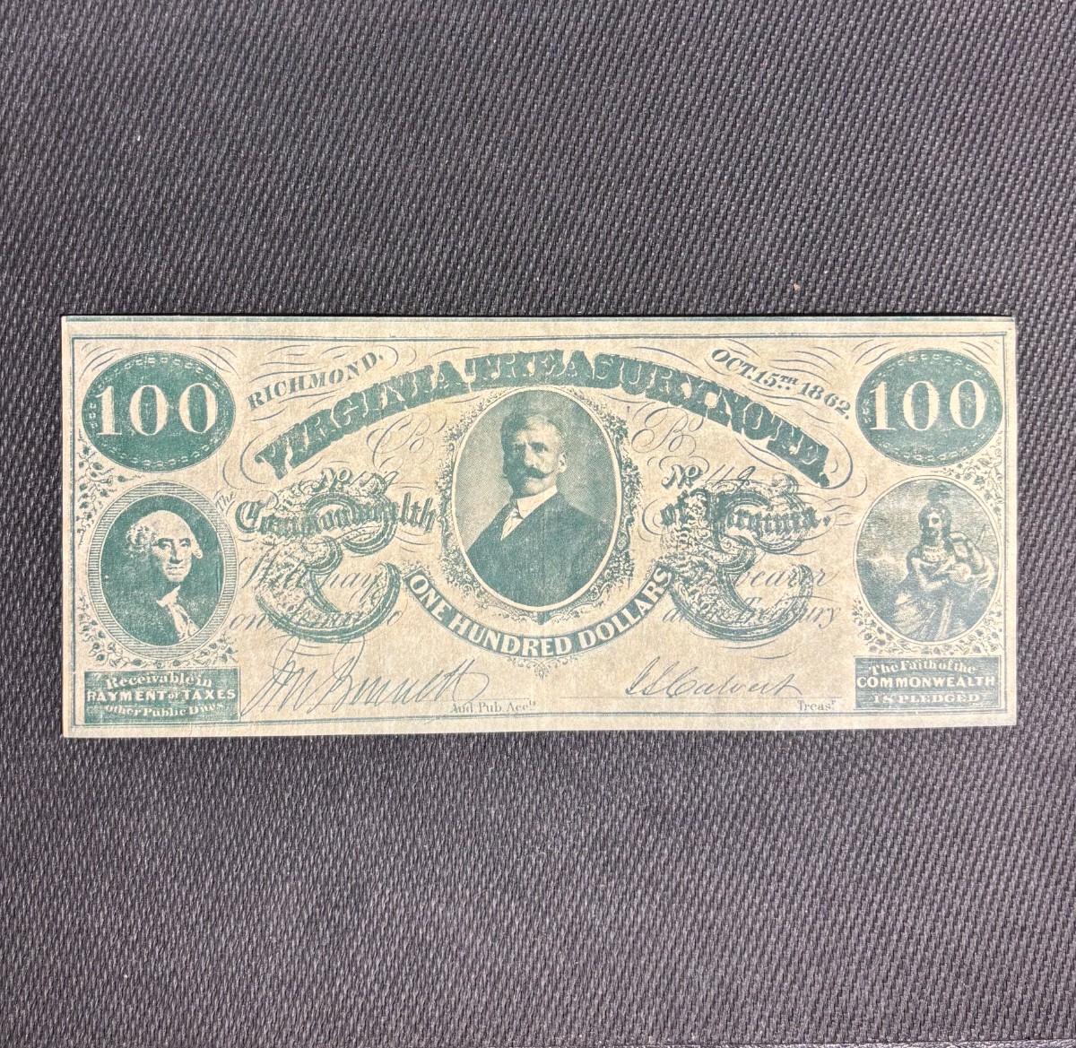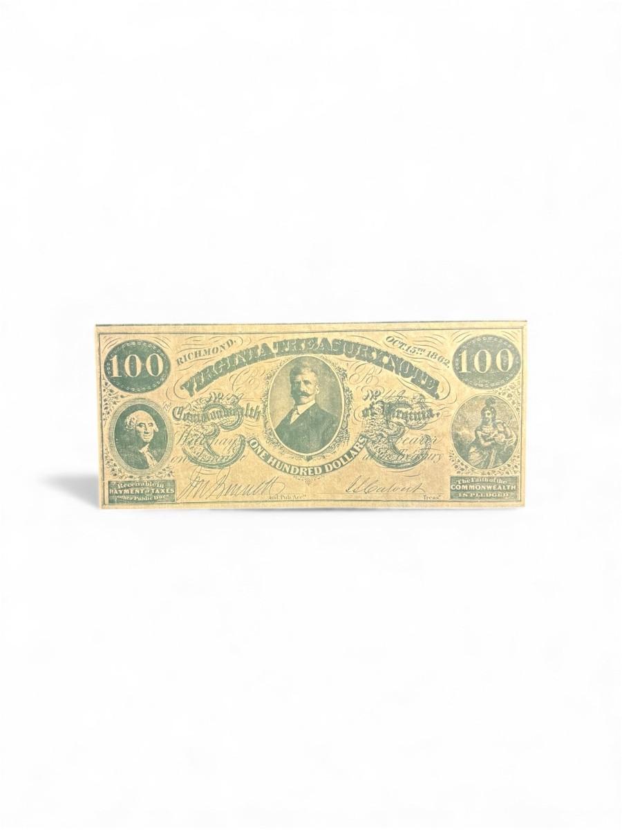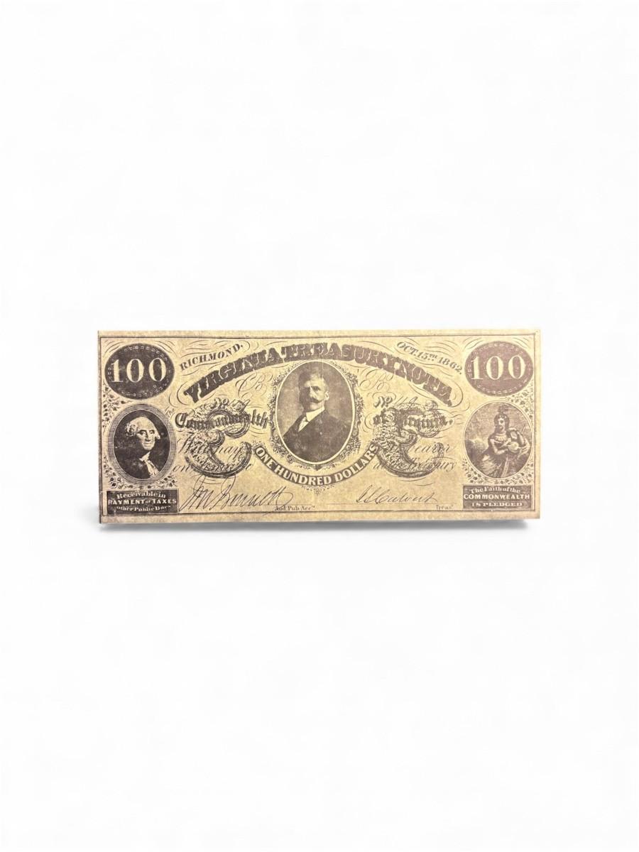 CSA $100 Banknote Currency reproduction 1862 Virginia Treasury Note, Faith of the Commonwealth, Confederate States of America, Civil War Confederacy era Money for Collectors & Educational Purposes