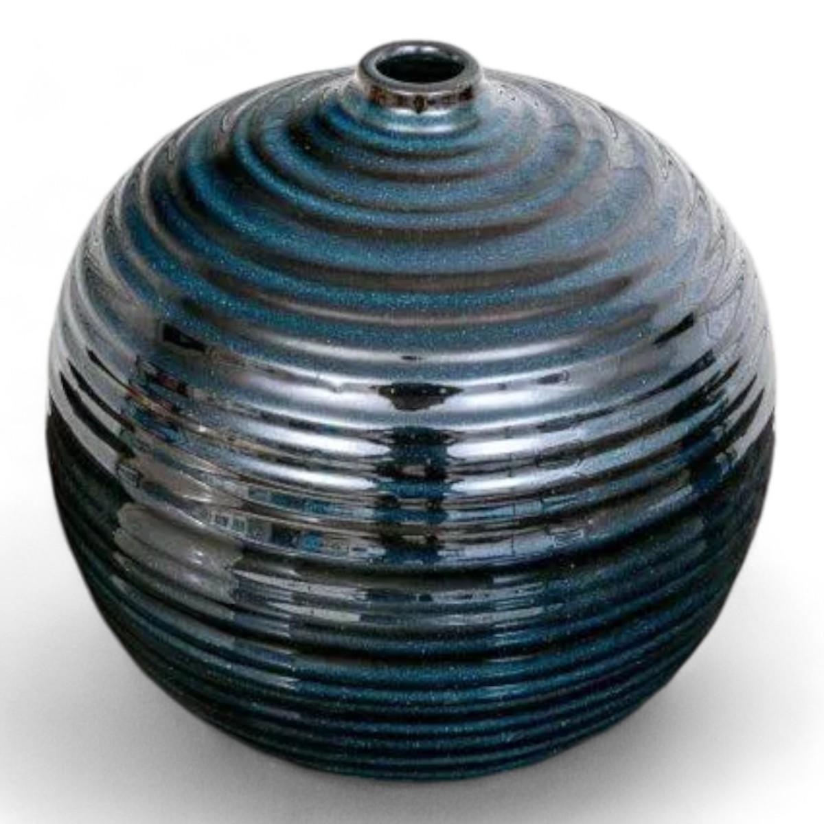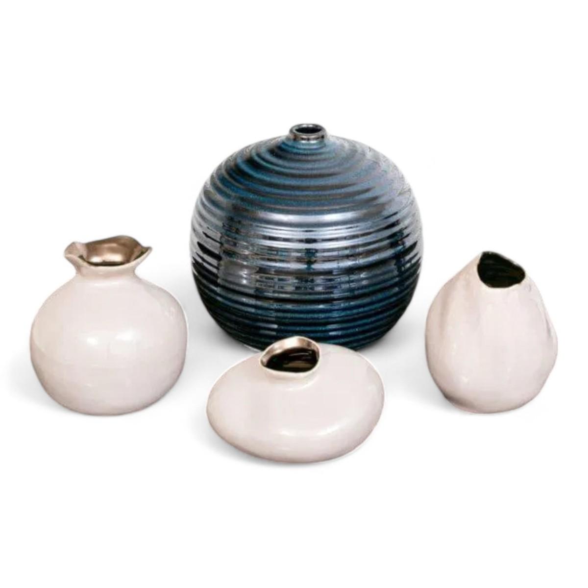 Design Features: This decorative grouping includes four glazed ceramic vases: A tall globular form bud vase with a ribbed blue glazed finish