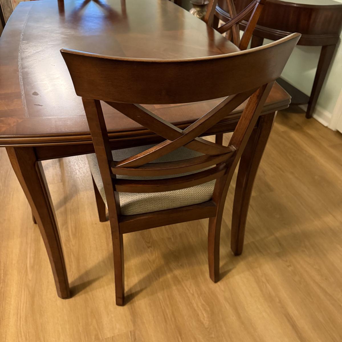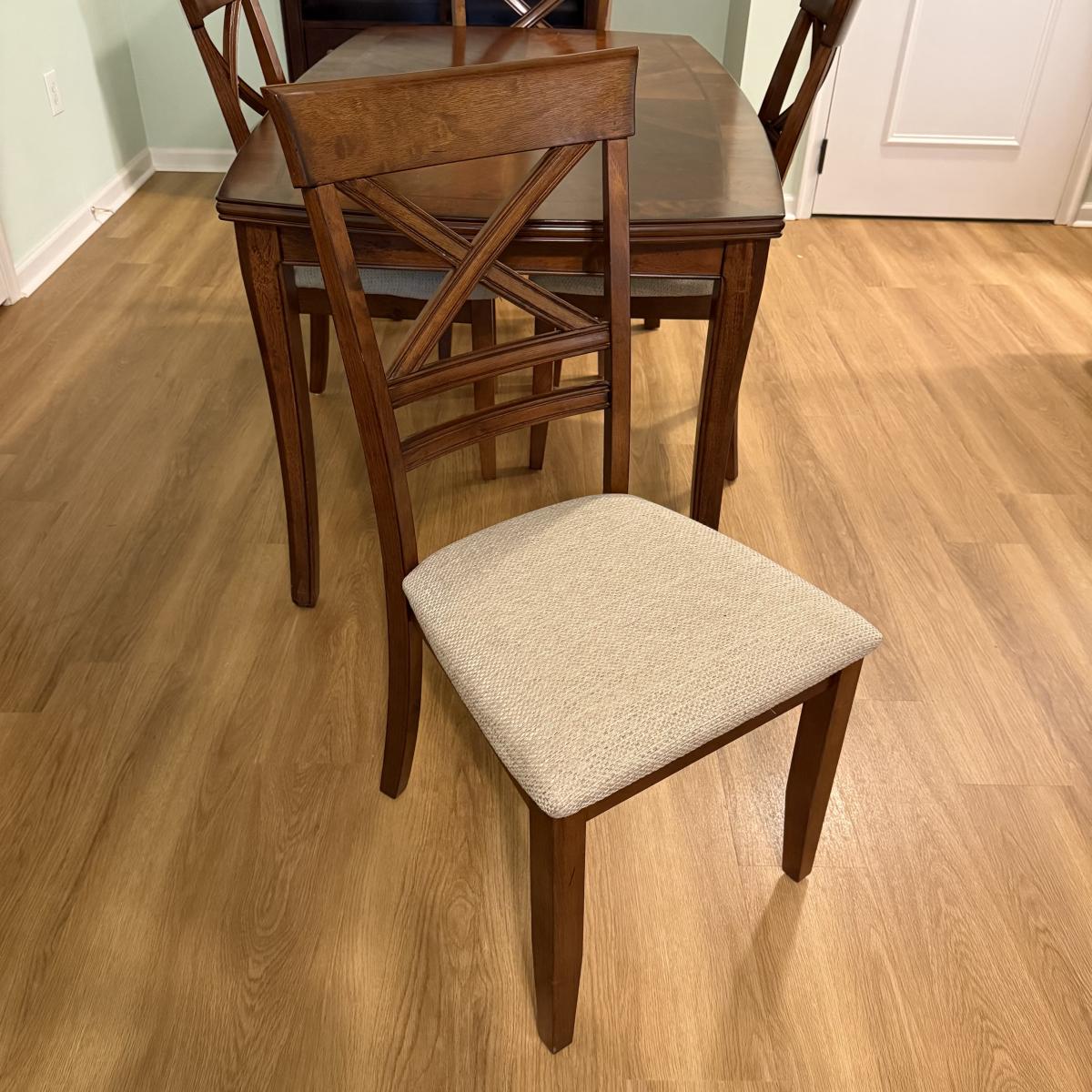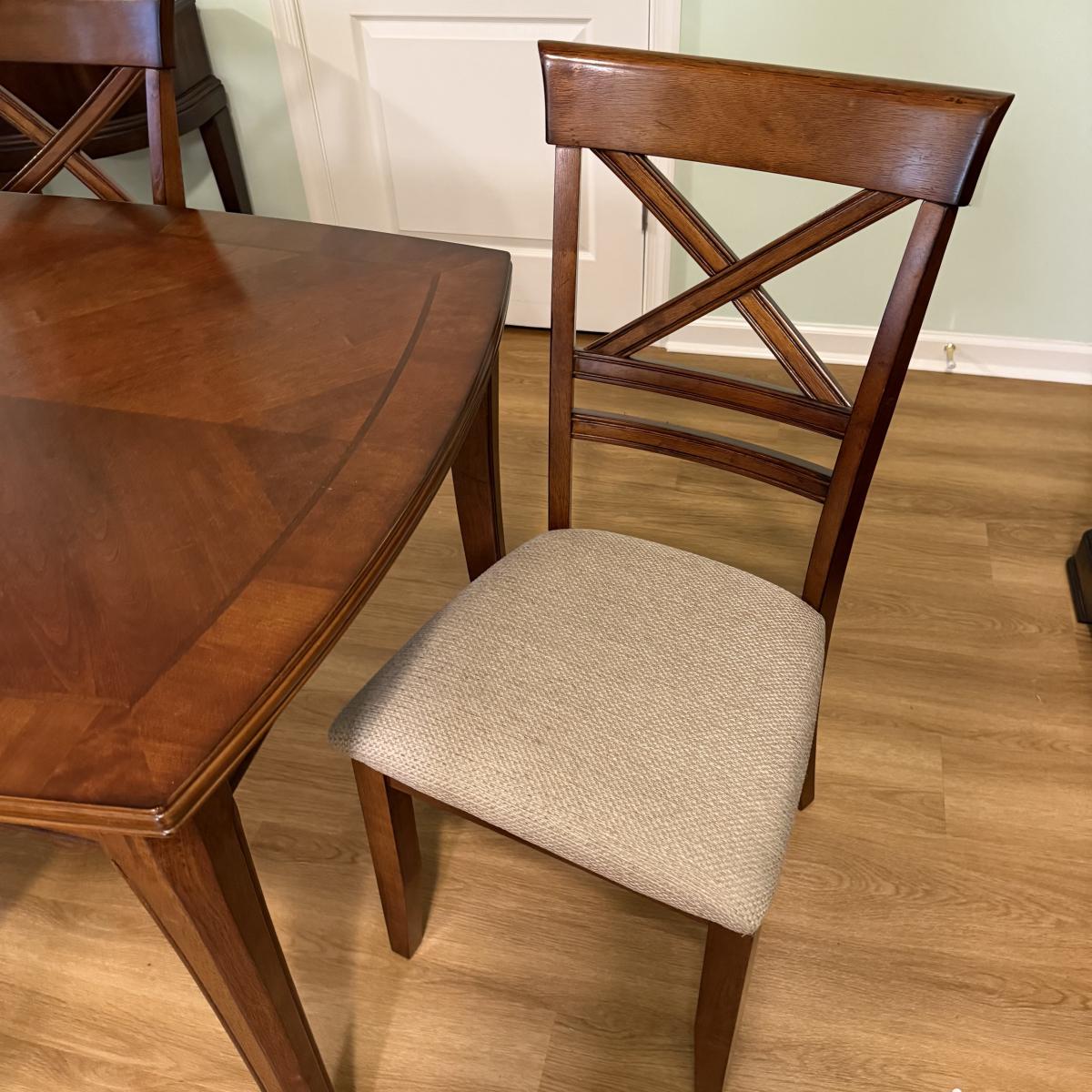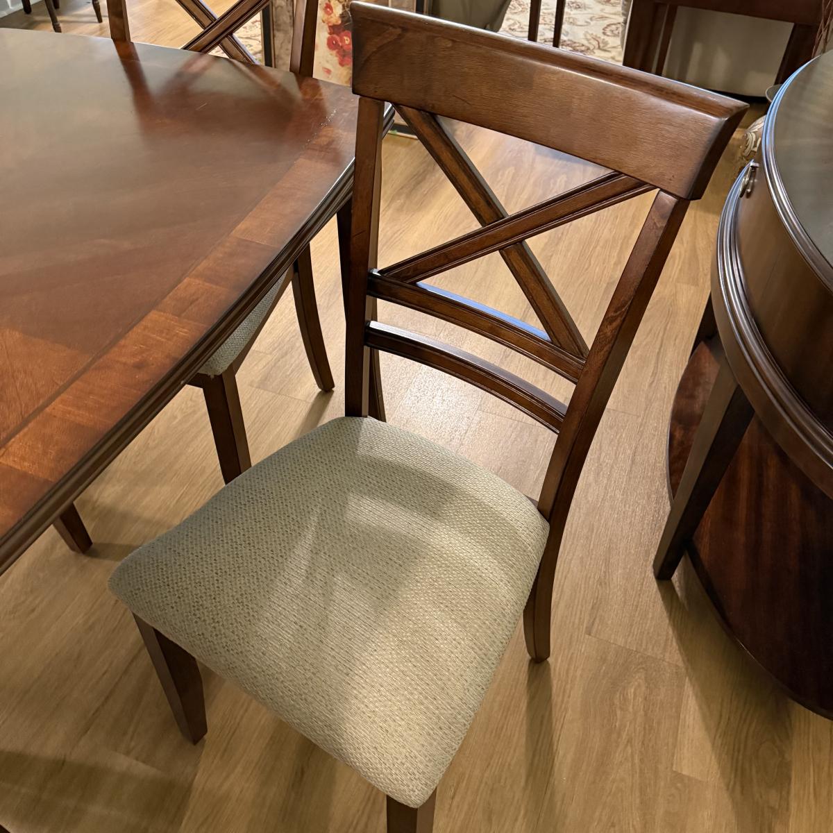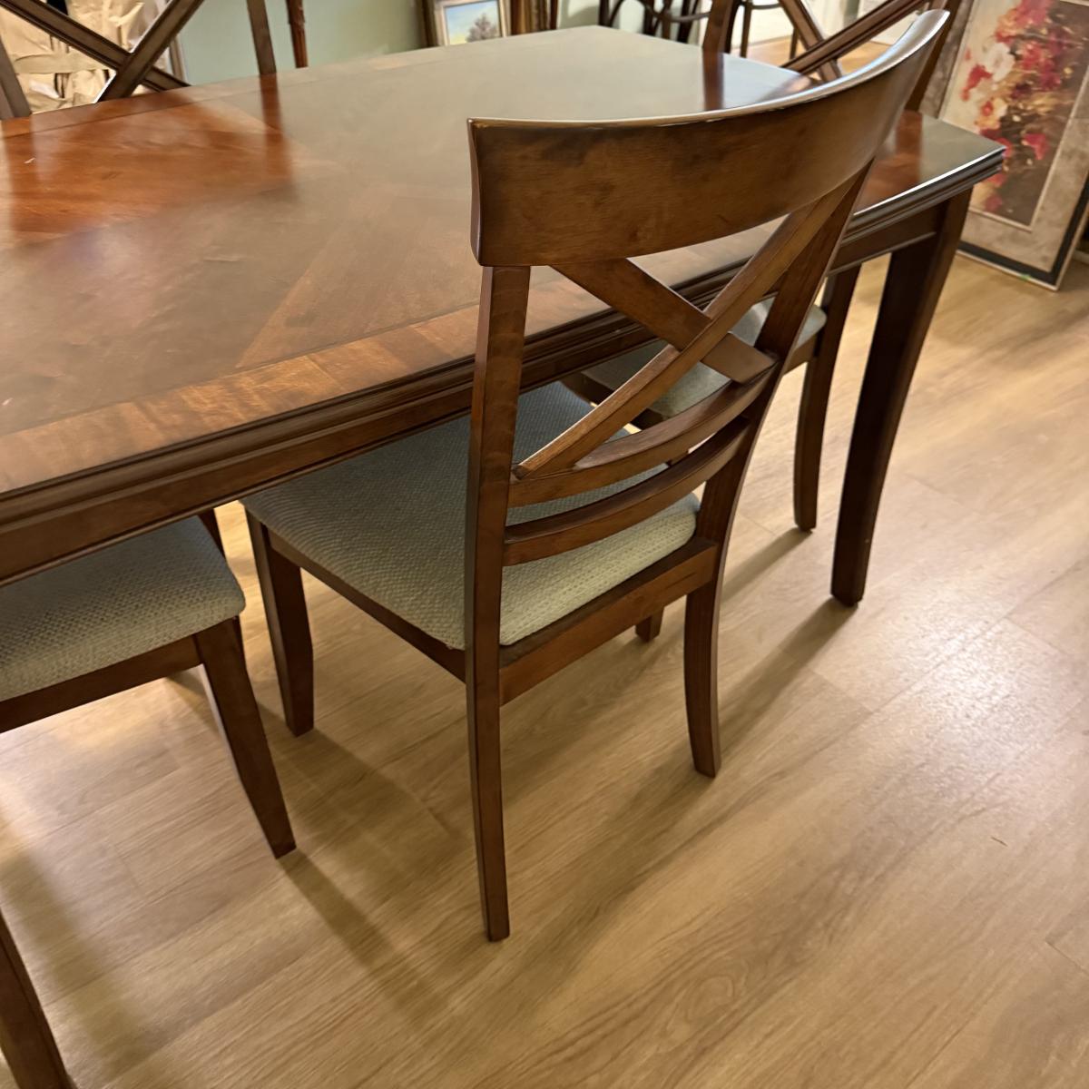 Lovely inlaid dining table with four chairs. Table is 60” x 36” x 30.25”H. Slight imperfections seen on the surface. Four cross back wood upholstered chairs individually measure 18.5” x 18” x 38.75”H with an 18.5” seat height. Upholstery is a linen color.