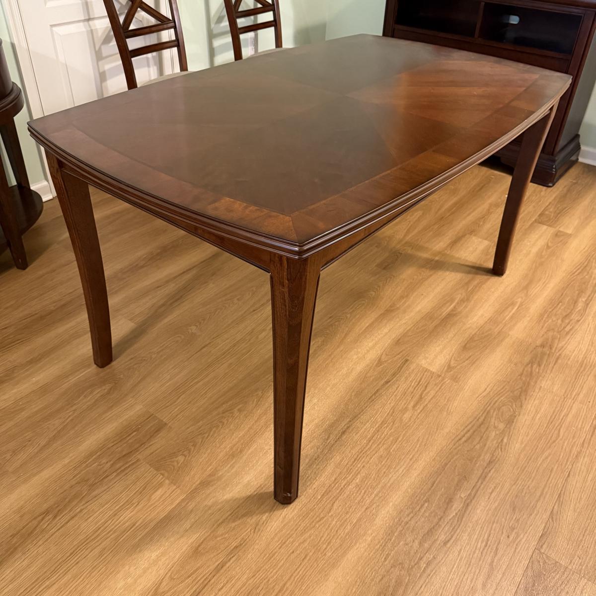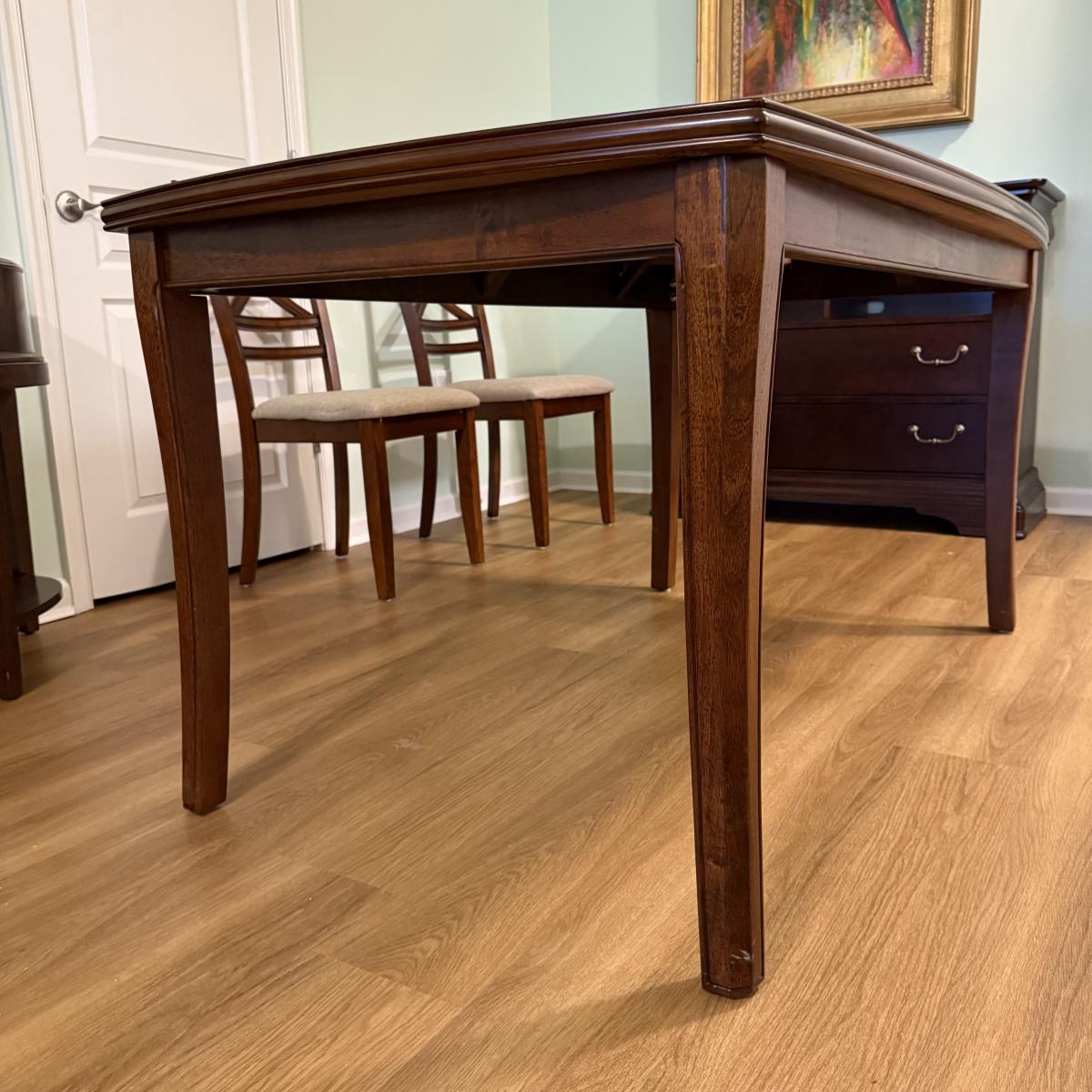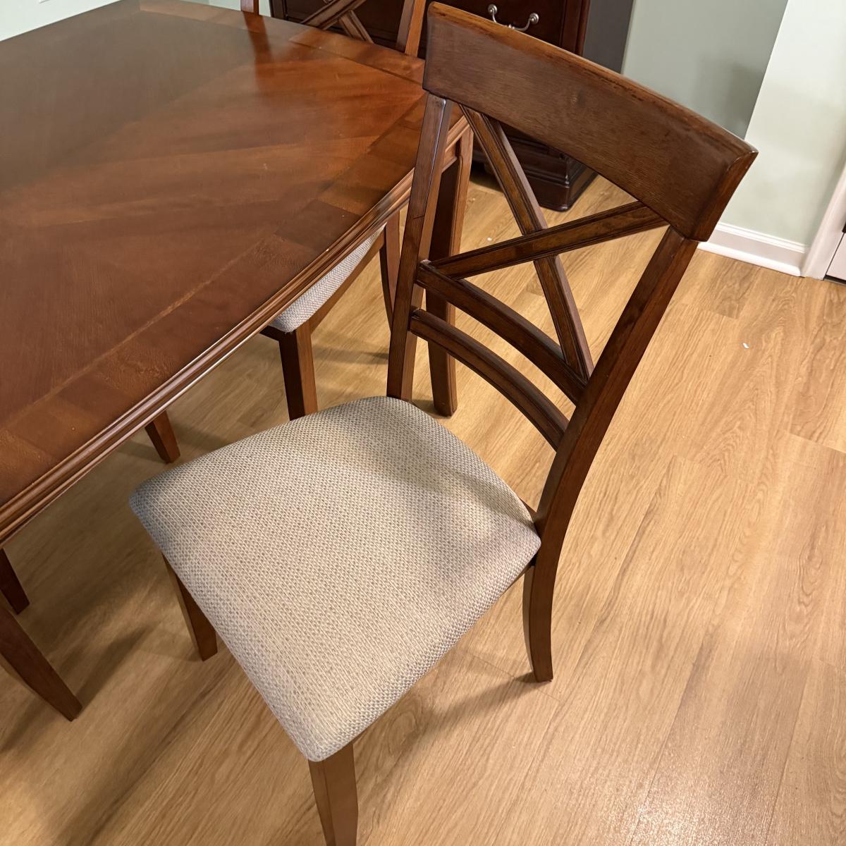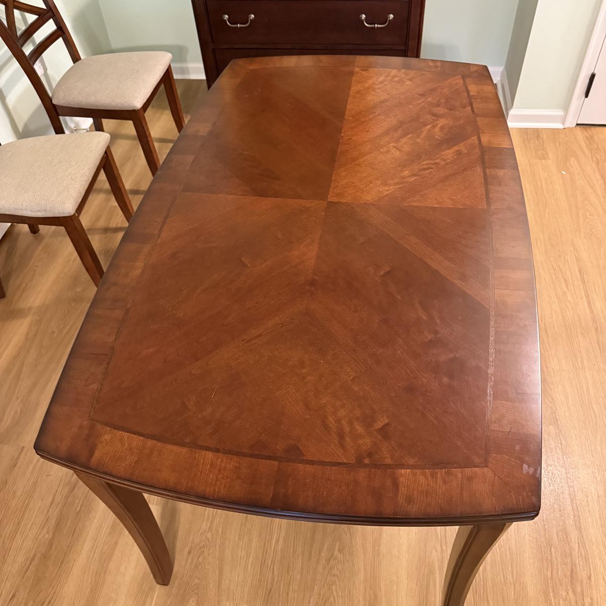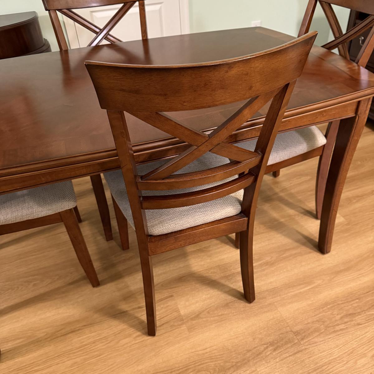 Lovely inlaid dining table with four chairs. Table is 60” x 36” x 30.25”H. Slight imperfections seen on the surface. Four cross back wood upholstered chairs individually measure 18.5” x 18” x 38.75”H with an 18.5” seat height. Upholstery is a linen color.