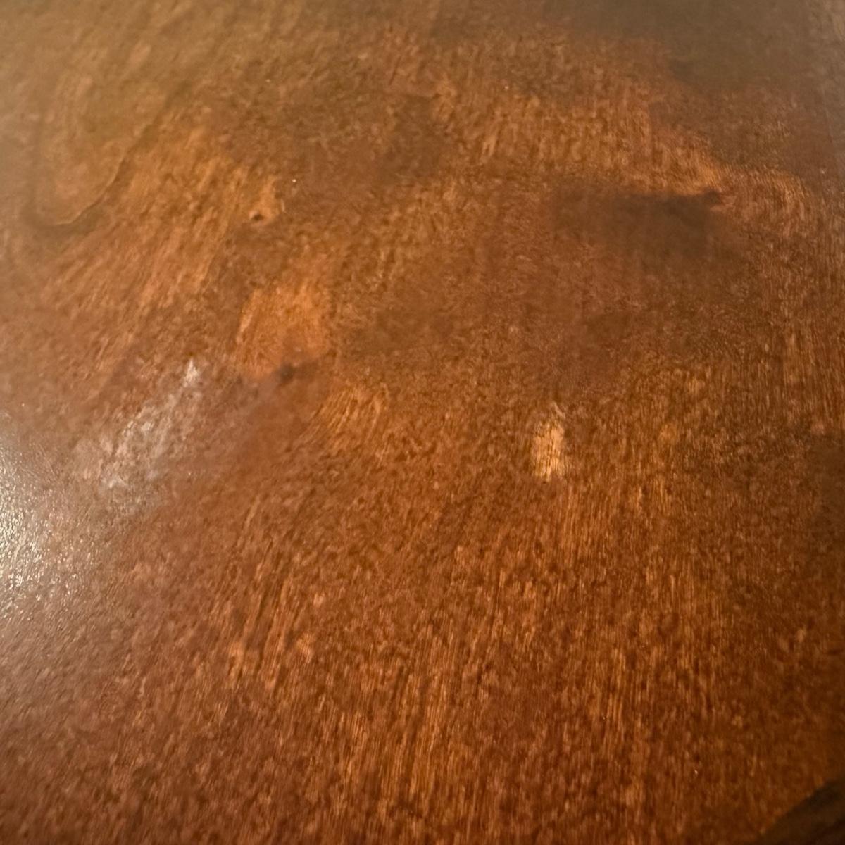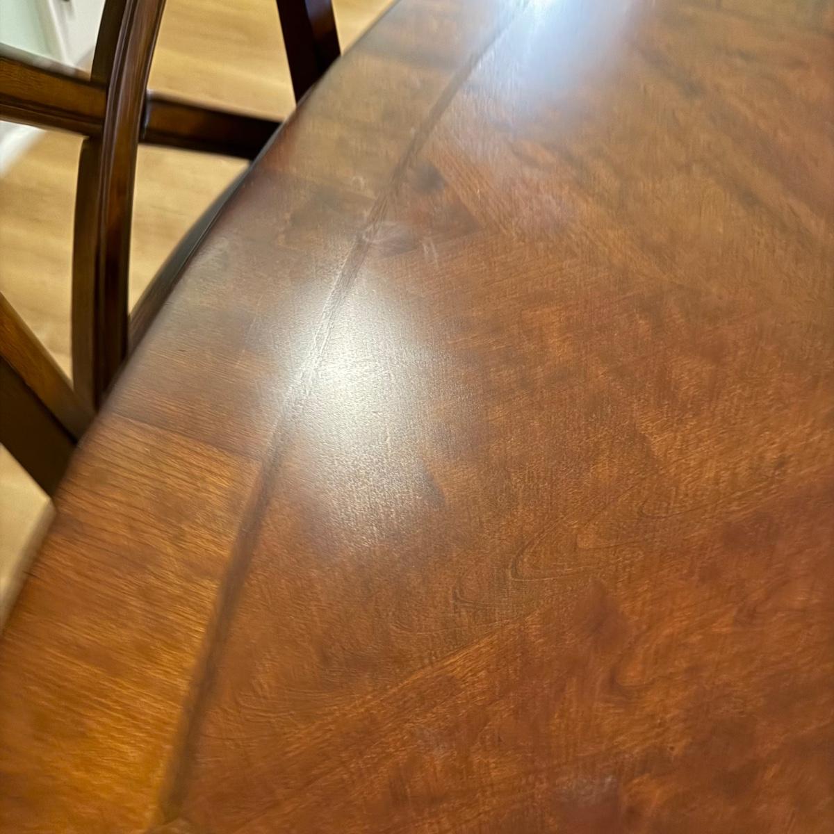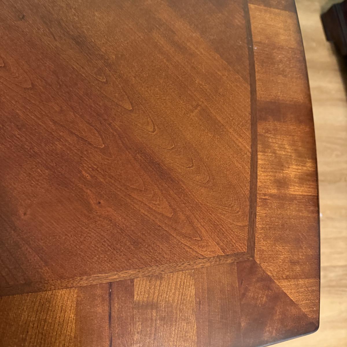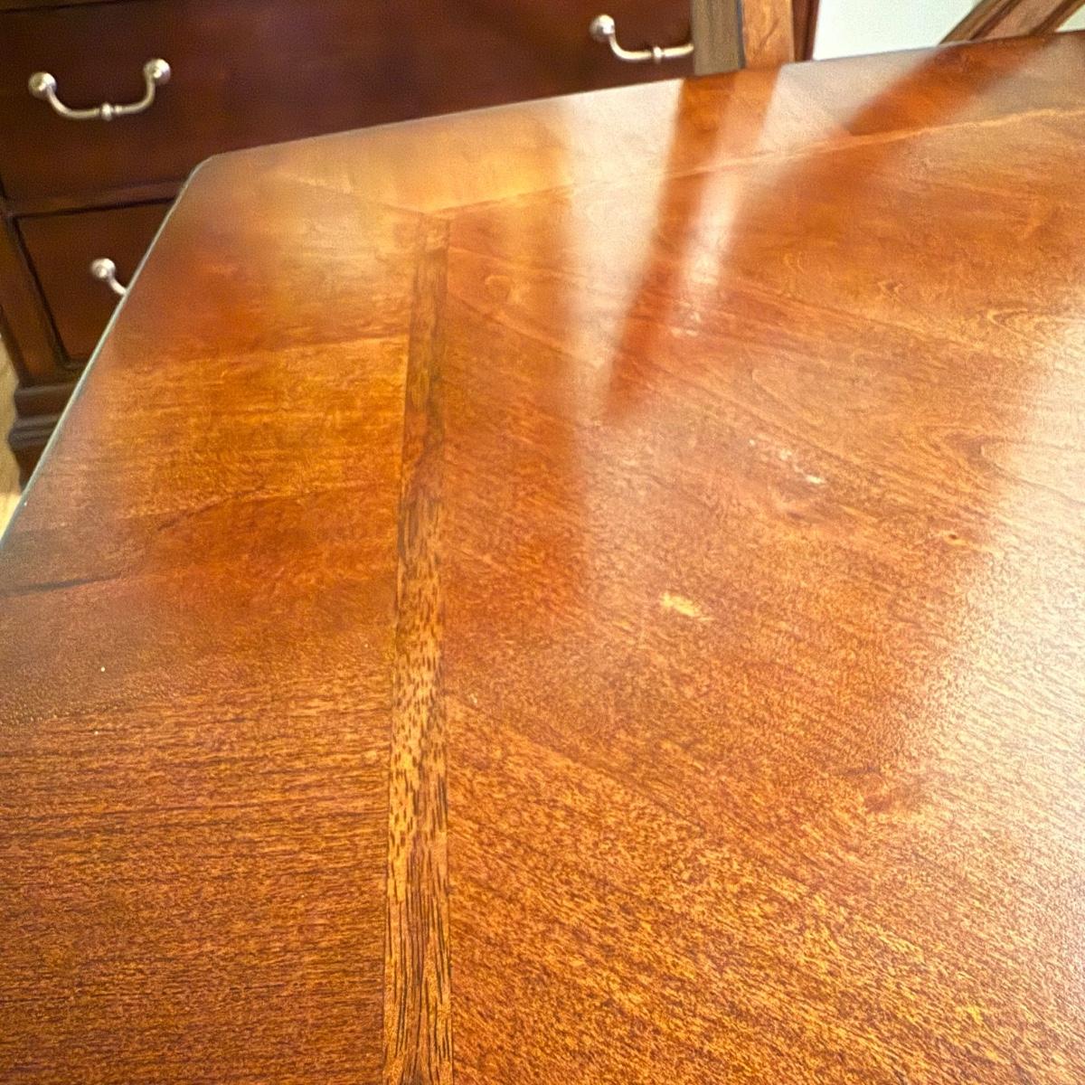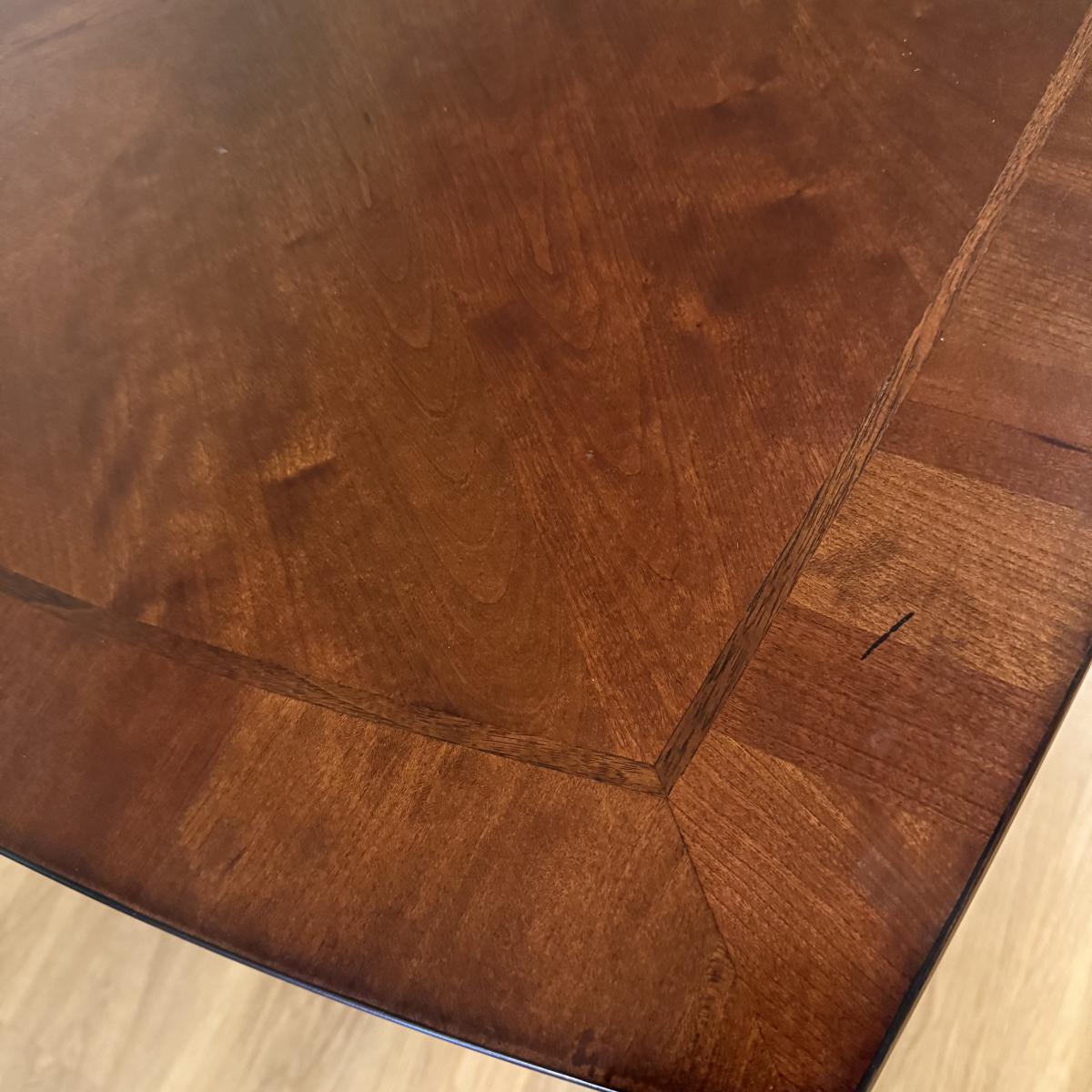Lovely inlaid dining table with four chairs. Table is 60” x 36” x 30.25”H. Slight imperfections seen on the surface. Four cross back wood upholstered chairs individually measure 18.5” x 18” x 38.75”H with an 18.5” seat height. Upholstery is a linen color.