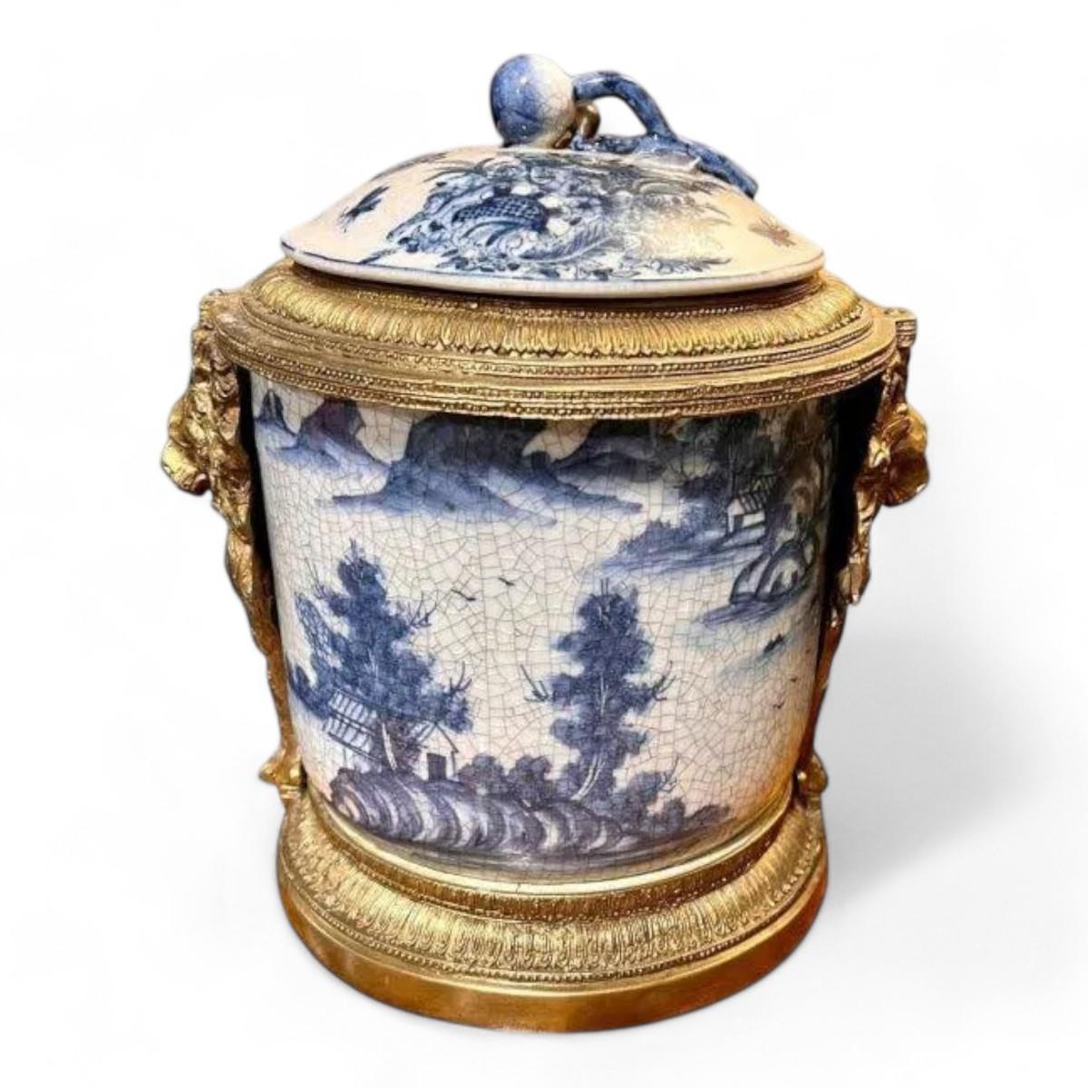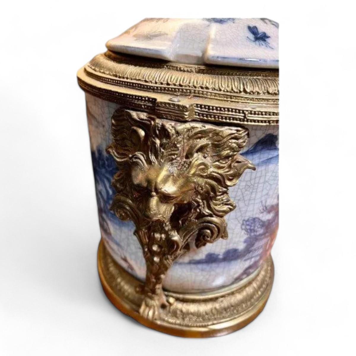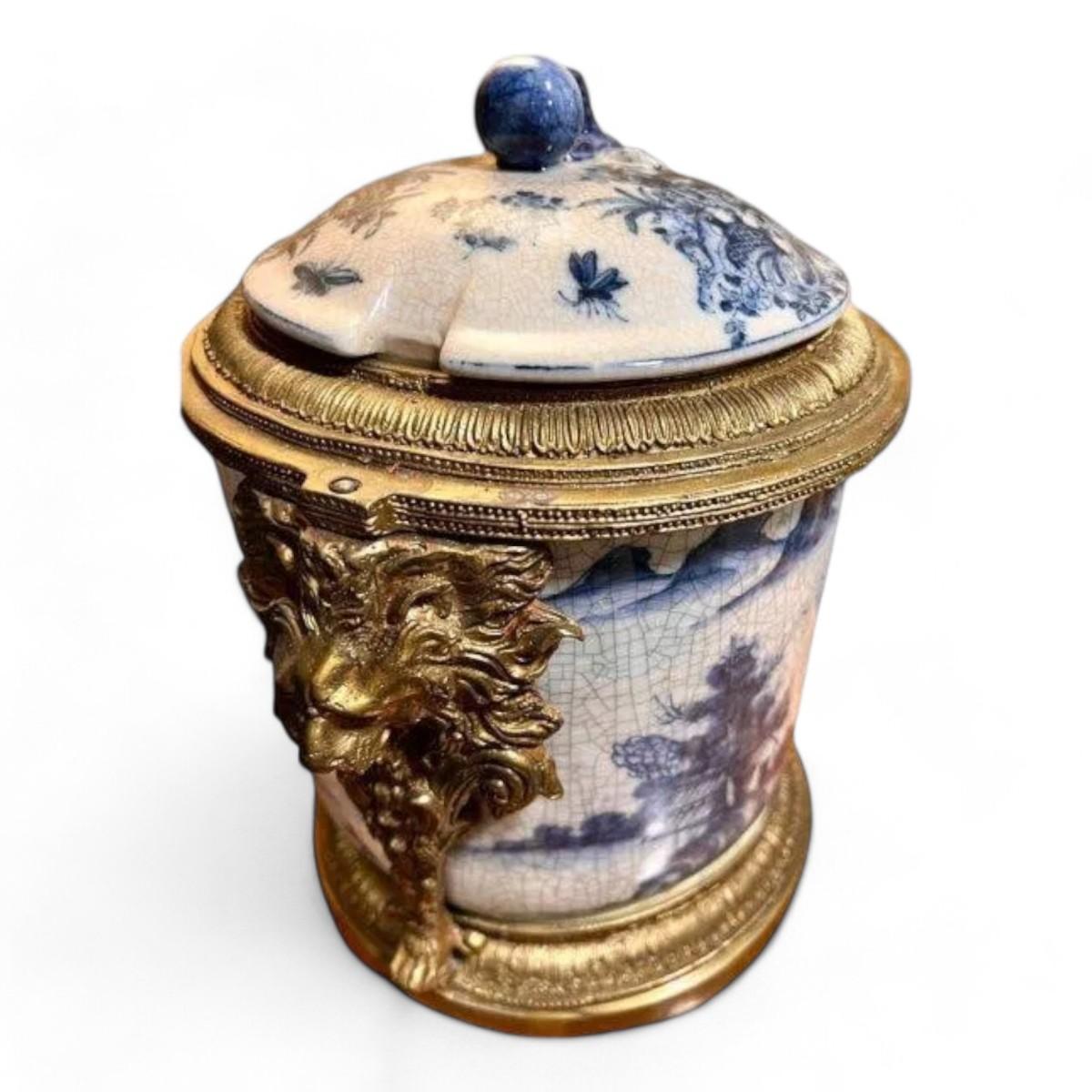 Design Features: This vintage Asian style cache pot from United Wilson is adorned with beautiful blue and white porcelain featuring impressive brass lion handles on the sides. The bronze top and bottom add to its elegant design making it a standout piece for any decor.