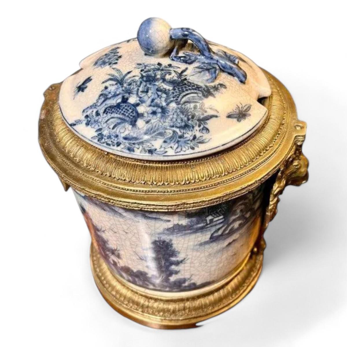 Exquisite United Wilson Blue And White Porcelain Cache Pot With Brass Lion Handles