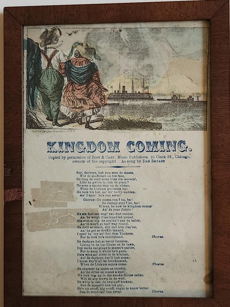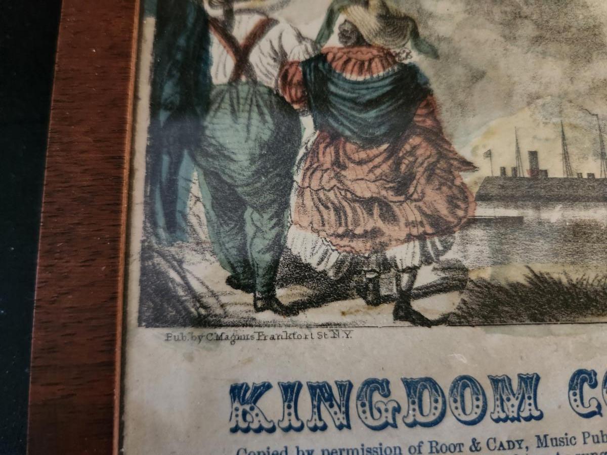 This vintage offeirng is for a Framed Early Chromolithograph by Charles Magnus & Co. of New York circa 1854. of the lyrics of the song "Kingdom Coming". The print shows two folk people, apparently black enslaved or former enslaved persons of the South, standing on the shore looking out toward several Civil War period battleships – one displaying the Stars and Stripes. Condition is rough as someone taped on the verso over several crackings in the paper prior to framing. However, even with that said and noted, it is still an unusual find. Just the upper graphics are worth whatever is paid for this item. Julian Carl (Charles) Magnus (1826-1900) was born in Germany. He emigrated to New York in 1848. He and his publishing firm printed many views and maps, especially of American locations. He also produced letter sheets and song sheets. Magnus items usually sell at major auction houses for between $200 - $400, depending on subject matter and condition. You might get a good bargain here.