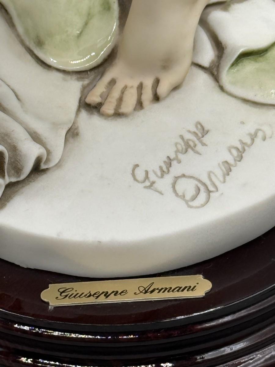 The porcelain figurine depicts a woman in a flowing green dress with doves/