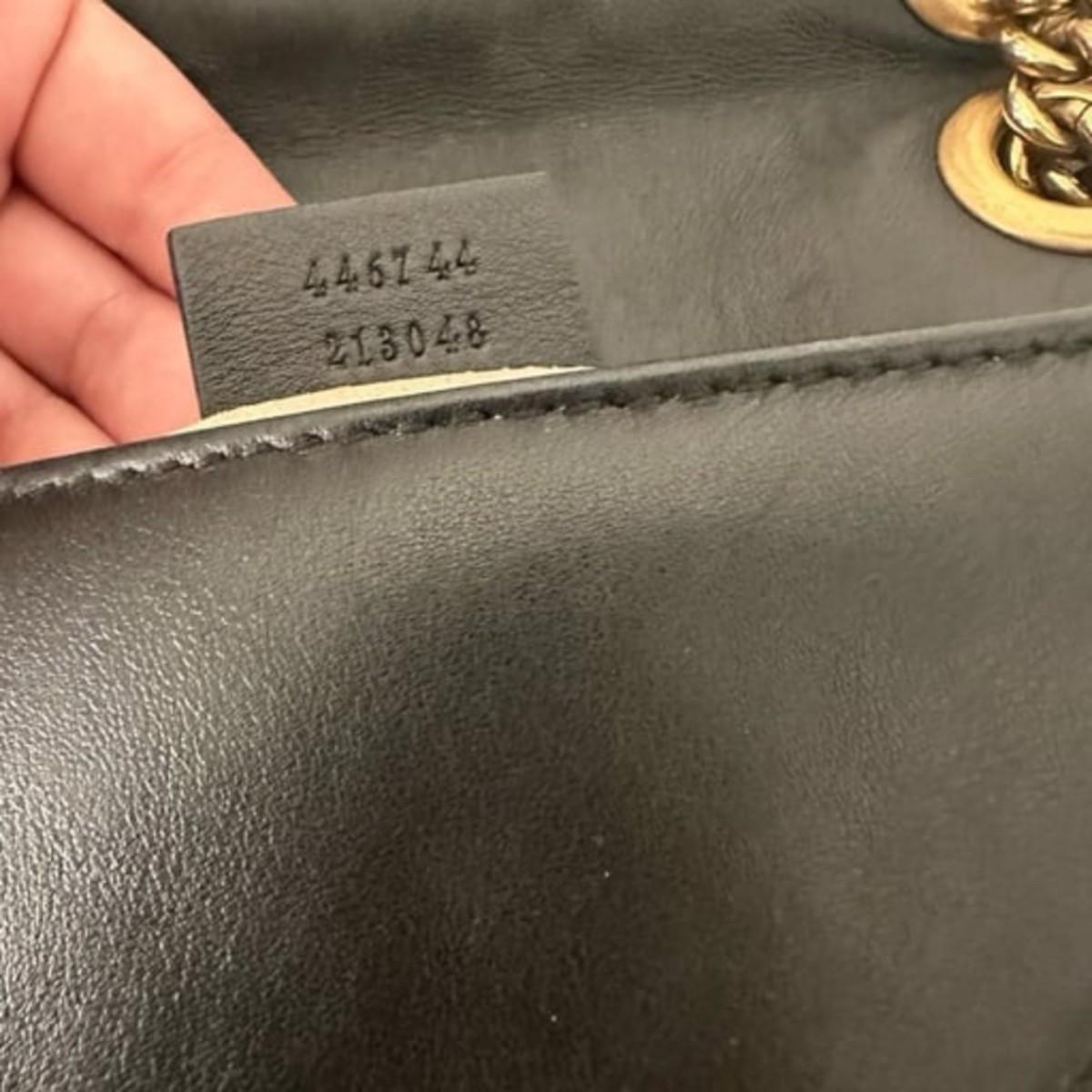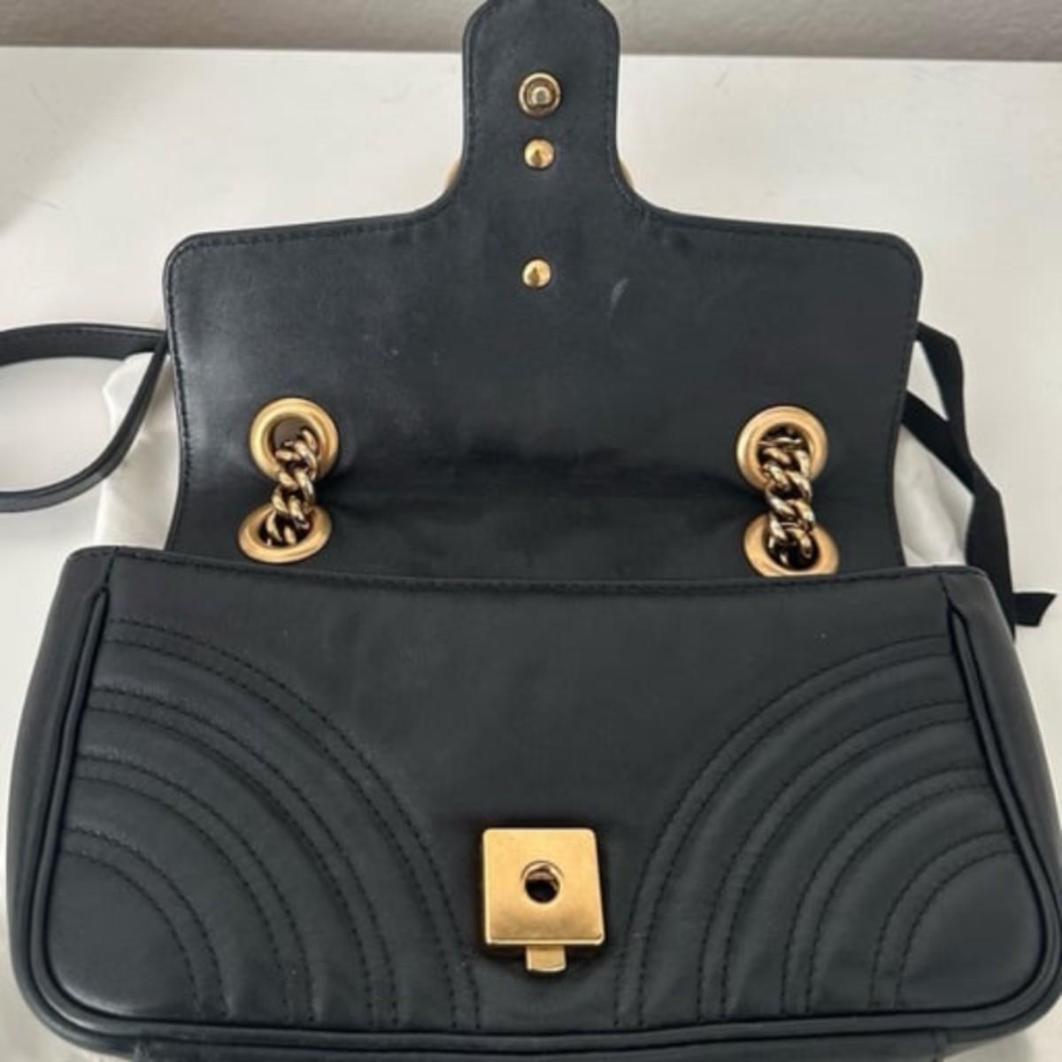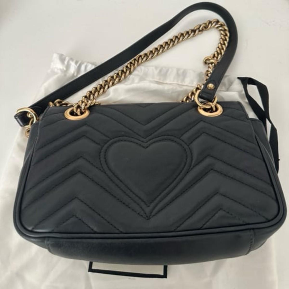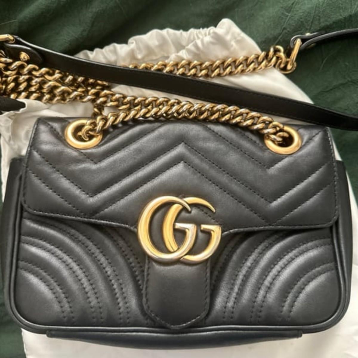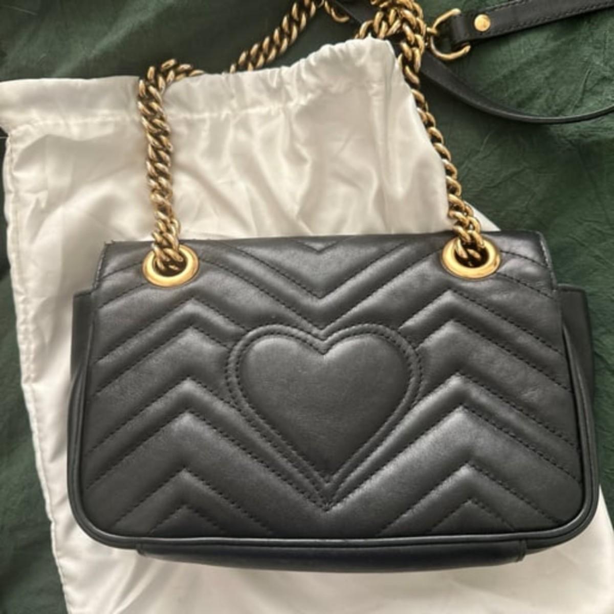 100% Authentic GUCCI Calfskin Matelasse Small GG Marmont Shoulder Bag in Black. -Made of soft calfskin leather in black. This features gold chain shoulder straps, gold hardware, a Gucci GG logo closure, and a stitched heart on the back. The top opens to a beige fabric interior with a pocket. Condition: Good used Interior: Residue marks, creases, scuffs Exterior: slight wear, creases, scuffs, structure wear, faded area(s), smoothing of leather, edge wear, bowed base Handle: Edge wear, creases, scuffs, structure wear Hardware: Scratch(es), plating wear, nick(s) Comes with dust bag and original receipt.