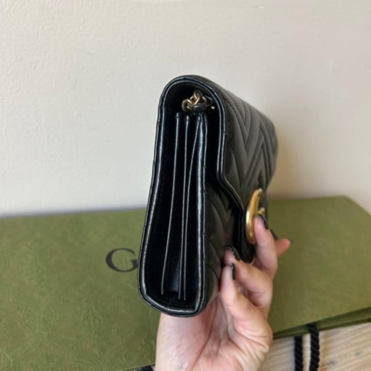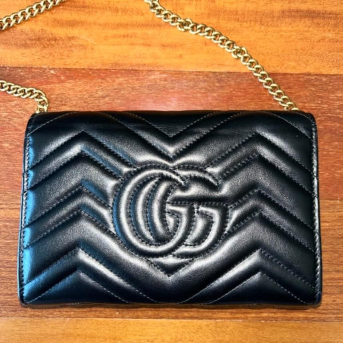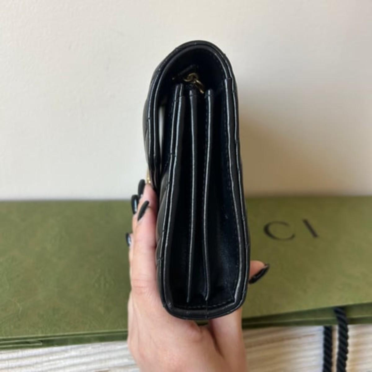 Gucci Clutch Black Leather Double G Logo Antiqued Gold-Tone Hardware Chain-Link Shoulder Strap Nylon Lining & Three Interior Pockets with Card Slots Flap & Snap Closures at Front Used in great condition
