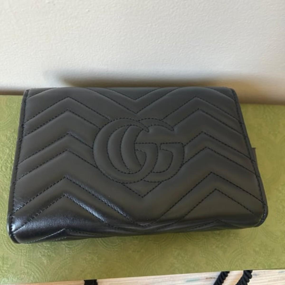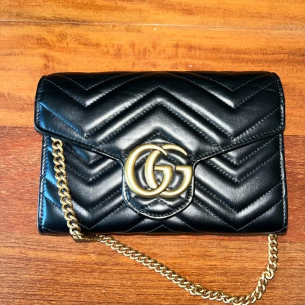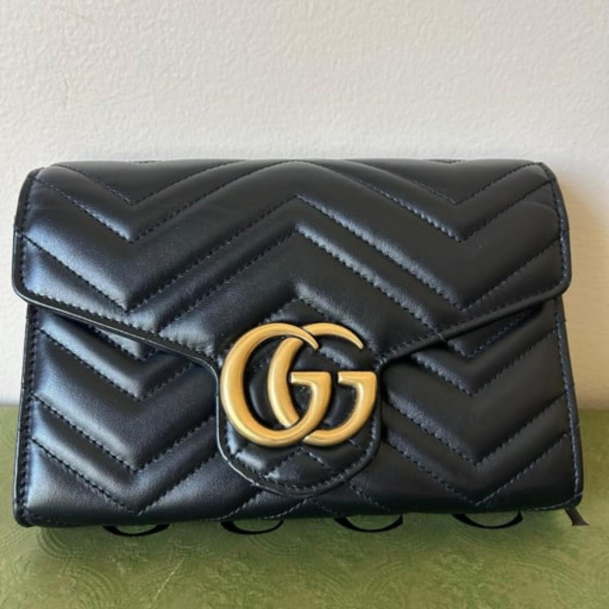 Gucci Clutch Black Leather Double G Logo Antiqued Gold-Tone Hardware Chain-Link Shoulder Strap Nylon Lining & Three Interior Pockets with Card Slots Flap & Snap Closures at Front Used in great condition