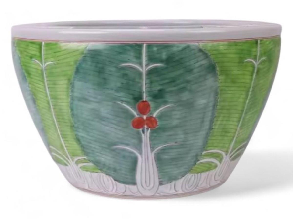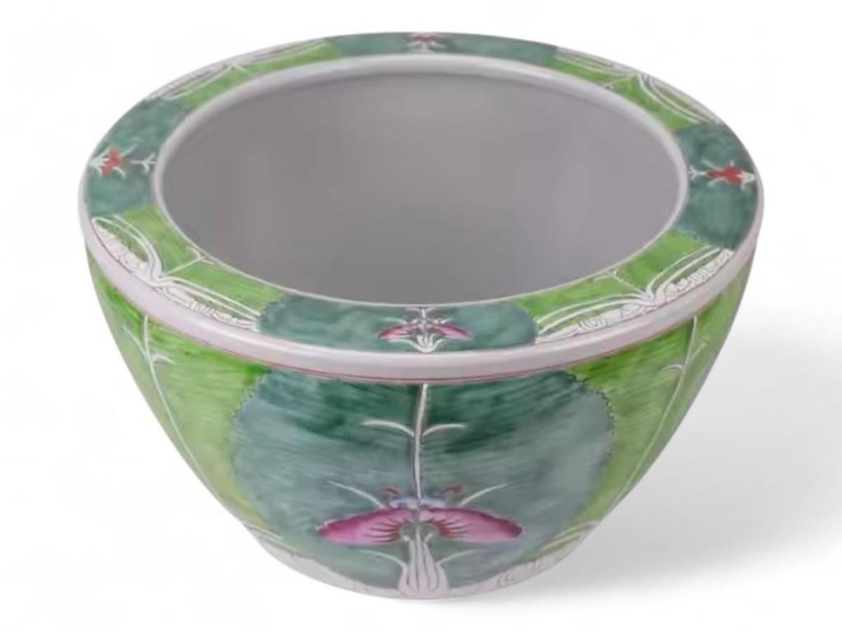 Bring elegance to your decor with this Custom Hand-Painted Chinese Bok Choy Cabbage Leaf Ceramic Fish Bowl Planter, crafted in Jingdezhen, China&#39;s porcelain capital. Featuring intricate hand-painted cabbage leaf designs, this versatile piece is perfect for plants or as a striking indoor accent, blending art and functionality seamlessly.<br /> Dimensions: 16&#34;D x 11&#34;H<br /> ***Allow 8-10 weeks for delivery.***
