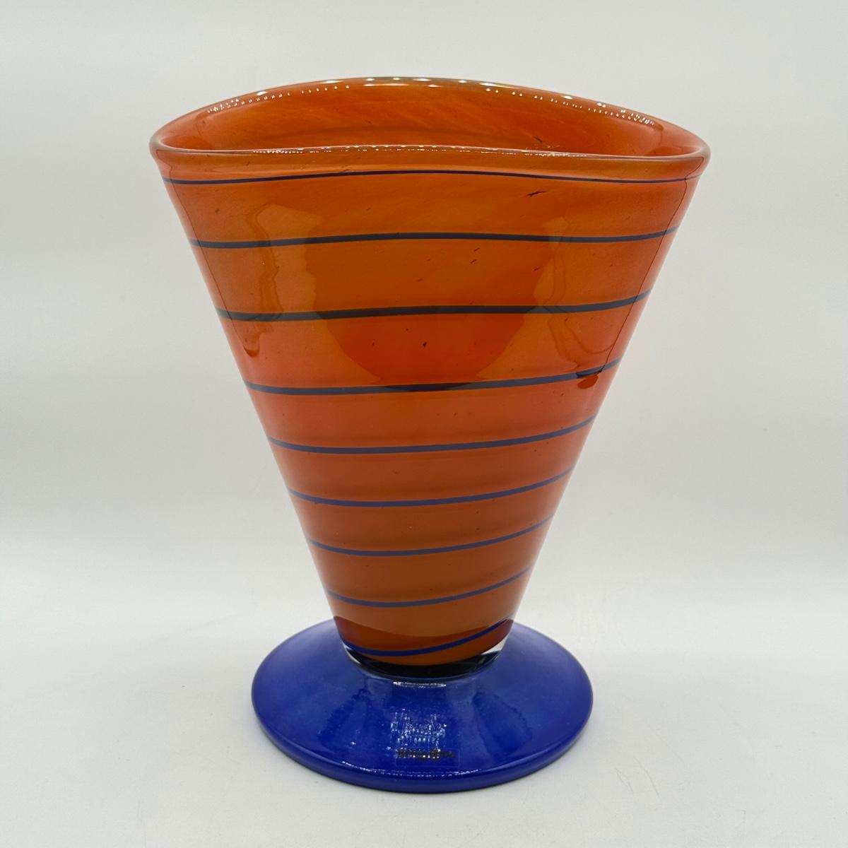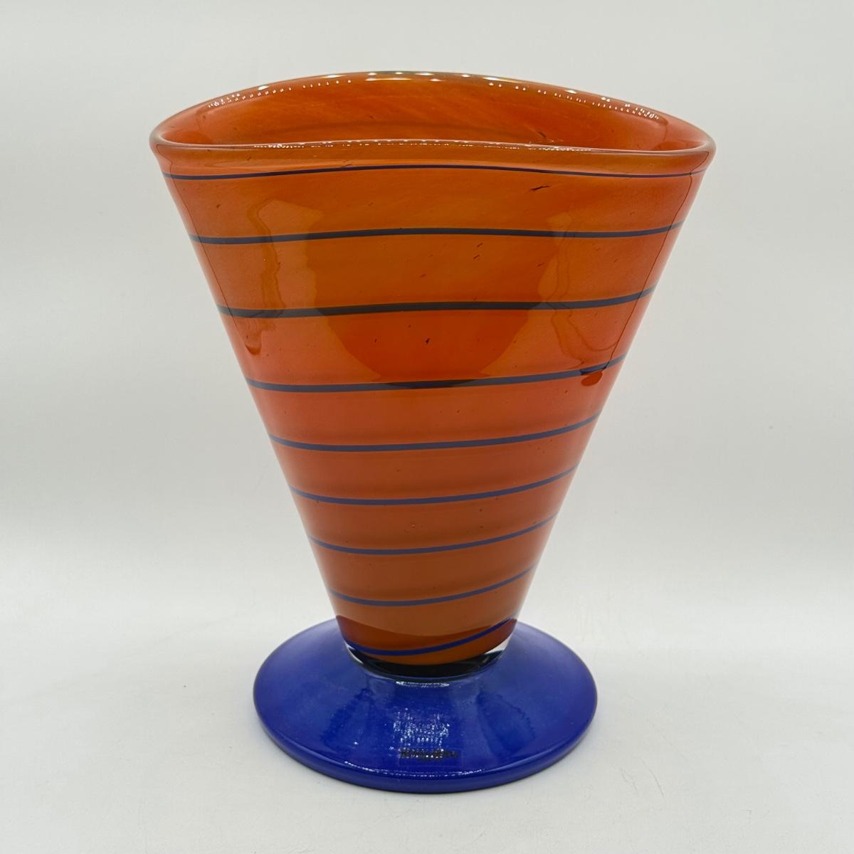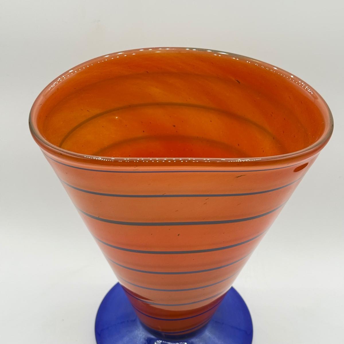 Kosta Boda glass vase in an red/orange color with blue spiral pattern designed by artist Anna Ehrner from her "Epoque" collection (1994).