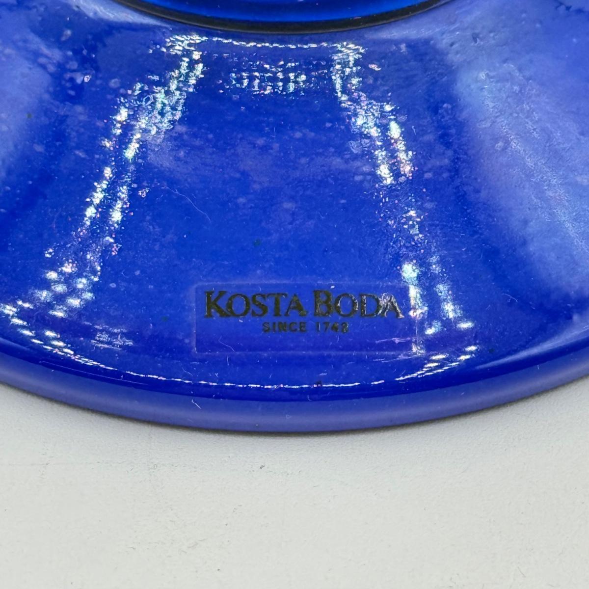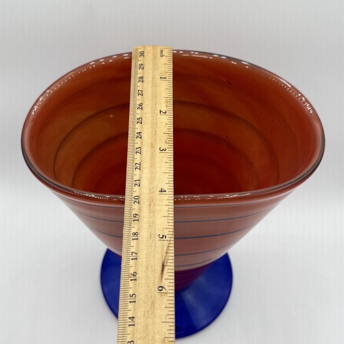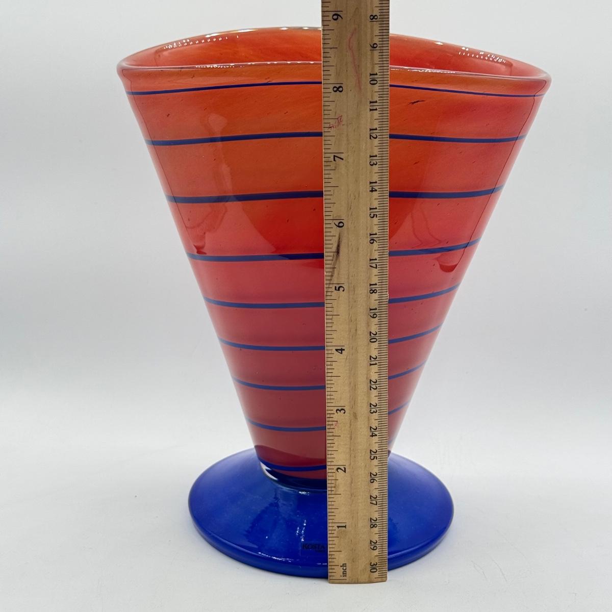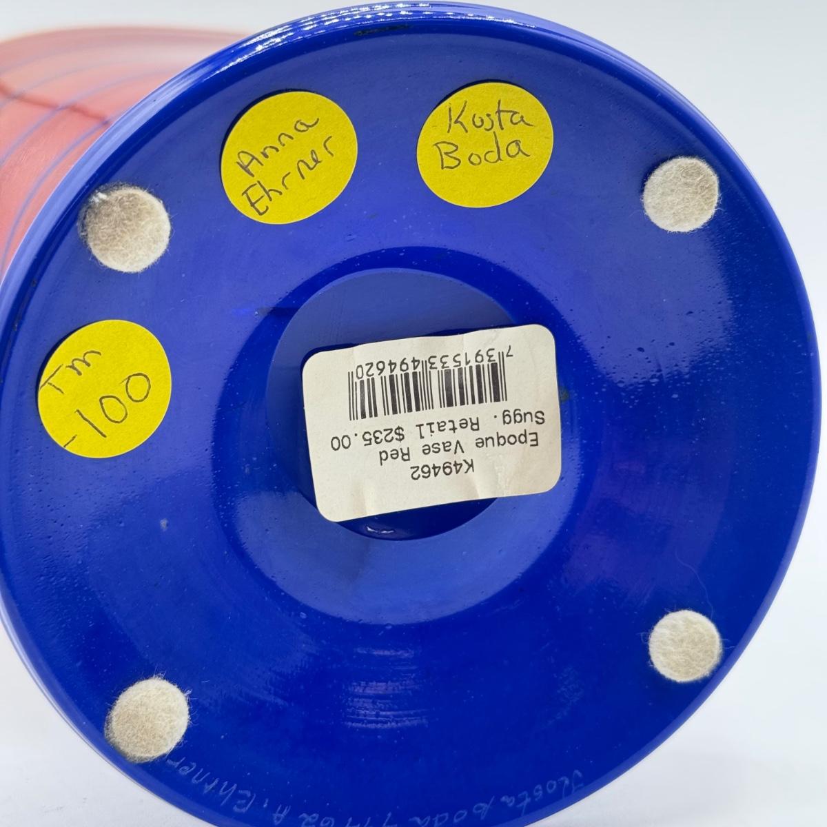 Kosta Boda glass vase in an red/orange color with blue spiral pattern designed by artist Anna Ehrner from her "Epoque" collection (1994).