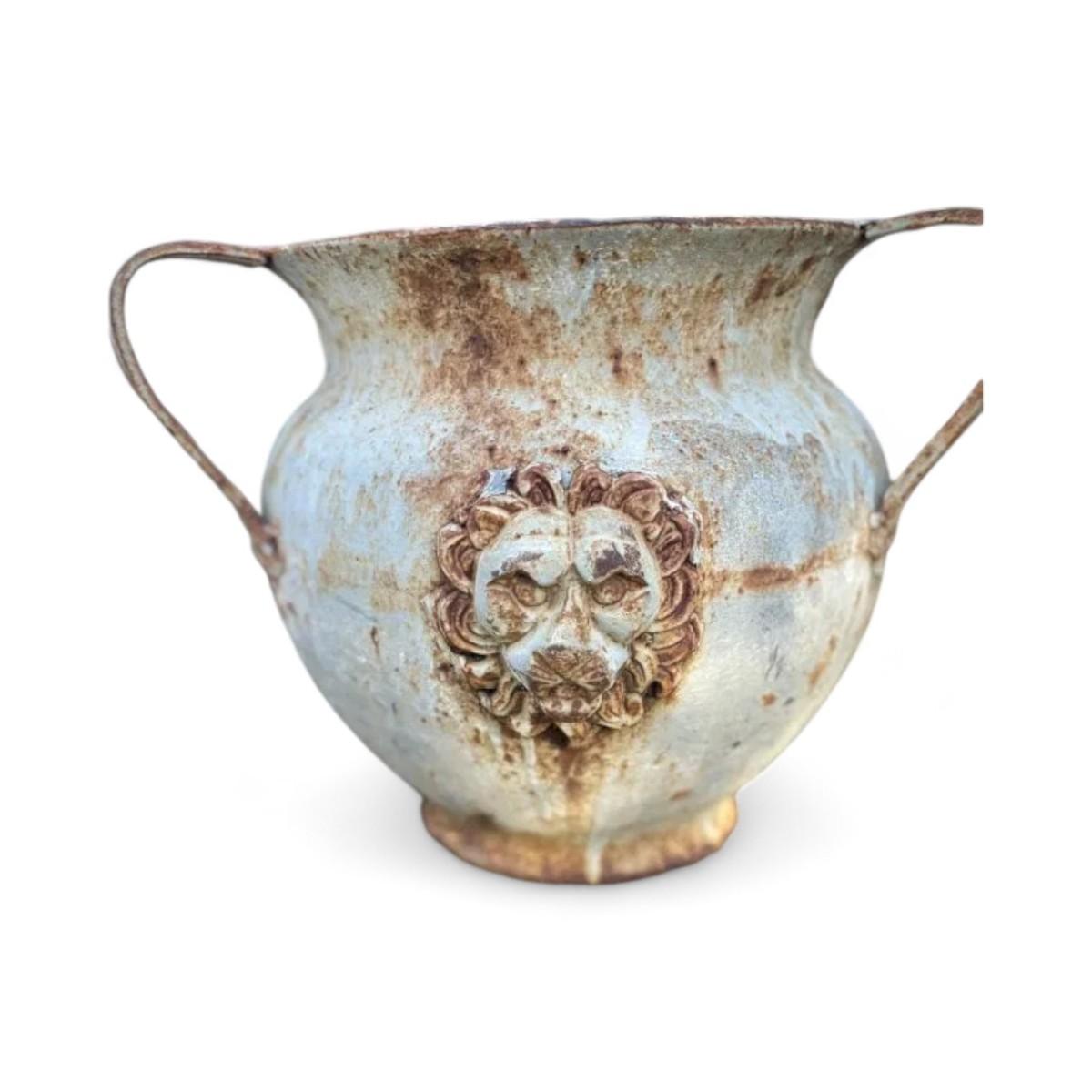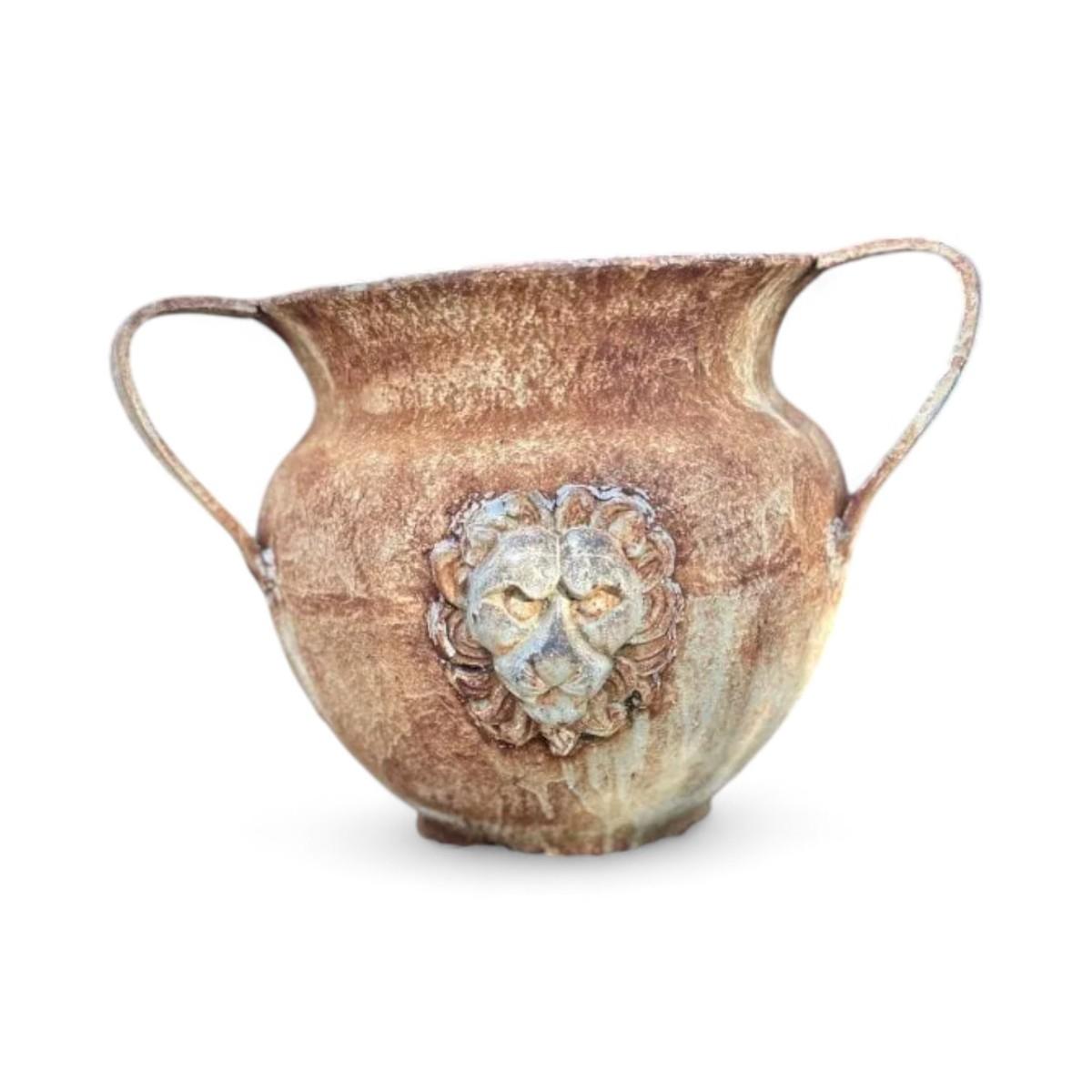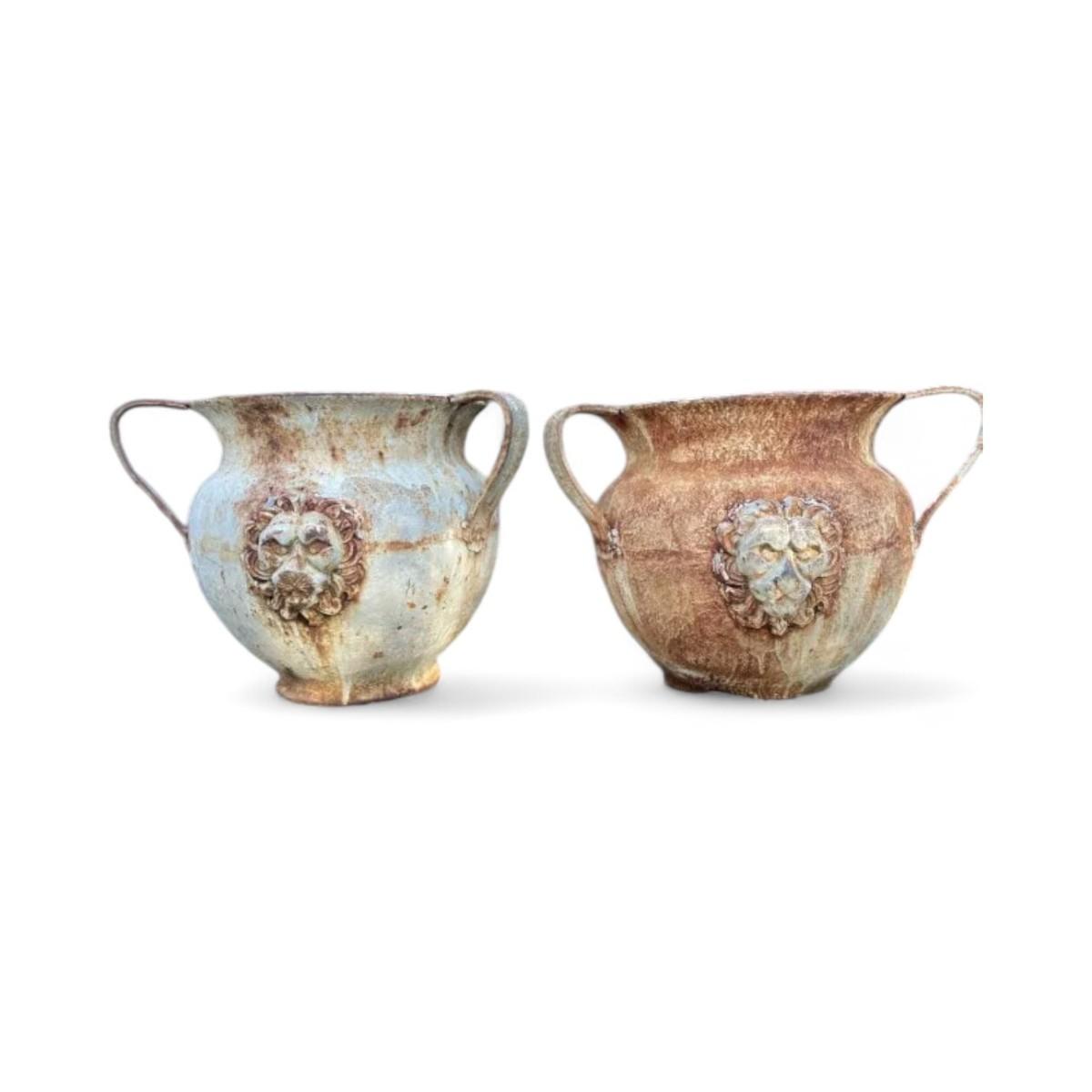 Item Type: UrnsDesign Features: These impressive Italian urns feature striking lion faces and three sturdy handles, exuding a sense of grandeur and classical beauty. The intricate details and vintage design make them perfect statement pieces for any garden or outdoor space.Condition: Good (refer to condition index key) Rust consistent with outdoor use.