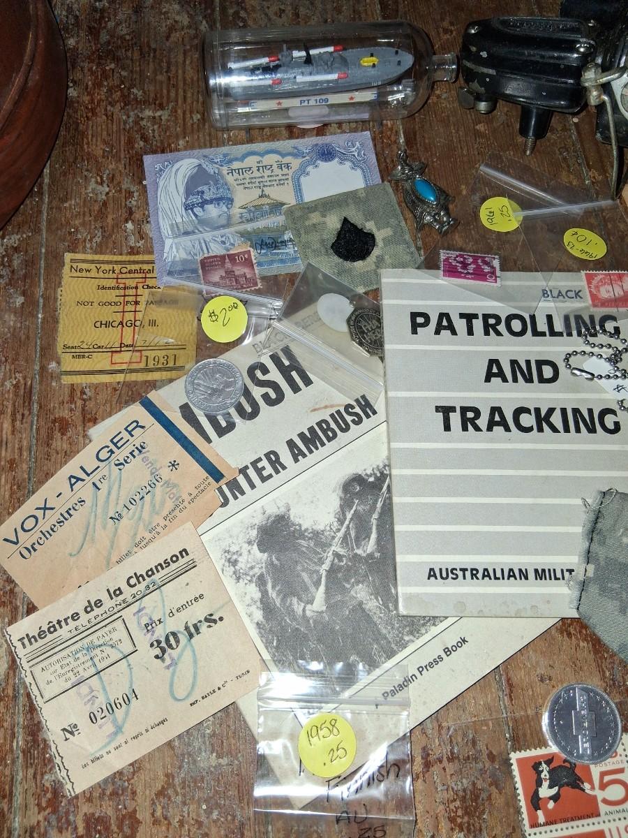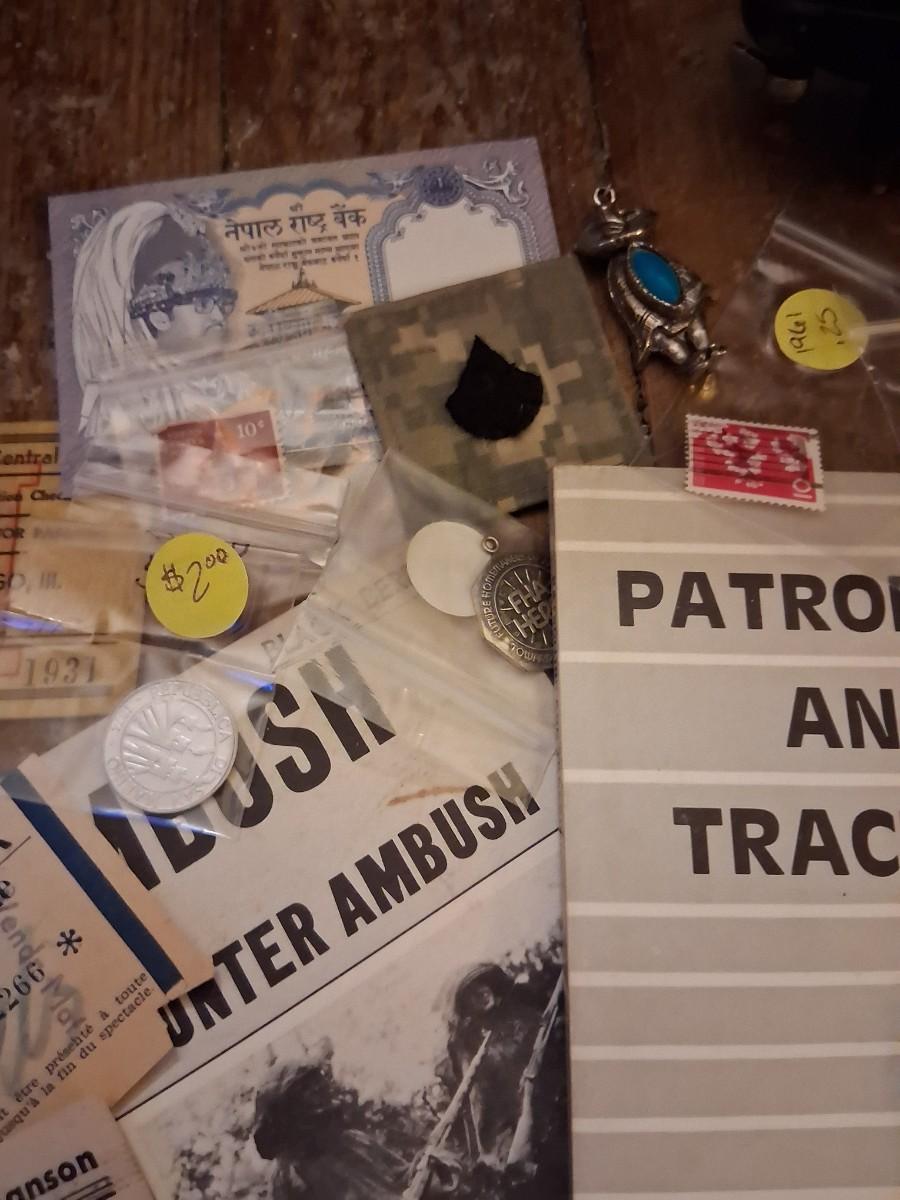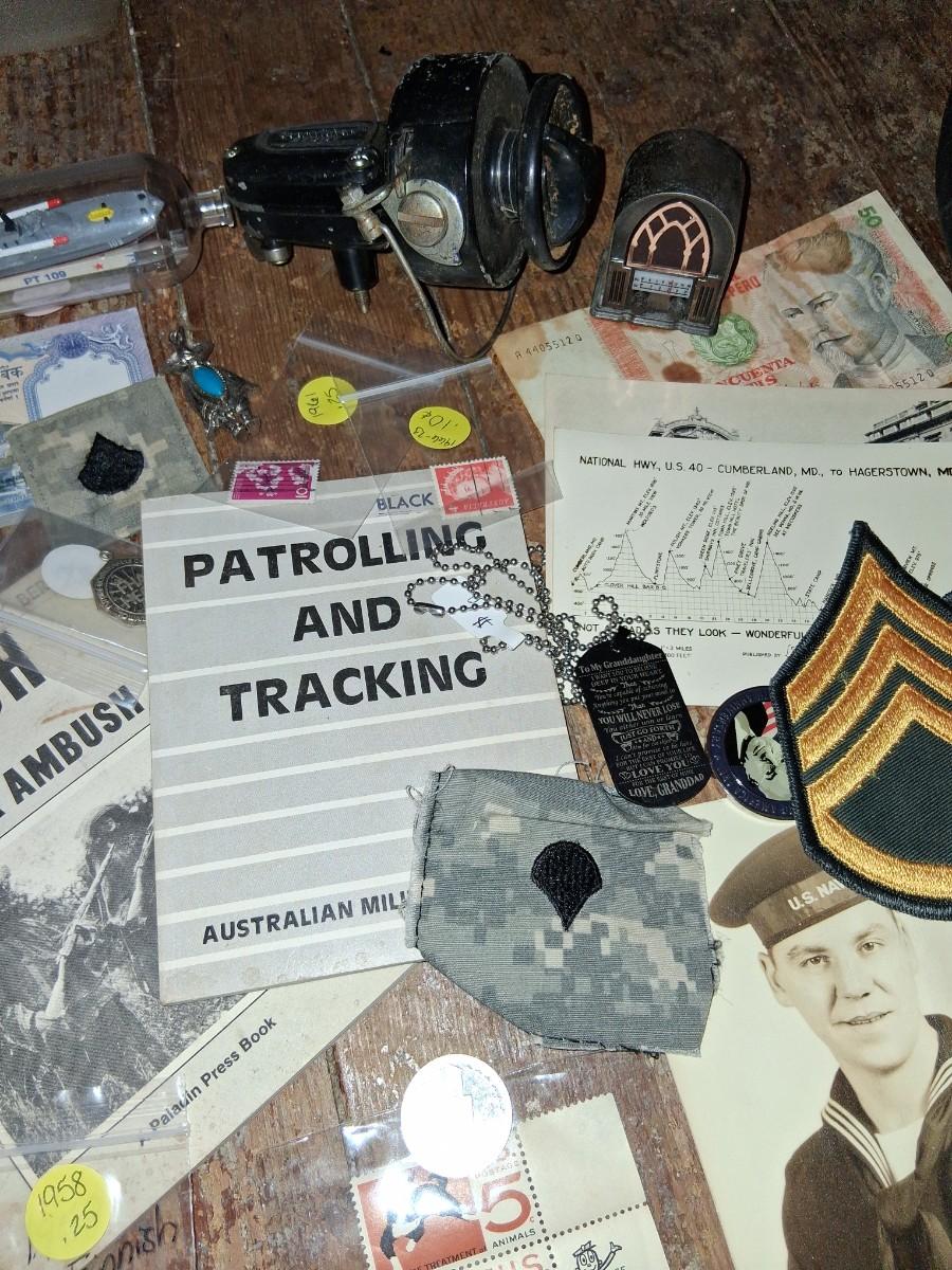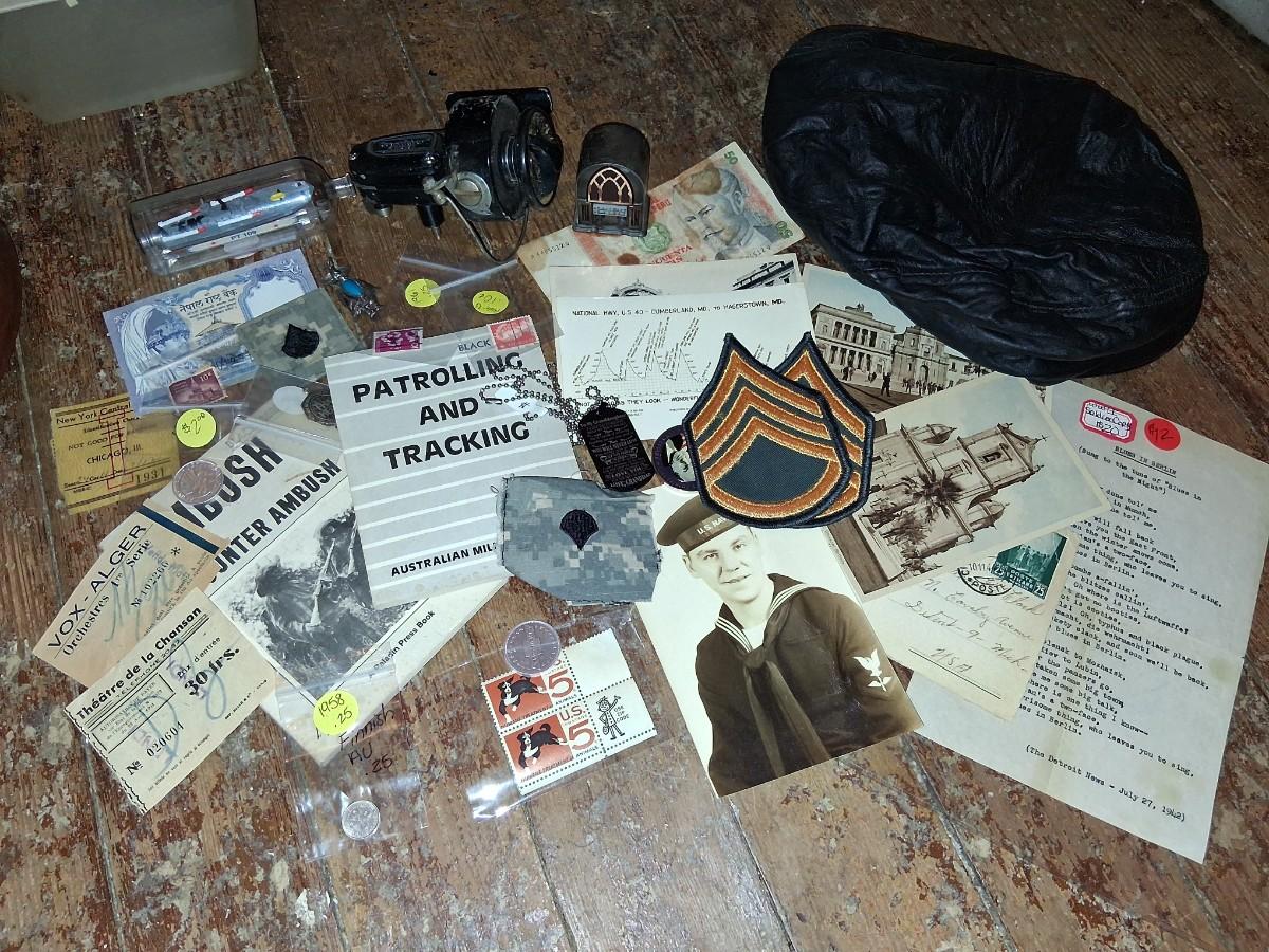 Items Include WWII Soldier carried copies of stories, poems or songs. Patches, Currency, Photos, Postcards, Jewelry, Challenge Coin, Coins, Stamps, Leather Biker Hat, WWII Black Beret Manuals, Micro Machines PT-109 & so much more