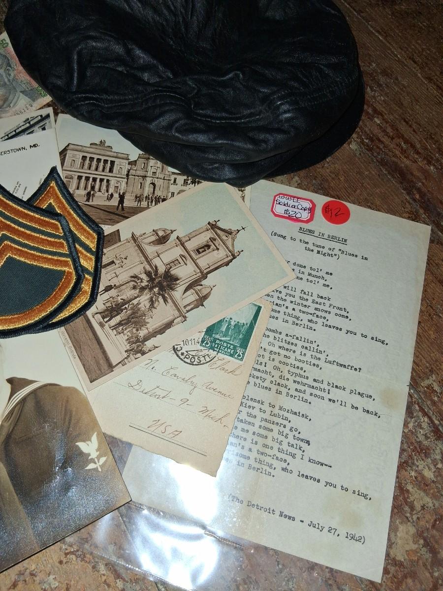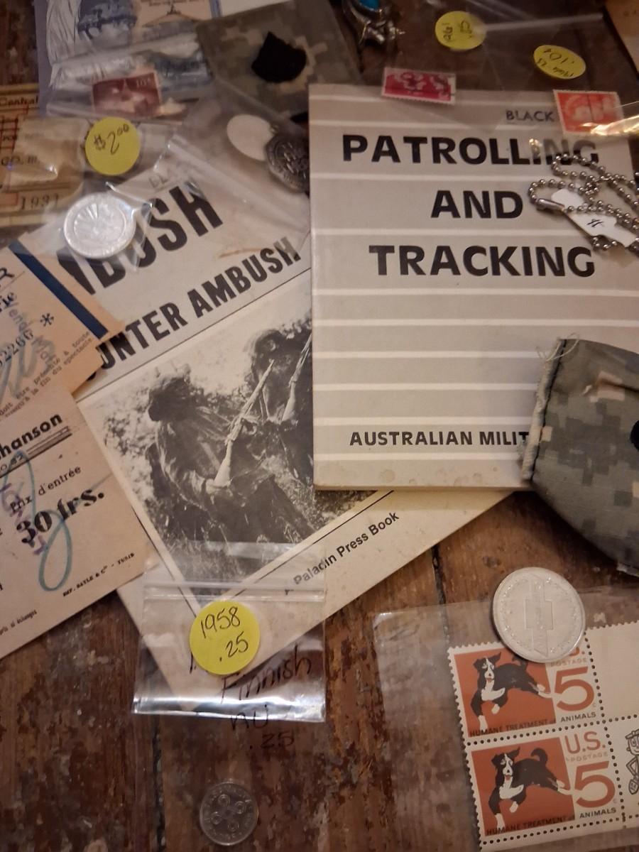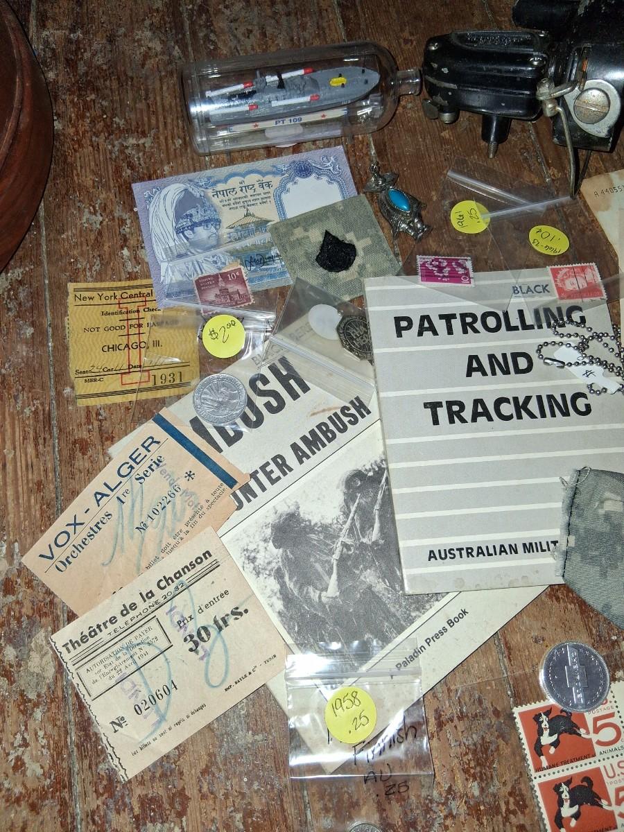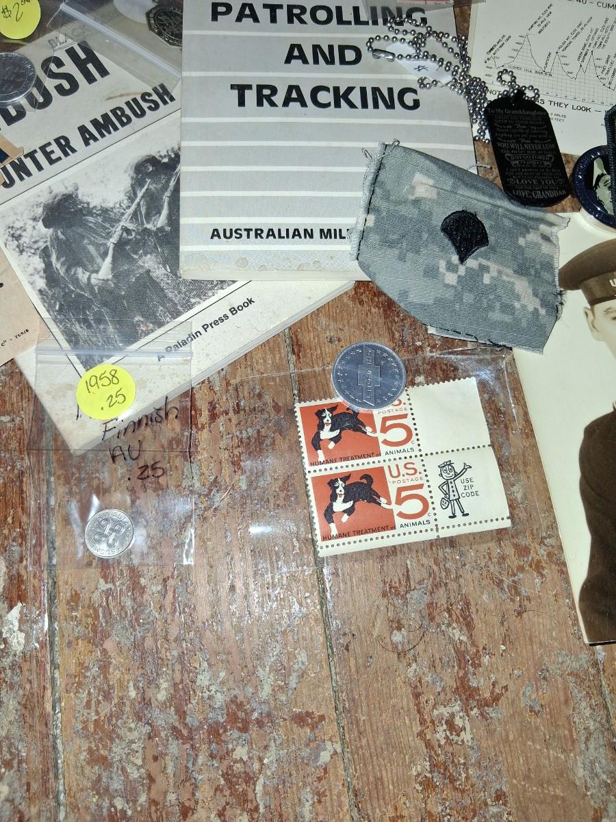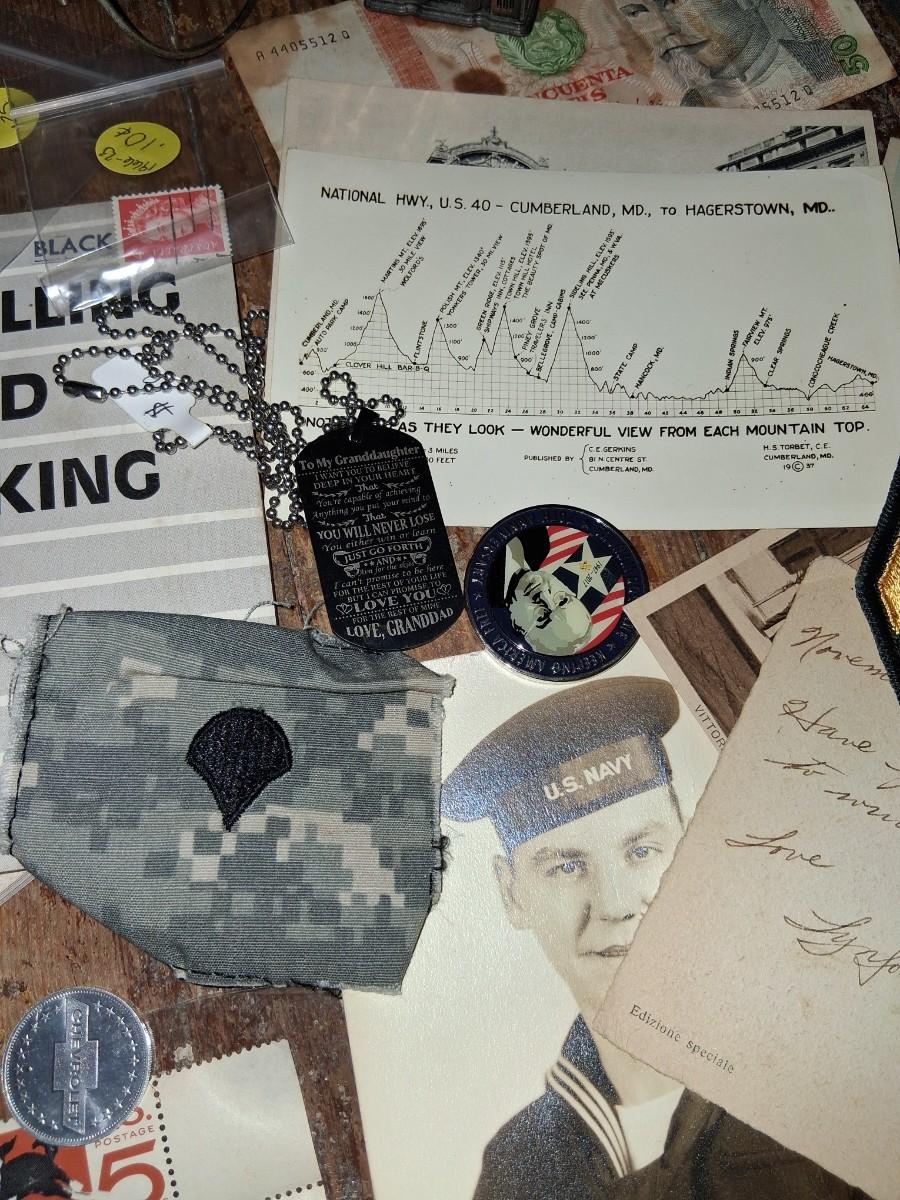 Items Include WWII Soldier carried copies of stories, poems or songs. Patches, Currency, Photos, Postcards, Jewelry, Challenge Coin, Coins, Stamps, Leather Biker Hat, WWII Black Beret Manuals, Micro Machines PT-109 & so much more