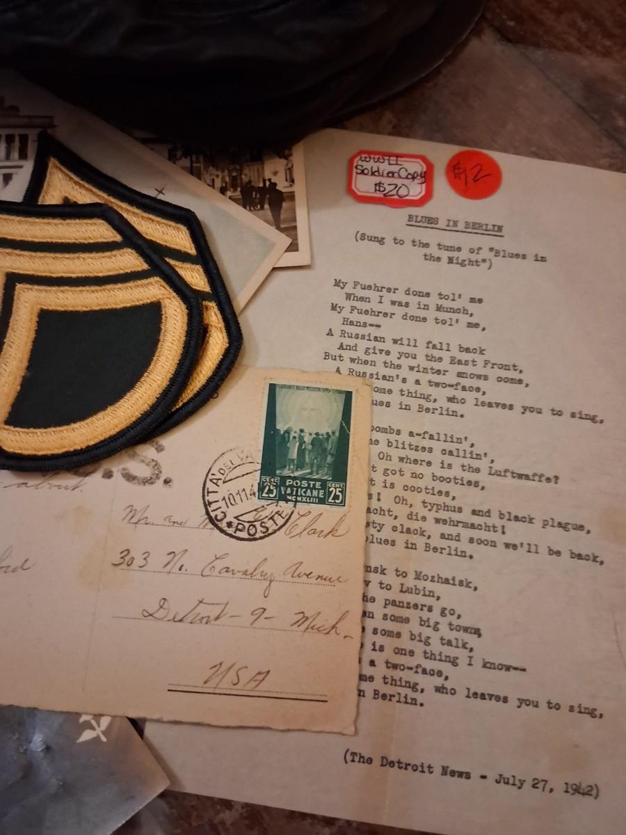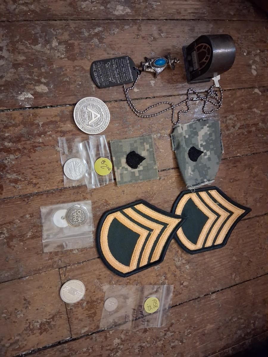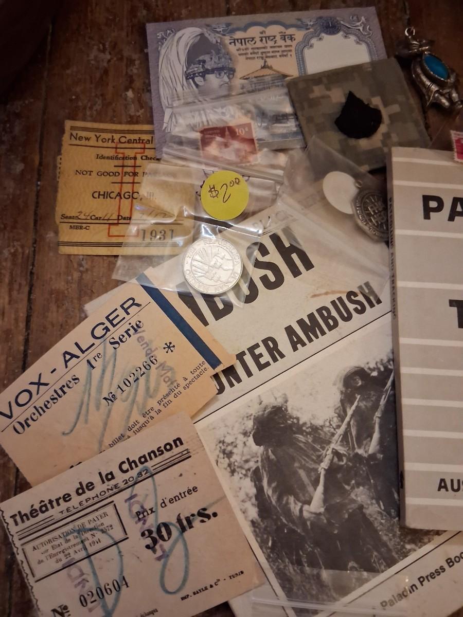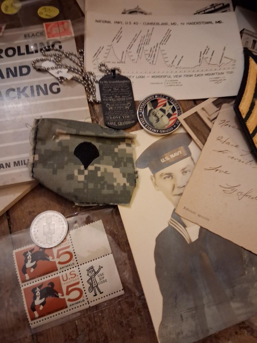 Items Include WWII Soldier carried copies of stories, poems or songs. Patches, Currency, Photos, Postcards, Jewelry, Challenge Coin, Coins, Stamps, Leather Biker Hat, WWII Black Beret Manuals, Micro Machines PT-109 & so much more