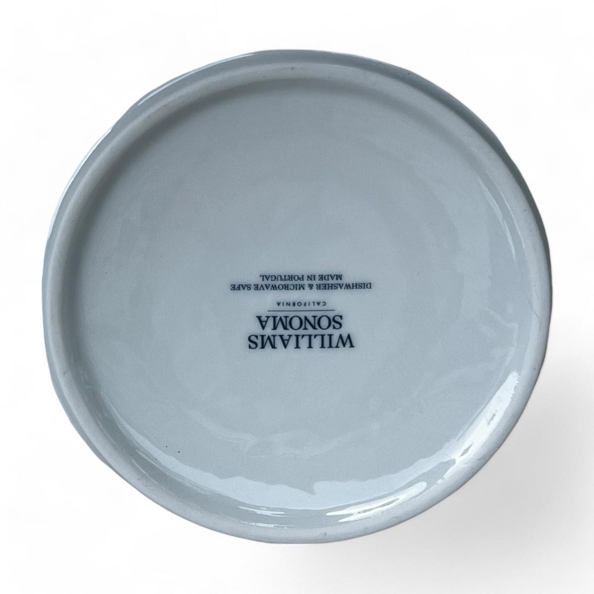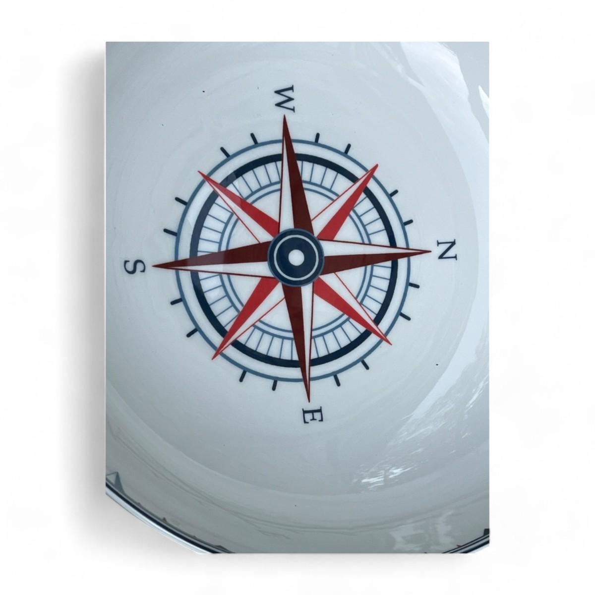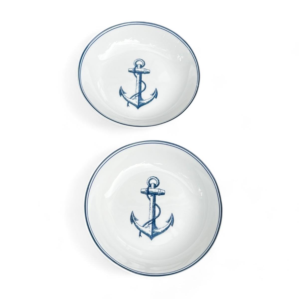 The Williams Sonoma White Nautical Maritime Compass Serve Bowl Set is a charming addition to any coastal-themed dining setting. This elegant set includes one large serve bowl and four smaller companion bowls all crafted from high-quality ceramic in a pristine white finish. The standout feature is the intricate blue nautical compass design which brings a touch of maritime flair perfect for casual gatherings or sophisticated beachside dinners.