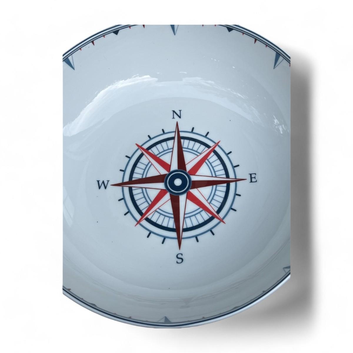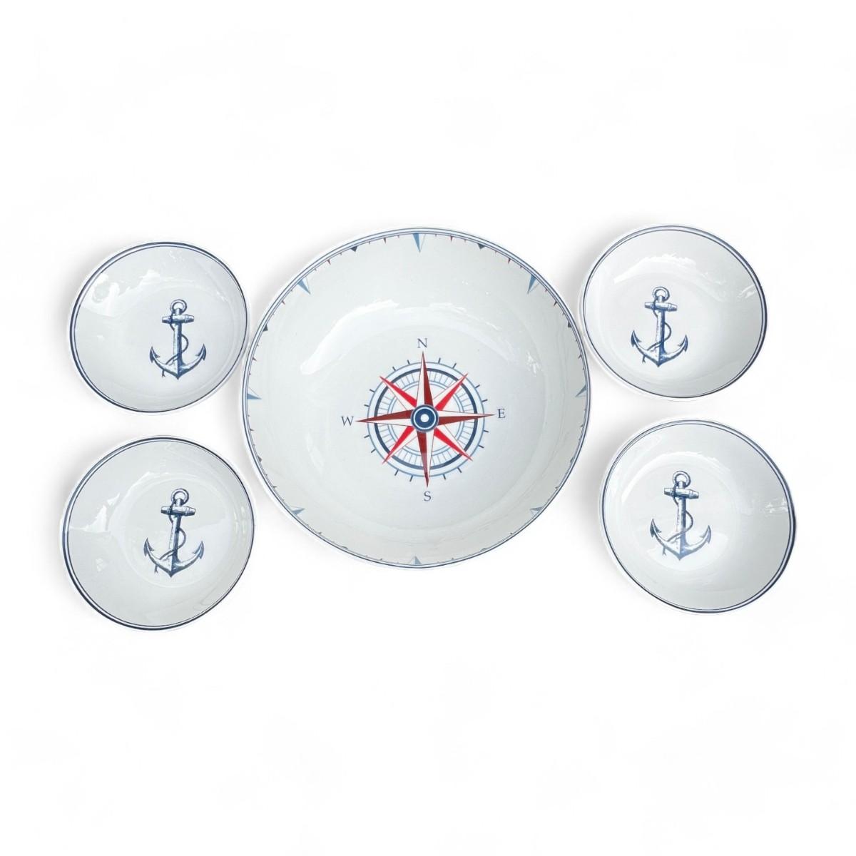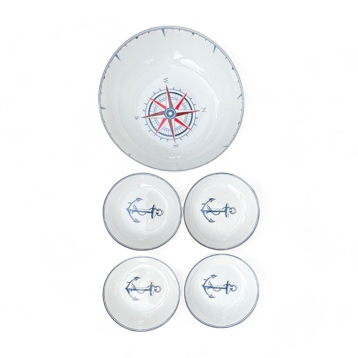 Limited Edition Williams Sonoma White Nautical Maritime Compass Serve Bowl Set 1 Large Bowl & 4 Small Bowls, Brand New