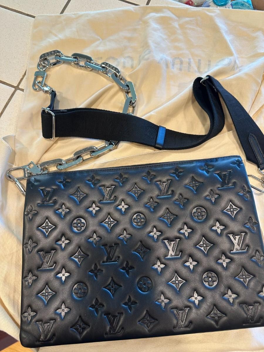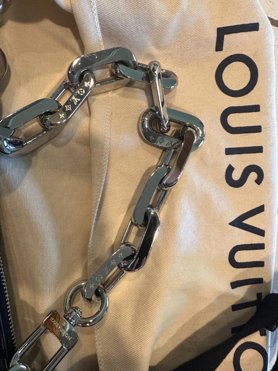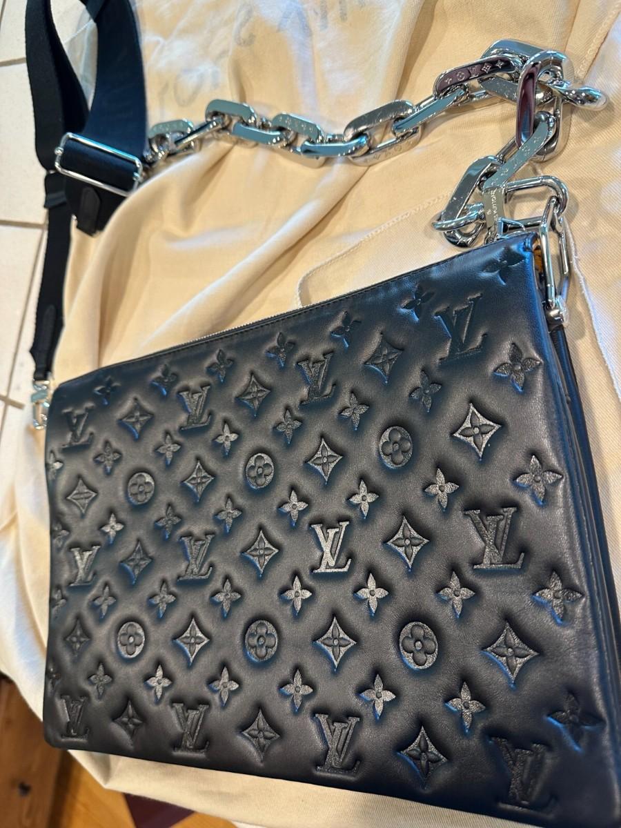Purchased at the Louis Vuitton boutique in the Wynn Las Vegas, this bag has been kept in impeccable condition. Whether carried as a clutch, a chic shoulder bag with its chunky silver chain, or a crossbody with the sporty textile strap, the Coussin MM is the ultimate day-to-evening companion.