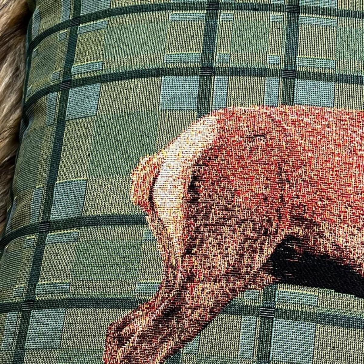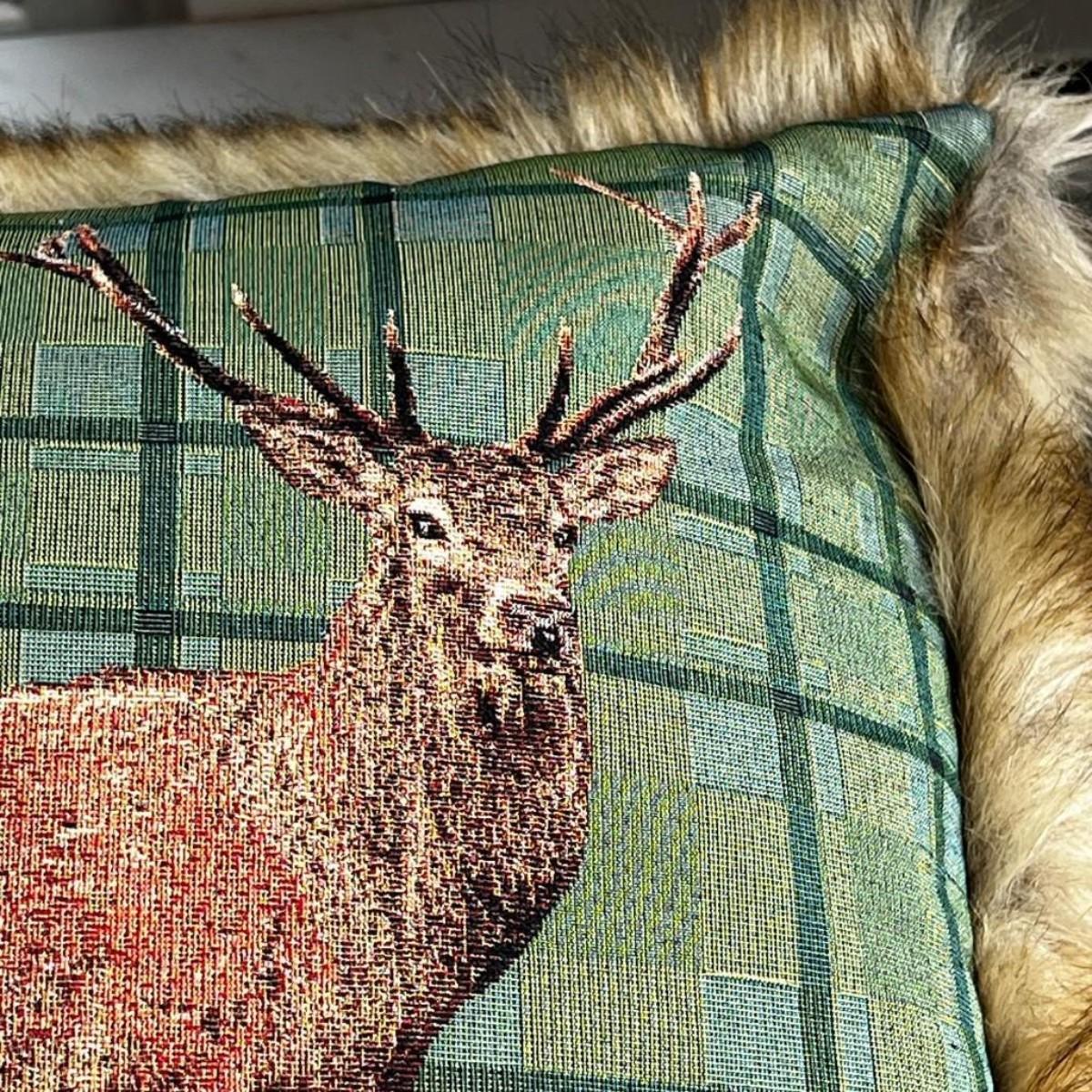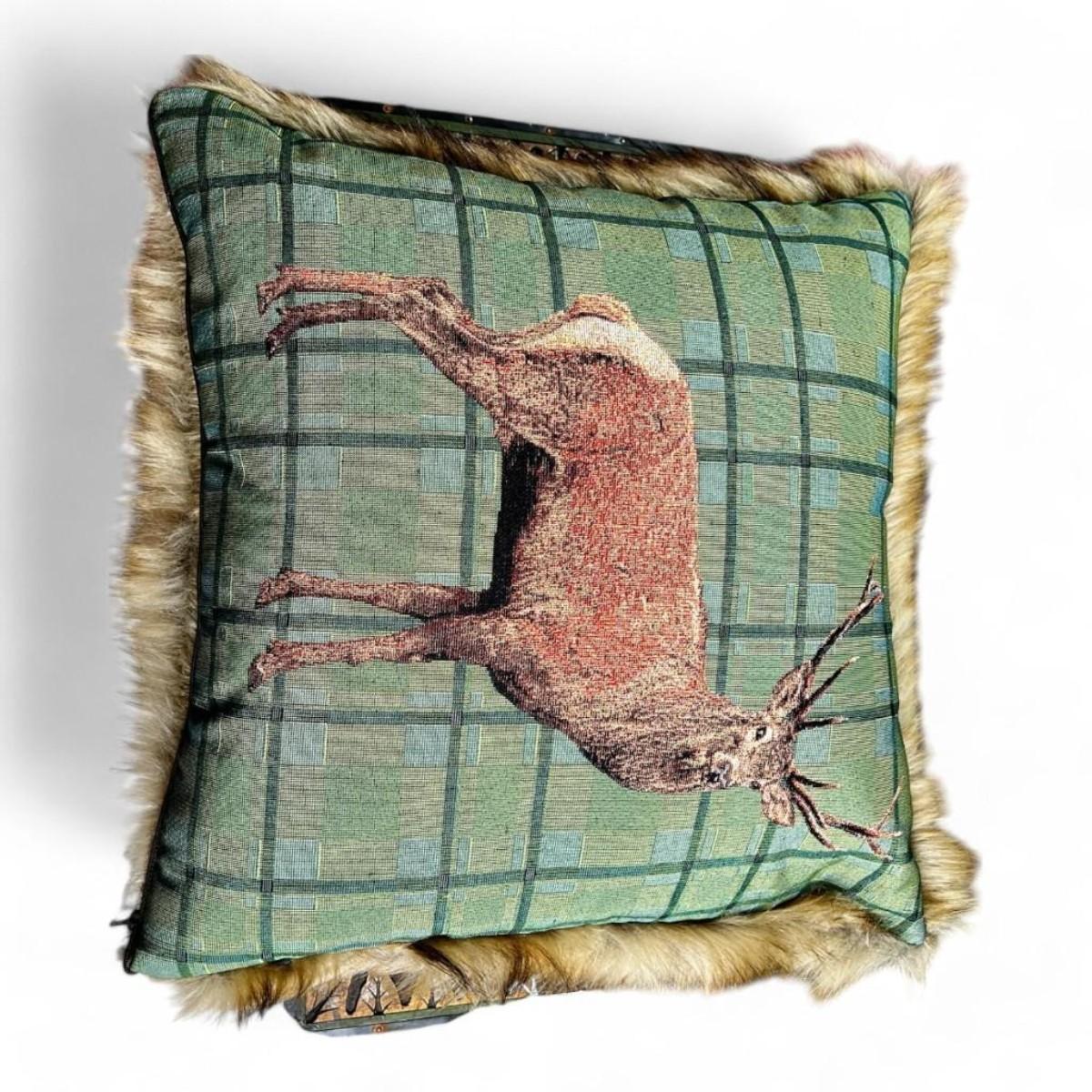 Luxury Cotton Tapestry Pillow with Faux Fur Back by Hines of Oxford -  Stag Green Plaid, Christmas Decorative Throw Pillow