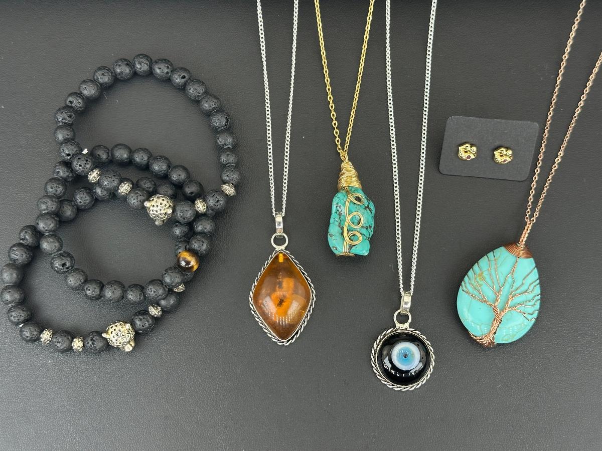 Mix Jewelry Lot Includes Turquoise Necklace, Lava Rock Bracelets, Stud Earrings, And More