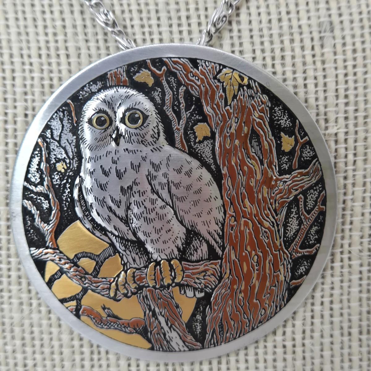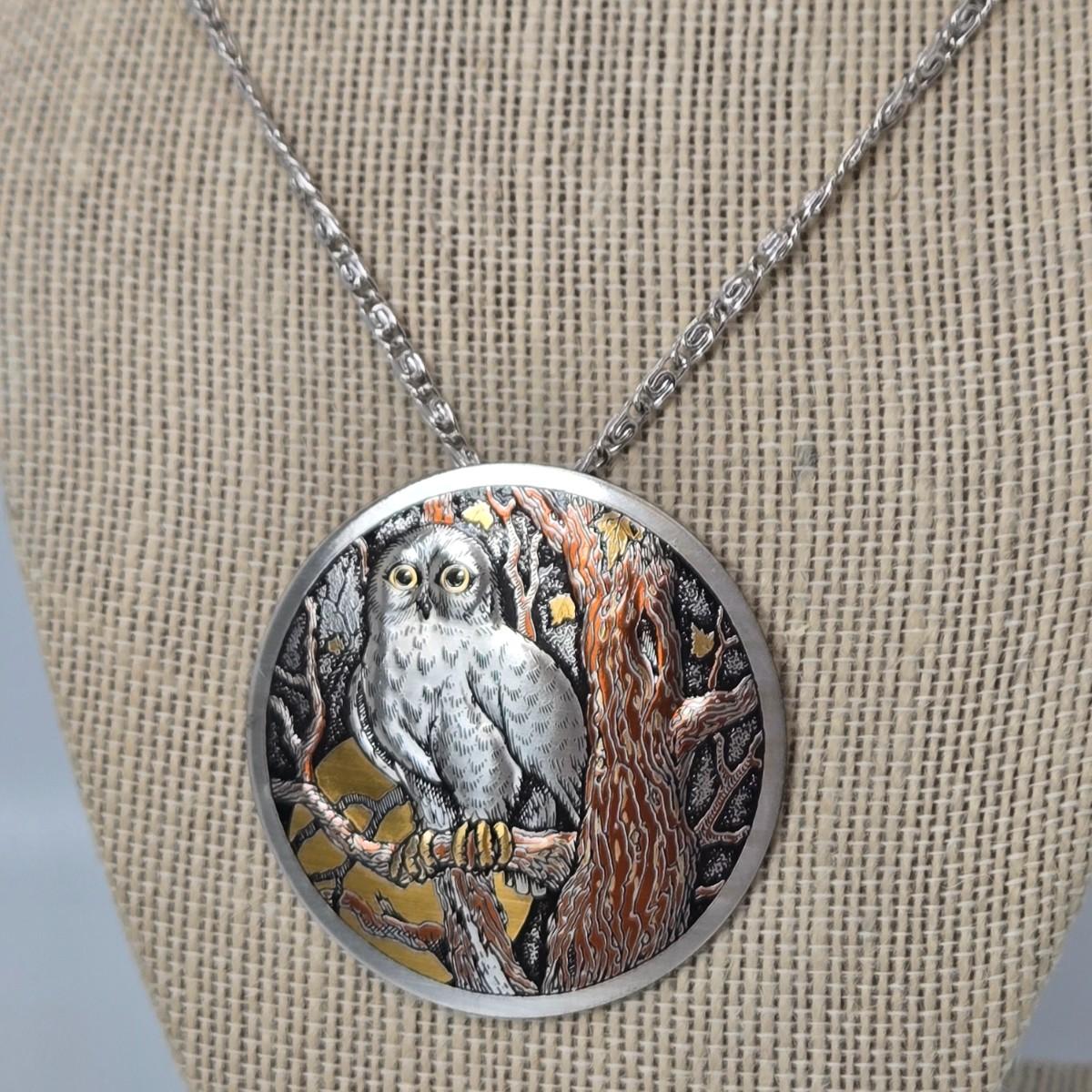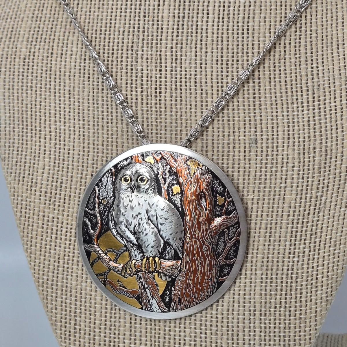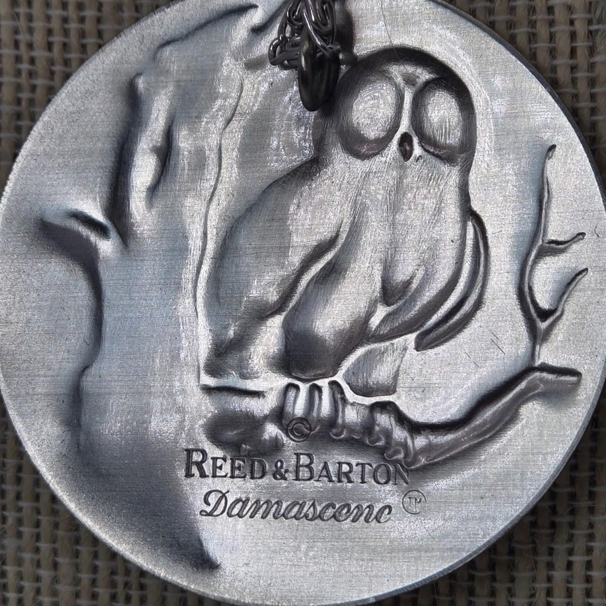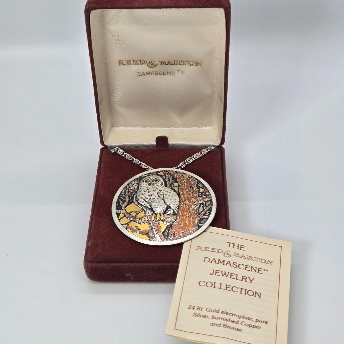 New in Box ,The Reed & Barton Damascene Jewelry Collection Owl Pendant on 22 Inch Silver Chain