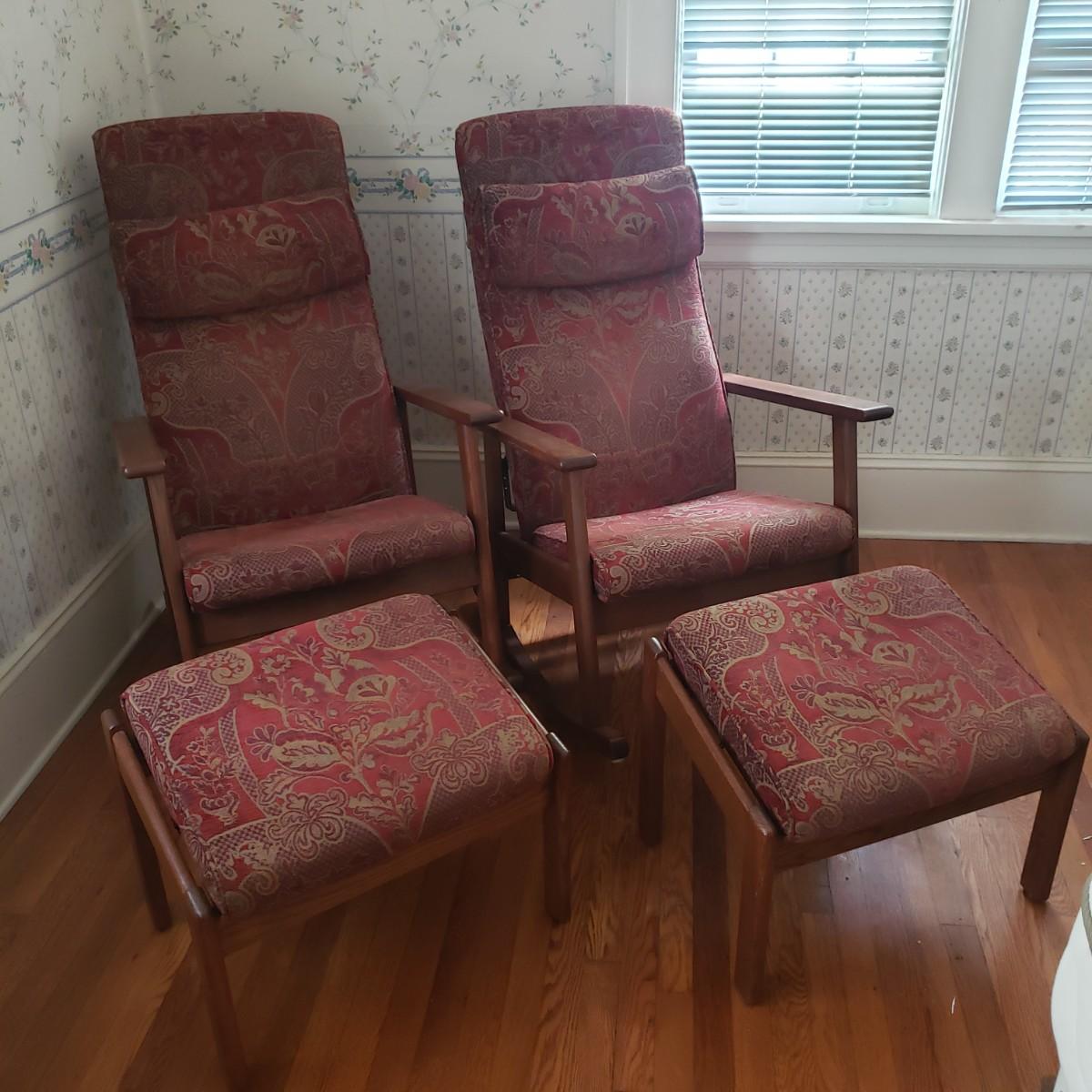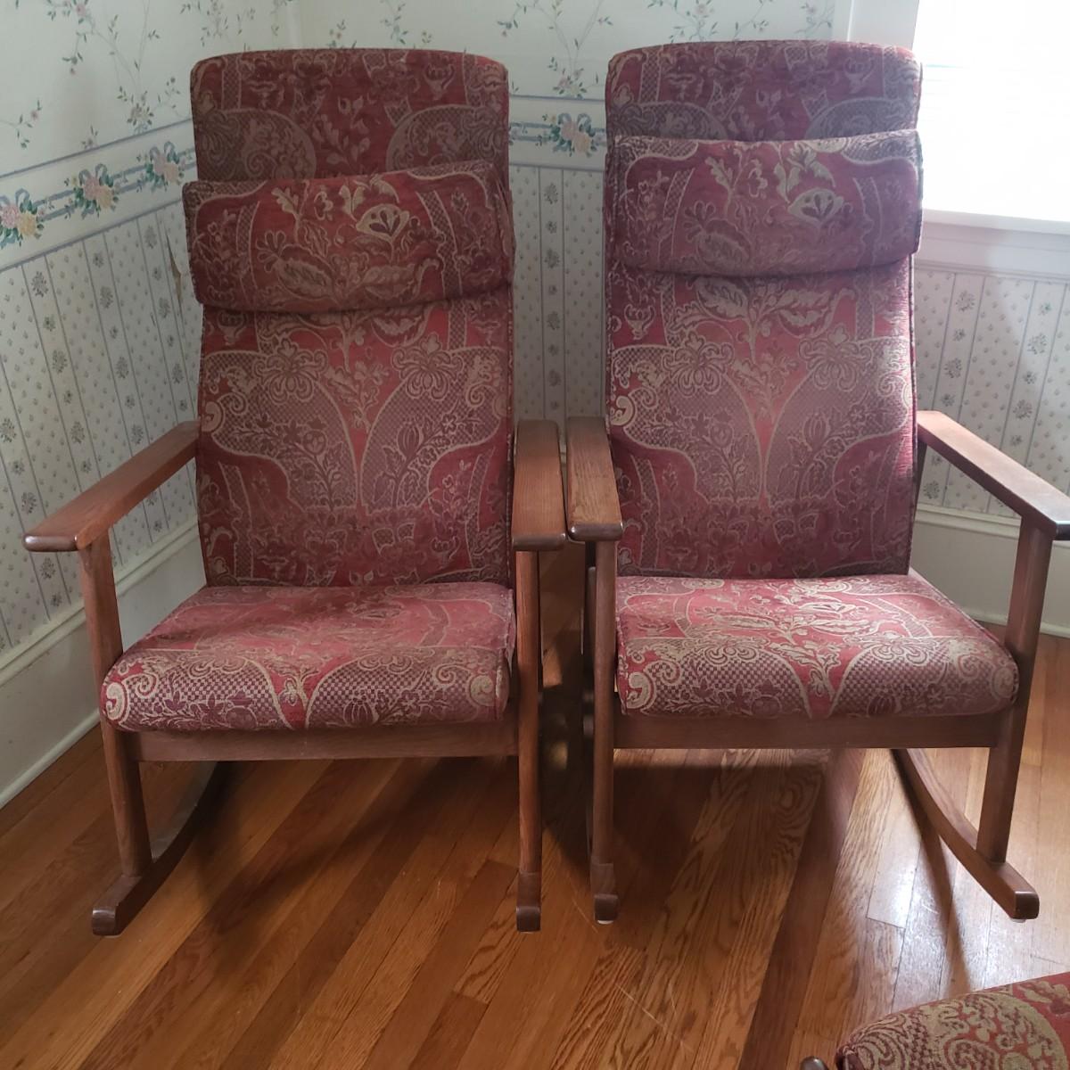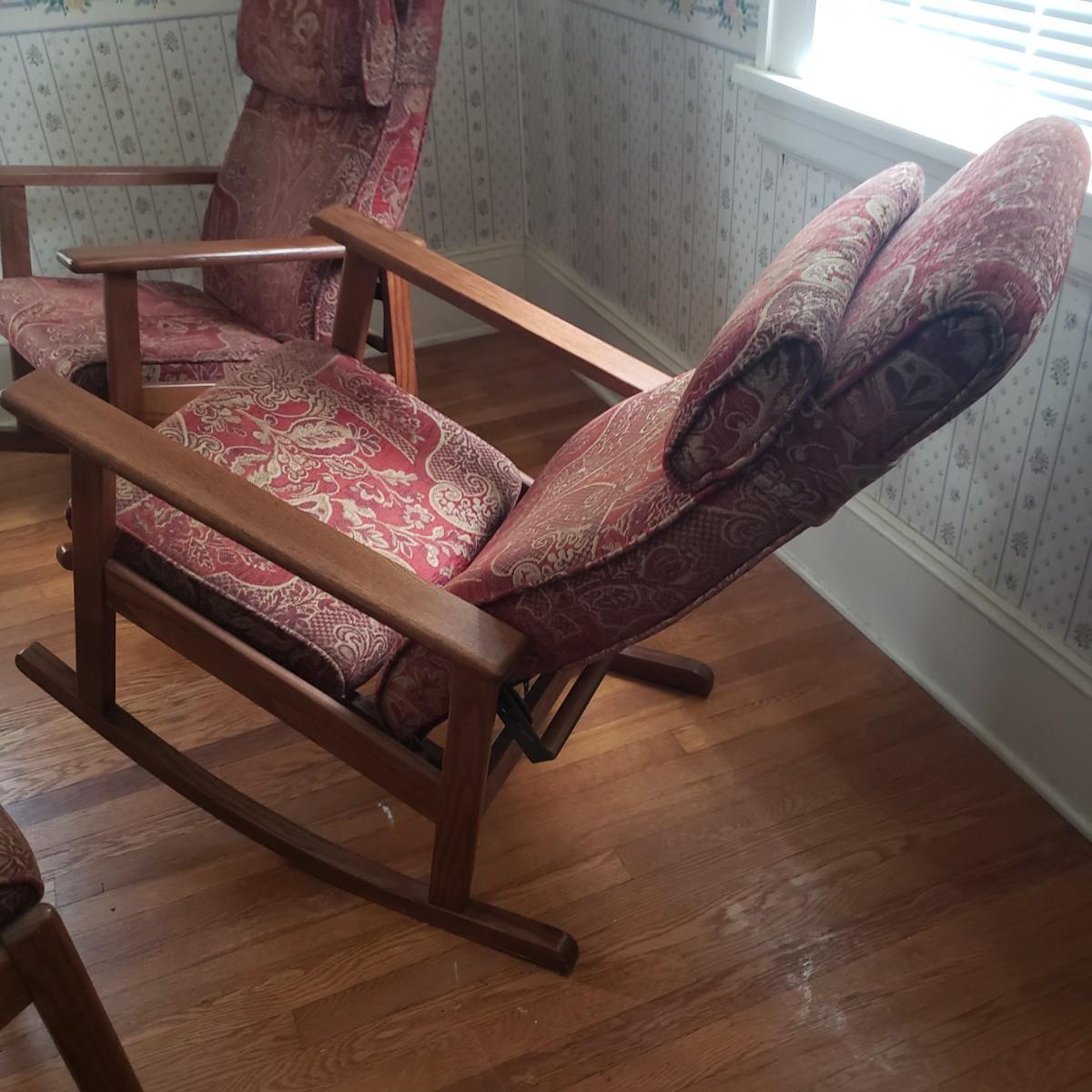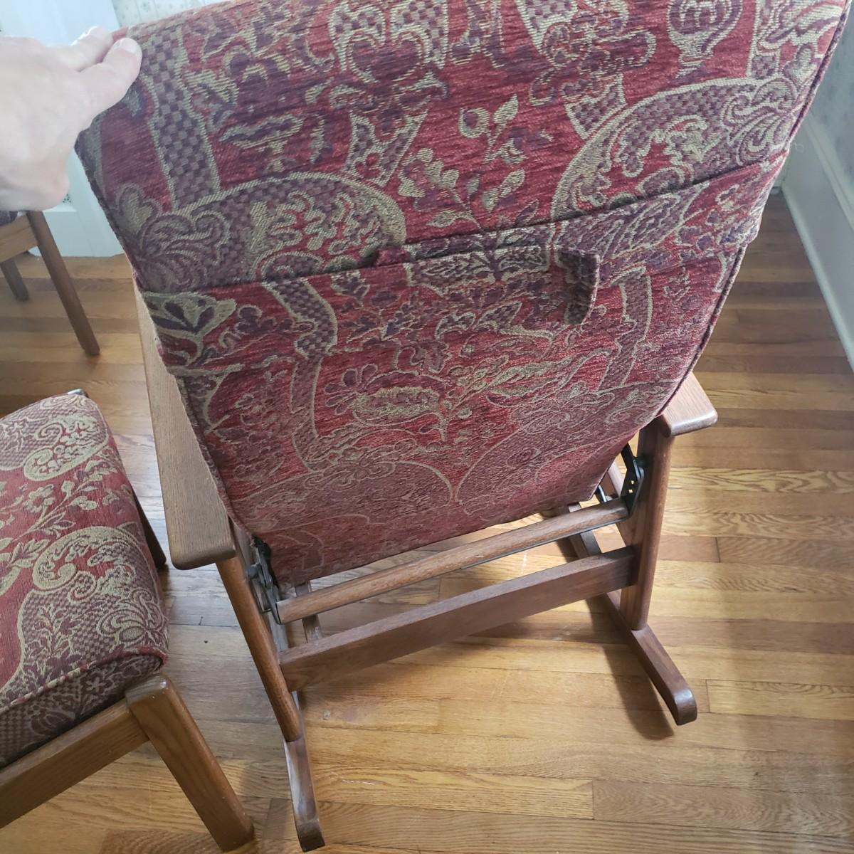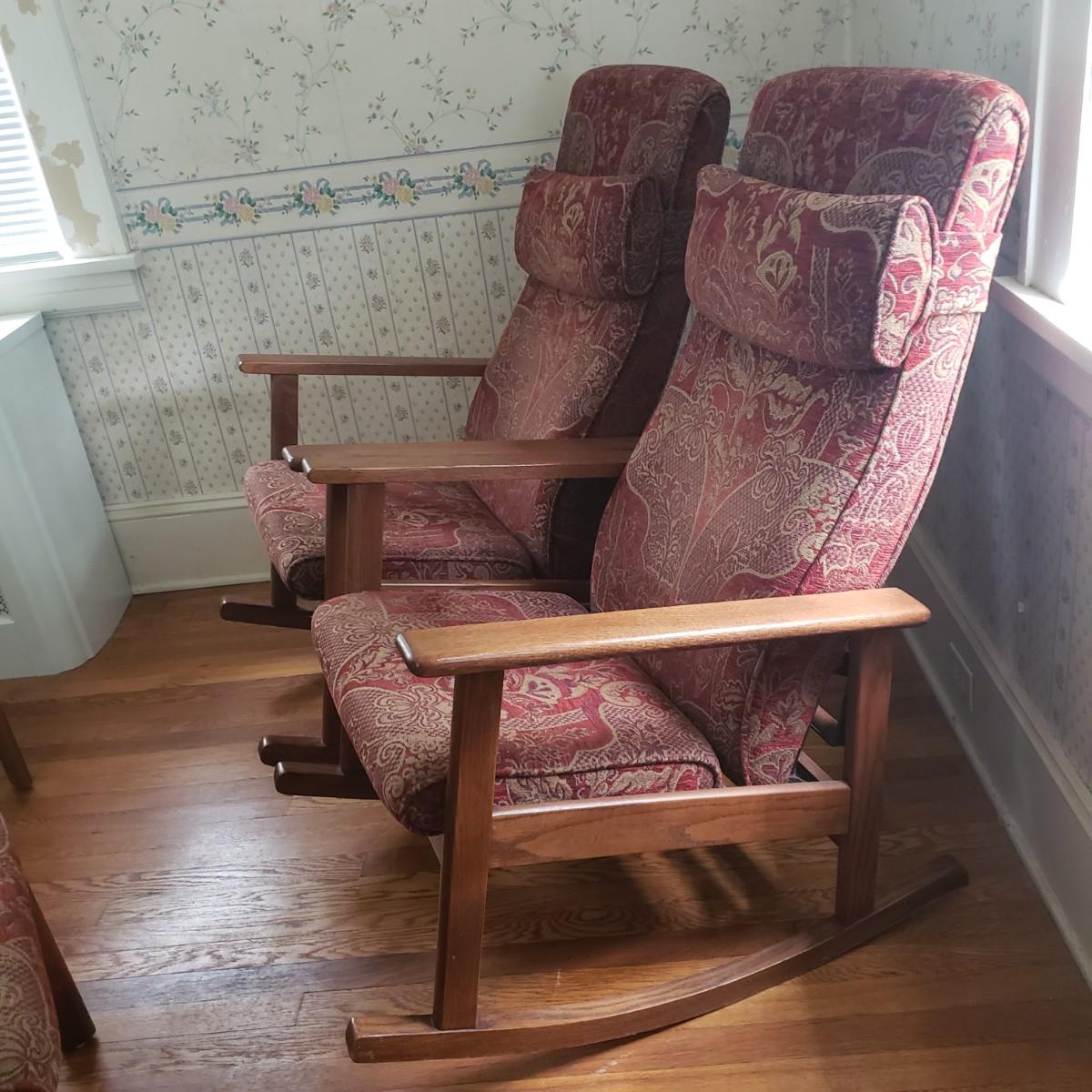 This pair of unique wooden base rocking chairs are upholstered in a red and camel colored fabric. The chairs recline by pulling up to the three reclining slots. The pillow is adjustable with velcro. The chair measures 25" x 26" x 44"H. The ottoman measures 22" x 17" x 18"H. There appears to be no blemishes. Chairs are from a dog friendly home.