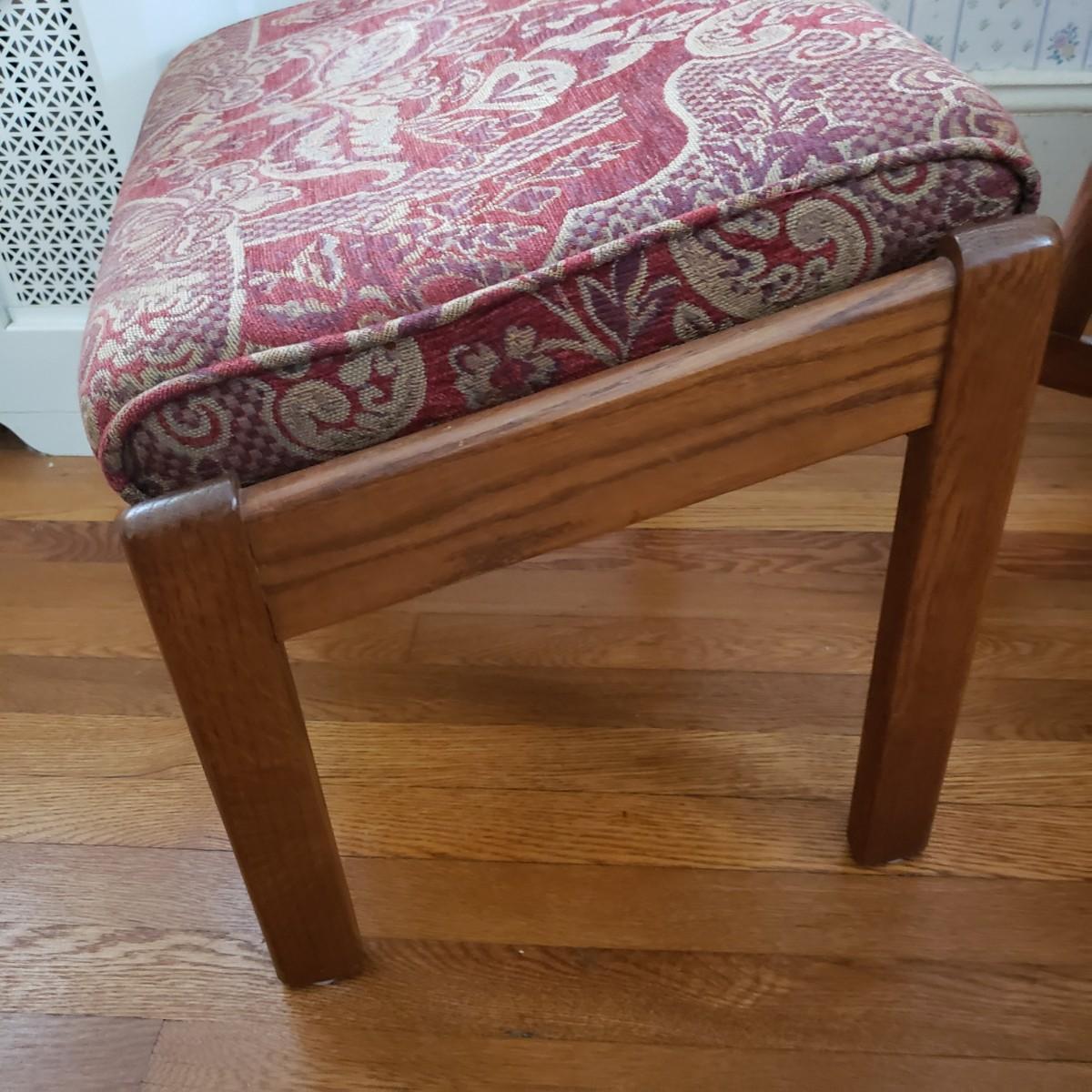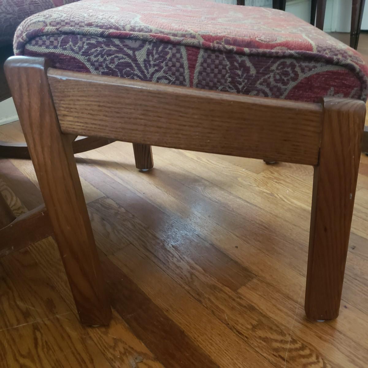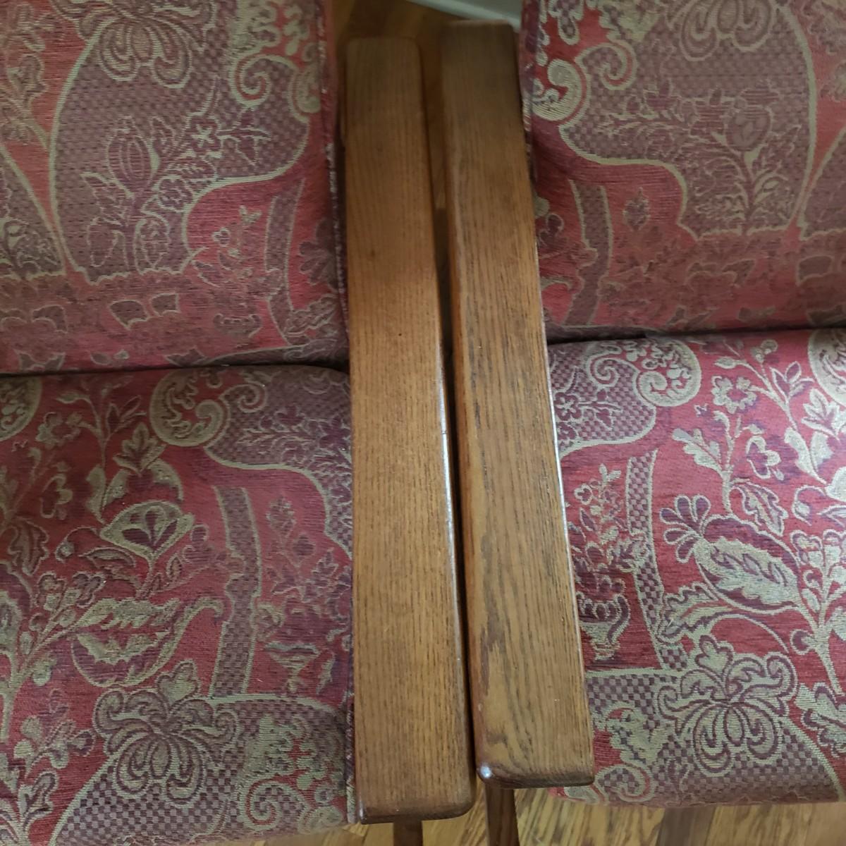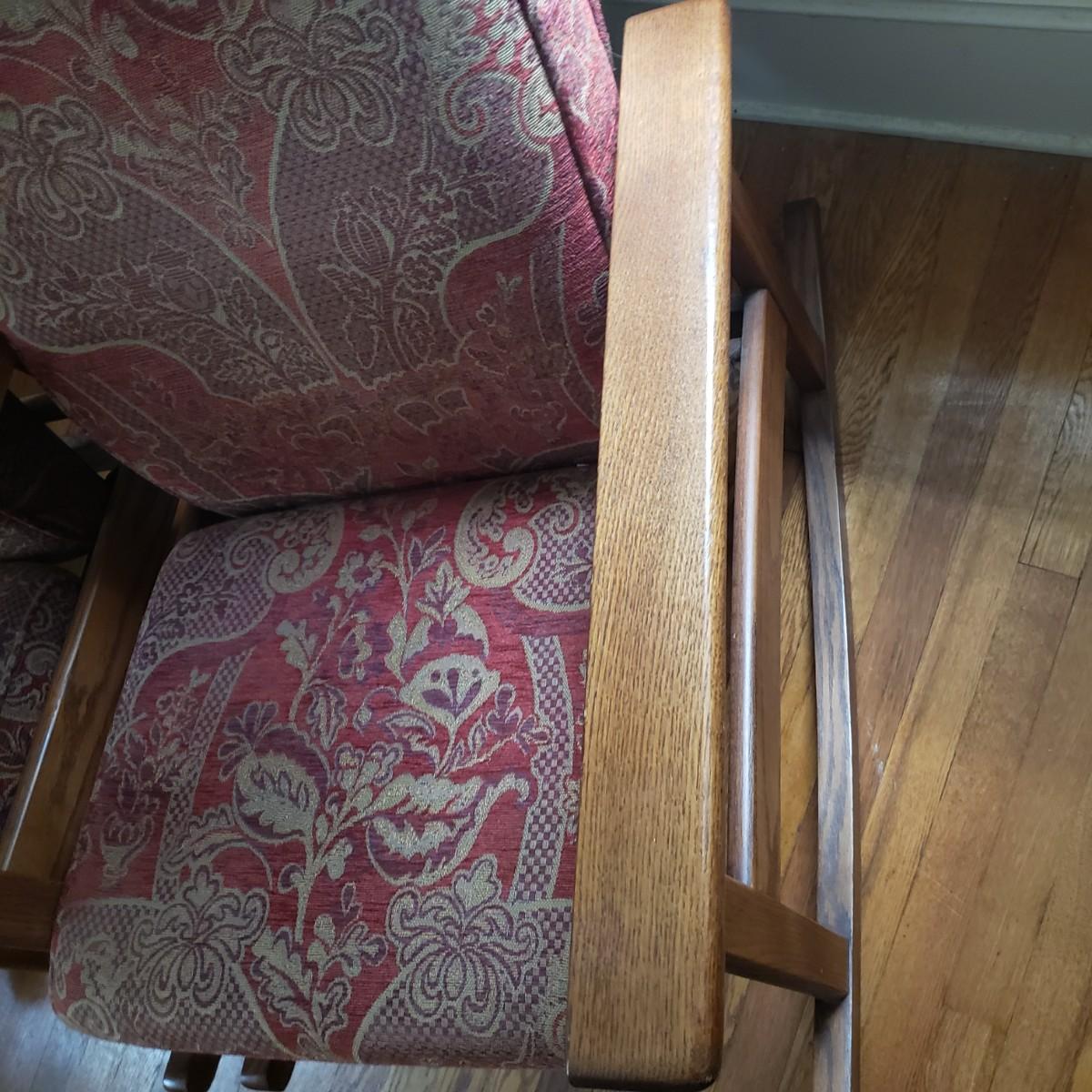 This pair of unique wooden base rocking chairs are upholstered in a red and camel colored fabric. The chairs recline by pulling up to the three reclining slots. The pillow is adjustable with velcro. The chair measures 25" x 26" x 44"H. The ottoman measures 22" x 17" x 18"H. There appears to be no blemishes. Chairs are from a dog friendly home.