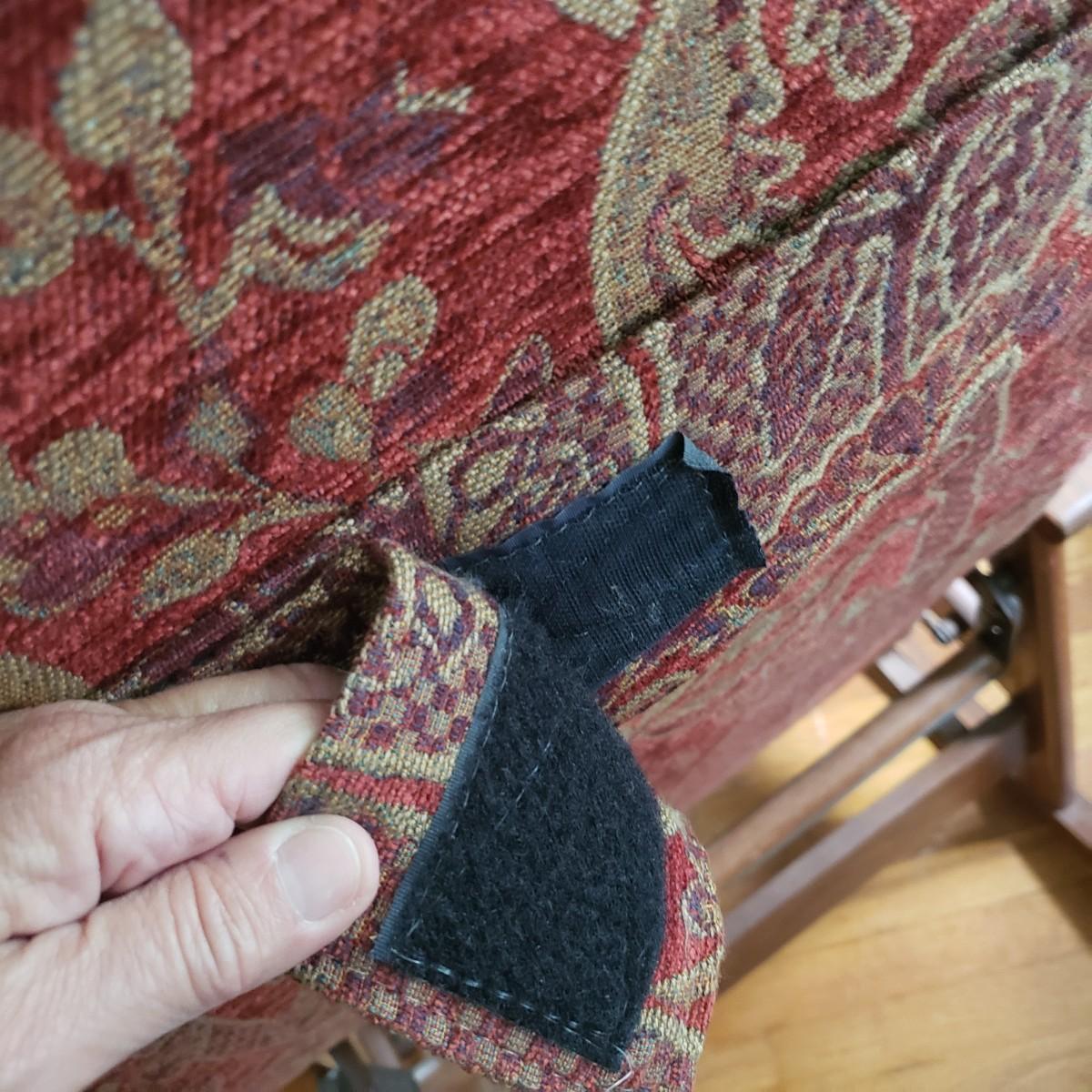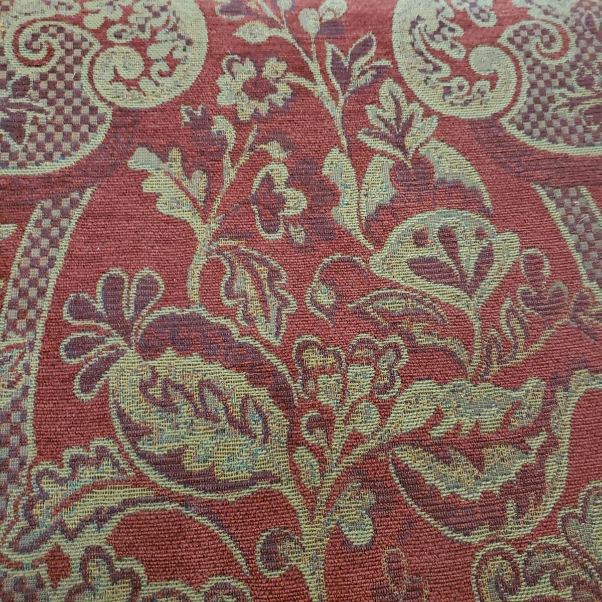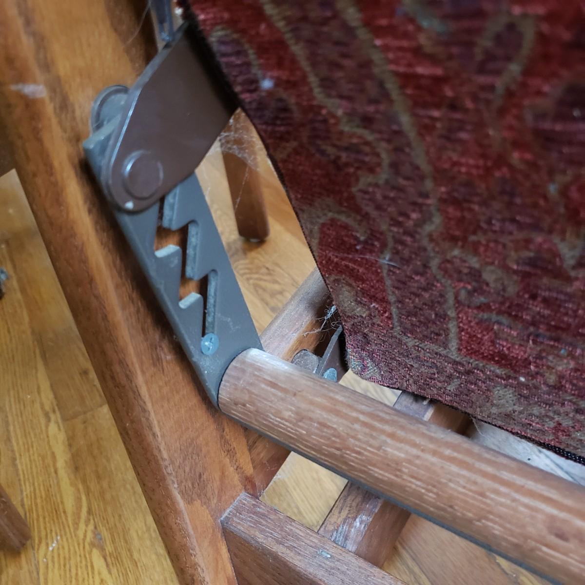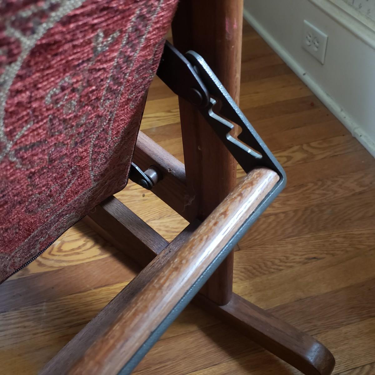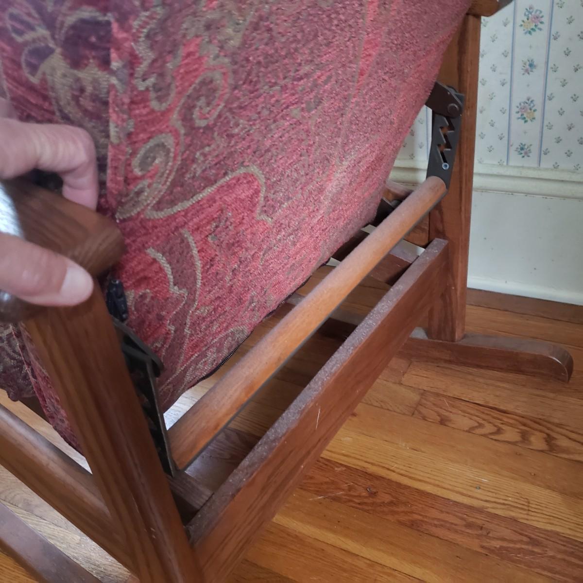 This pair of unique wooden base rocking chairs are upholstered in a red and camel colored fabric. The chairs recline by pulling up to the three reclining slots. The pillow is adjustable with velcro. The chair measures 25" x 26" x 44"H. The ottoman measures 22" x 17" x 18"H. There appears to be no blemishes. Chairs are from a dog friendly home.