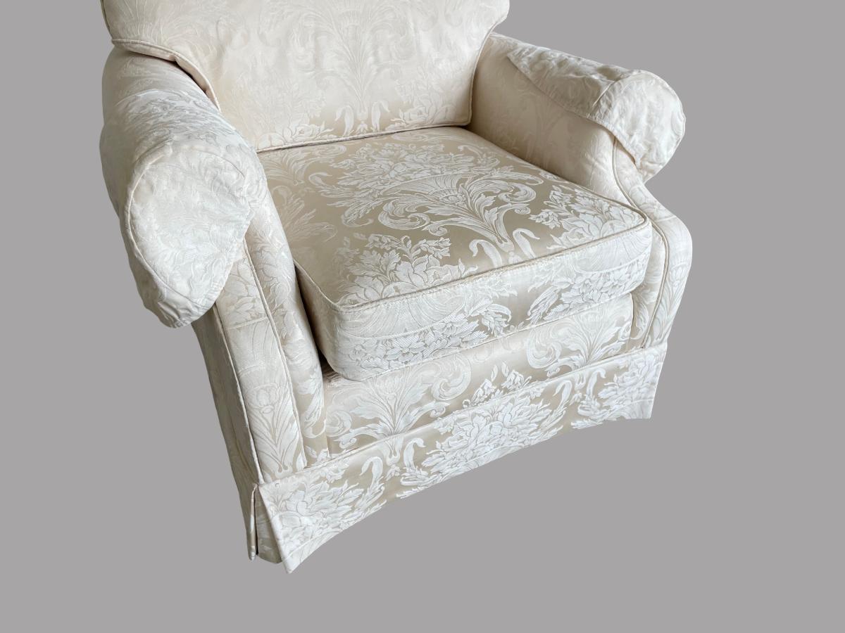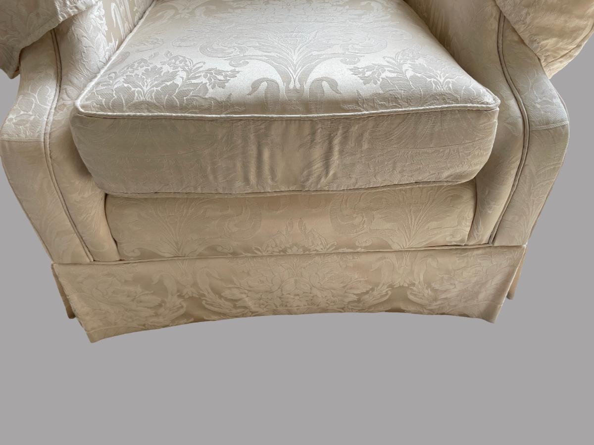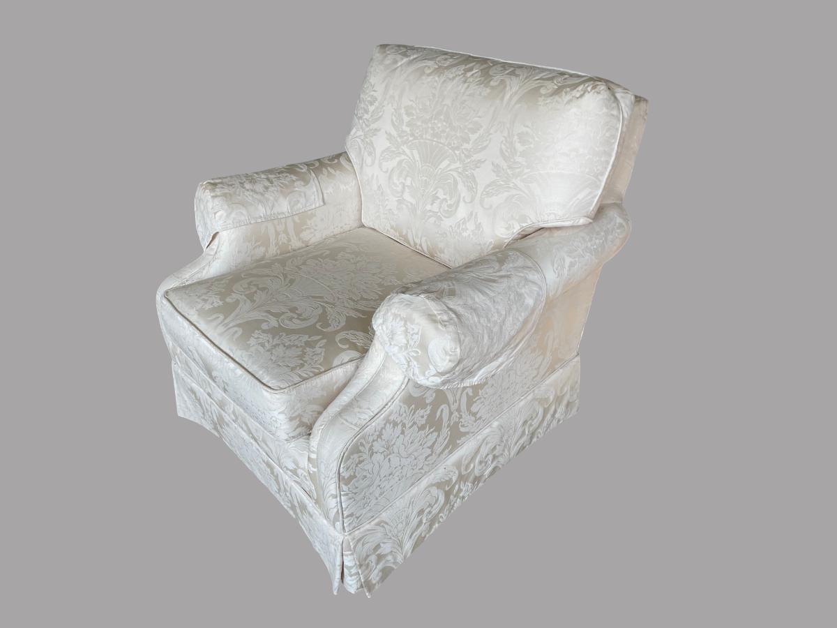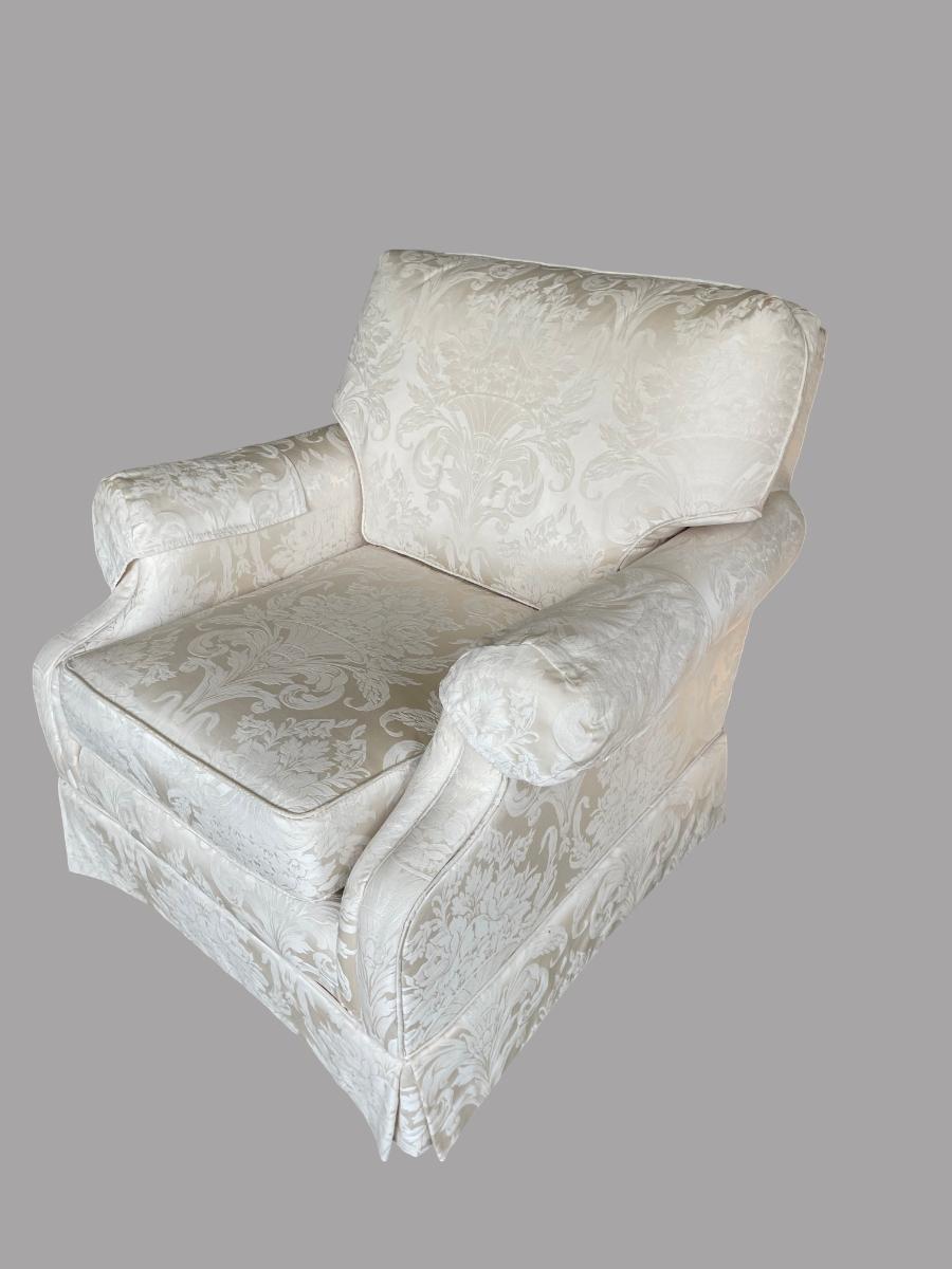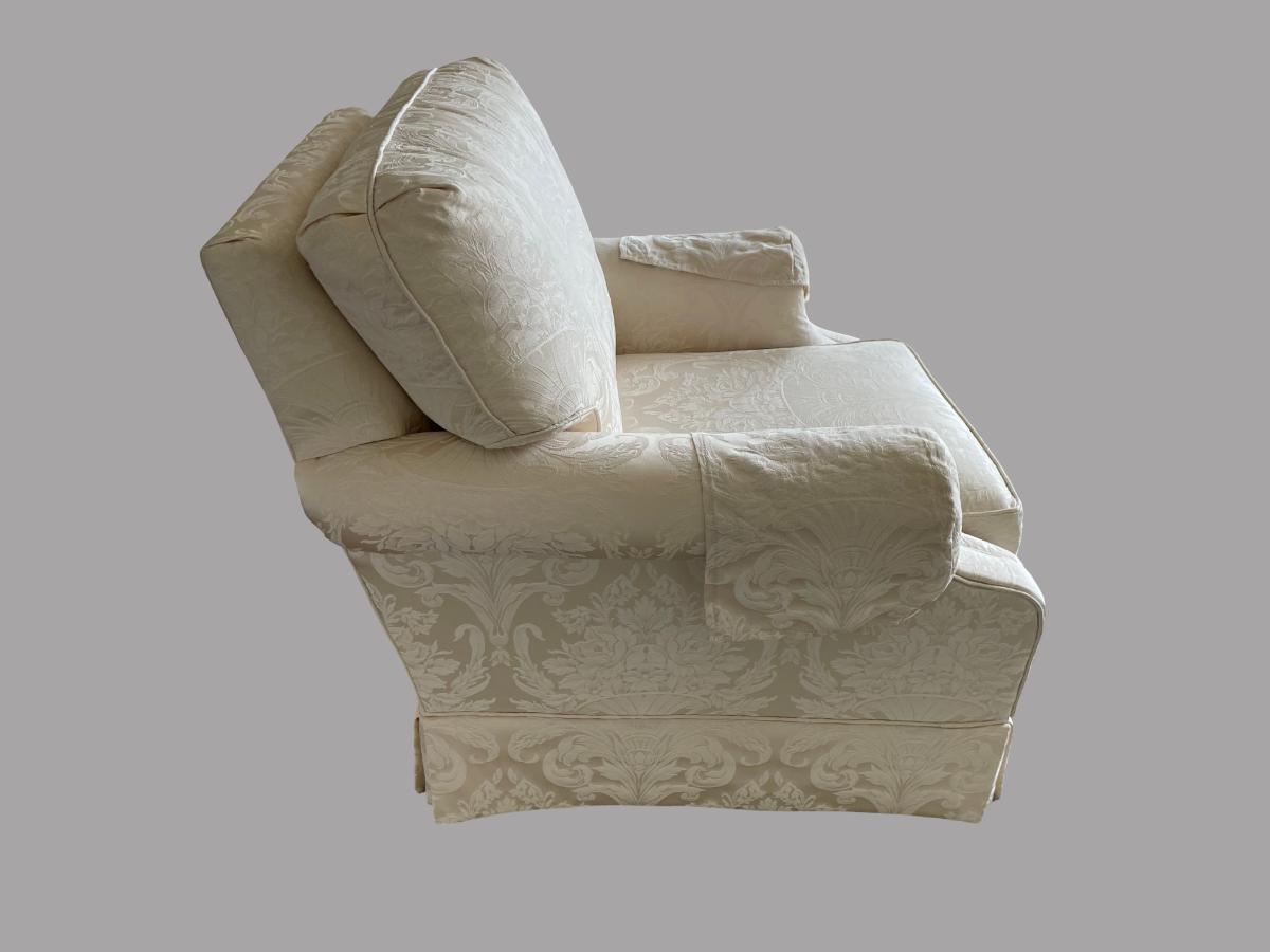 This pair of Key City upholstered armchairs featuring a white damask-patterned fabric are clean and very comfortable. The armchairs are constructed with rolled arms, a square back cushion, and a skirted base. It includes a loose seat and back cushion for added comfort. Made by Key City, established in 1927. 33h x 37w x 31d.