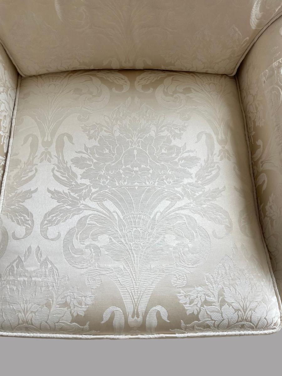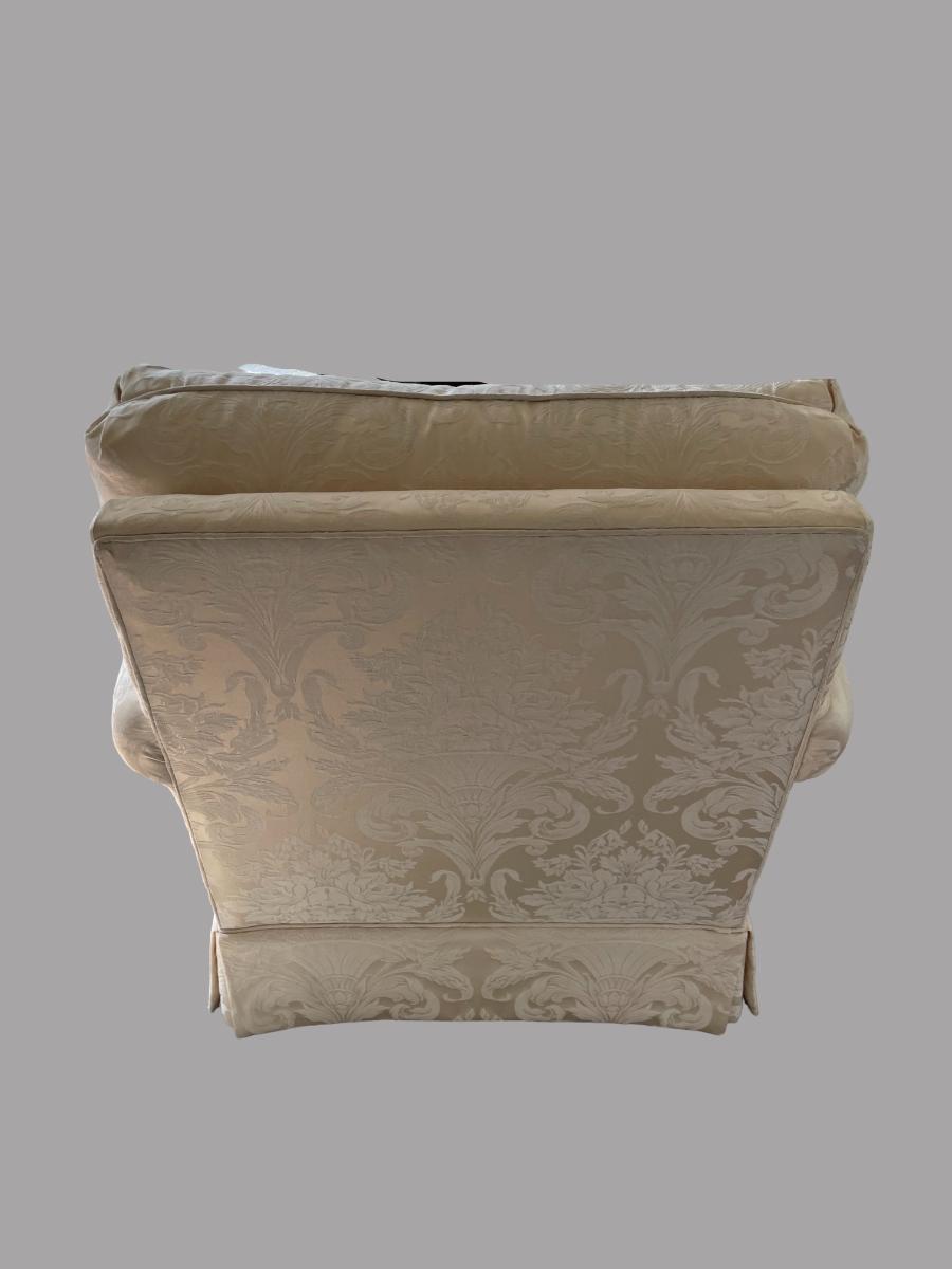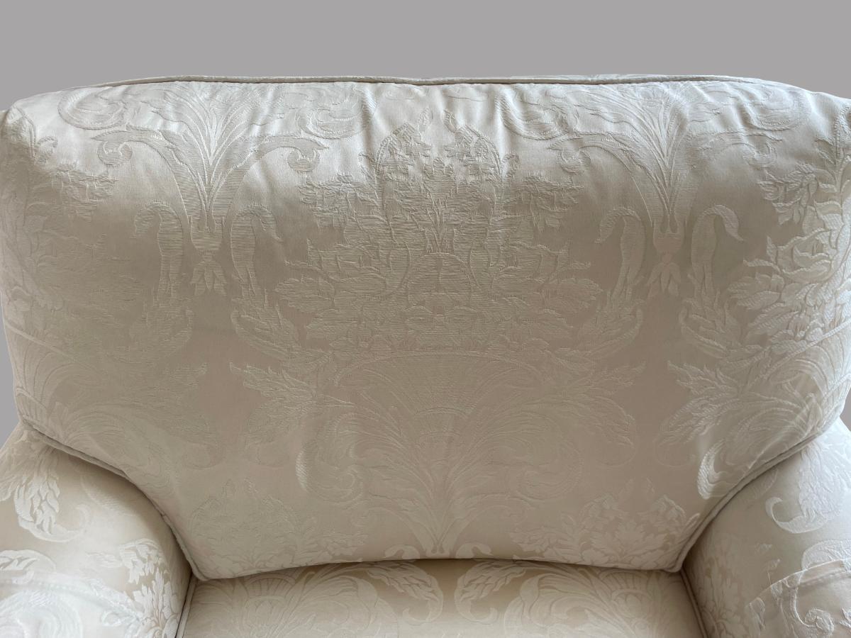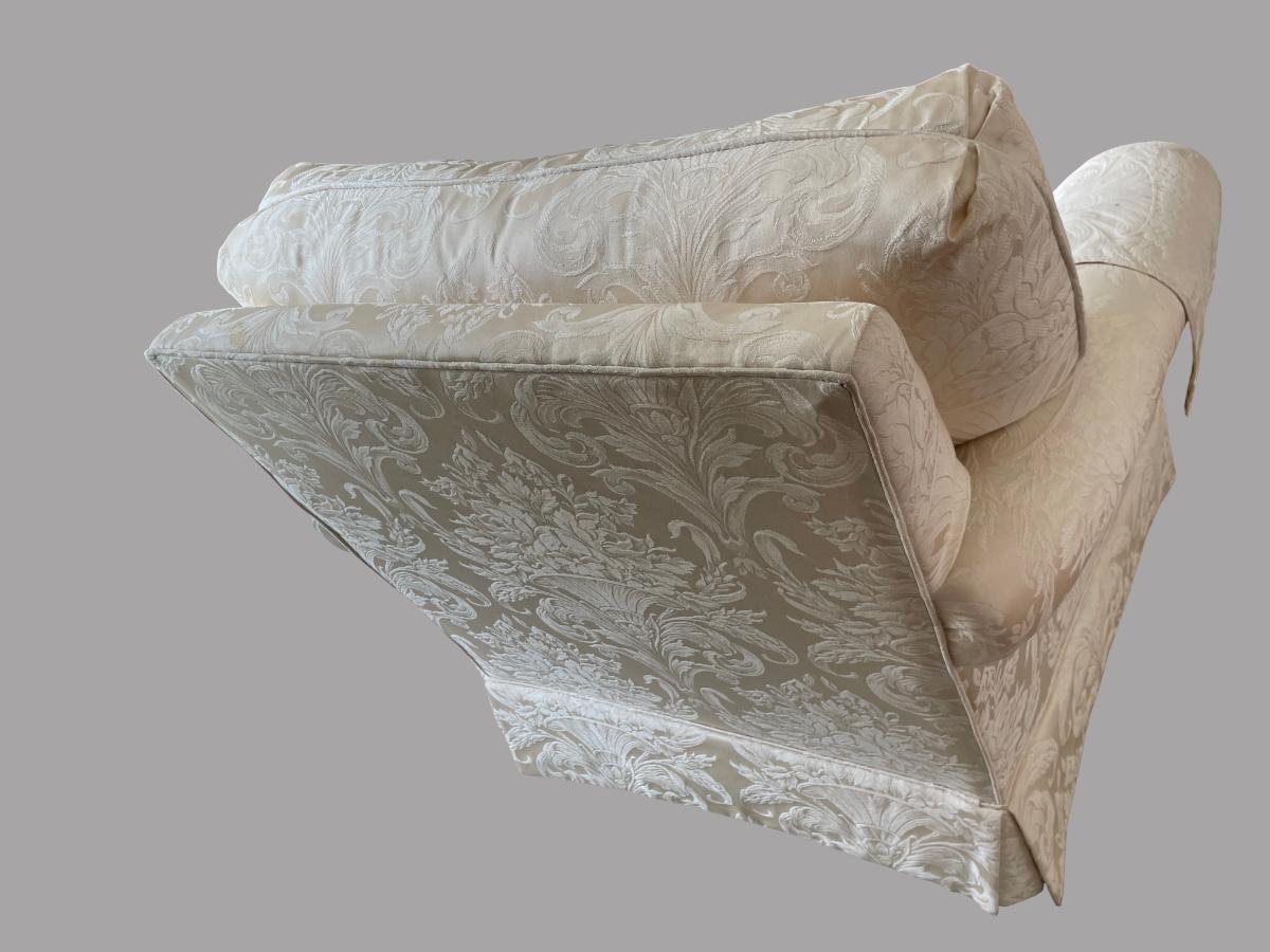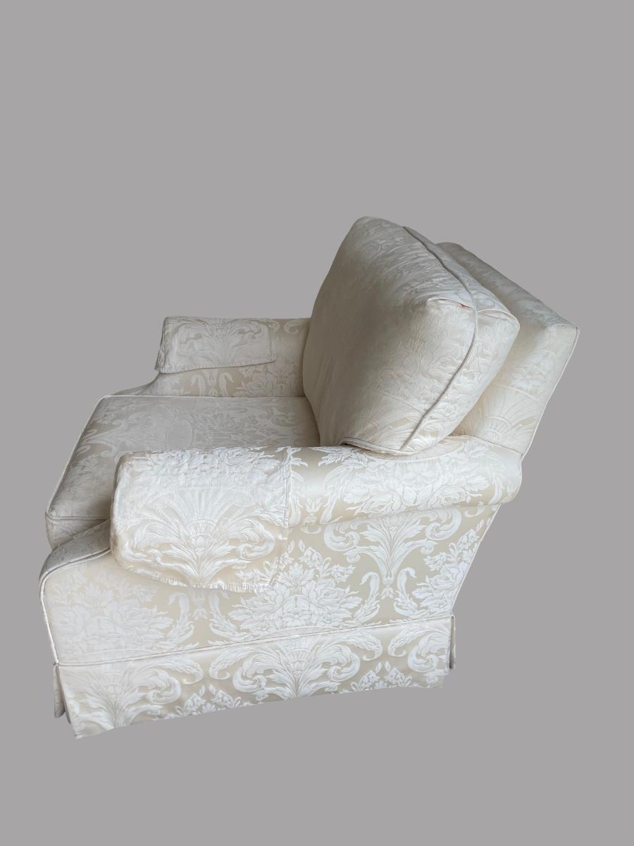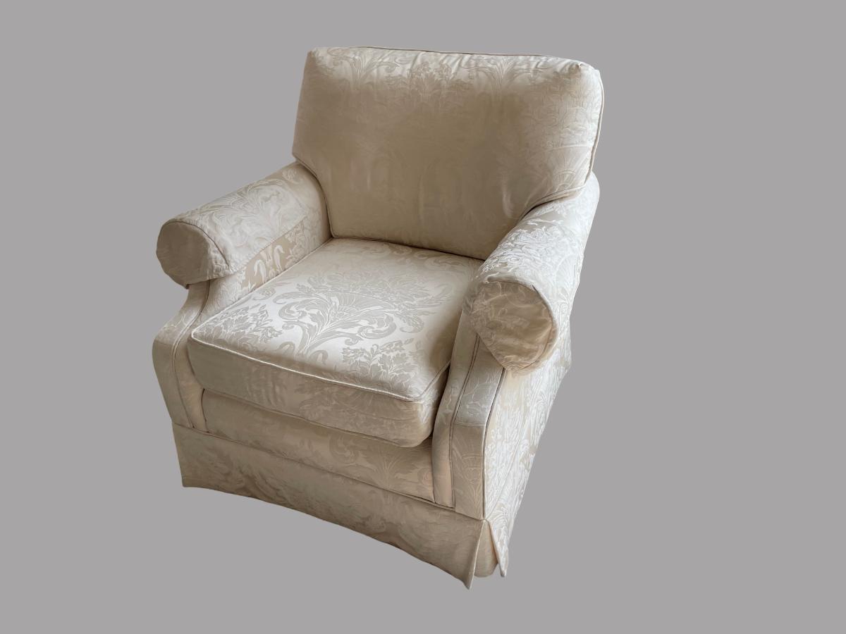 This pair of Key City upholstered armchairs featuring a white damask-patterned fabric are clean and very comfortable. The armchairs are constructed with rolled arms, a square back cushion, and a skirted base. It includes a loose seat and back cushion for added comfort. Made by Key City, established in 1927. 33h x 37w x 31d.