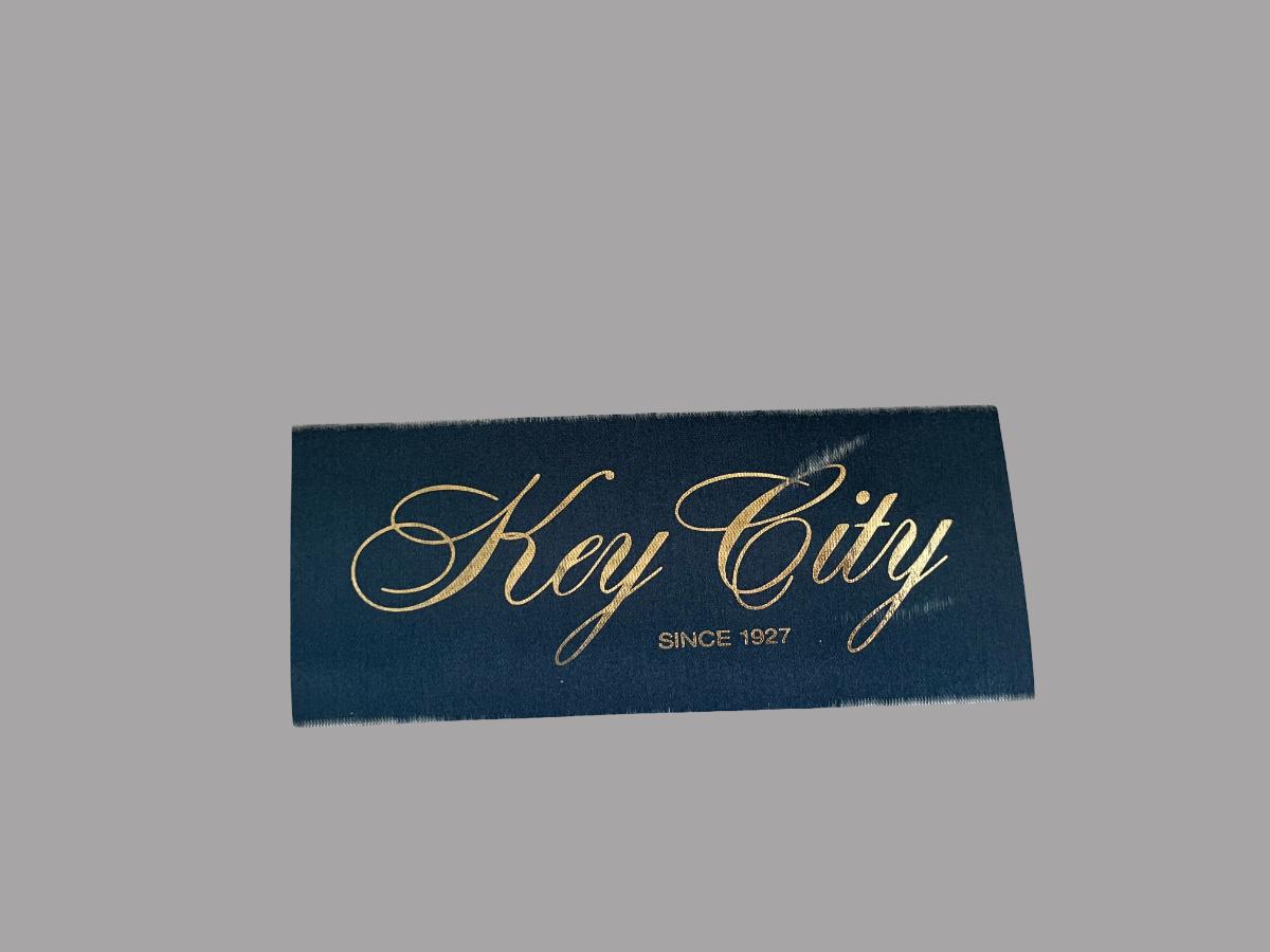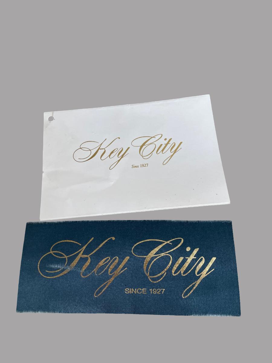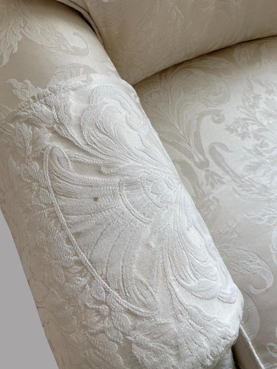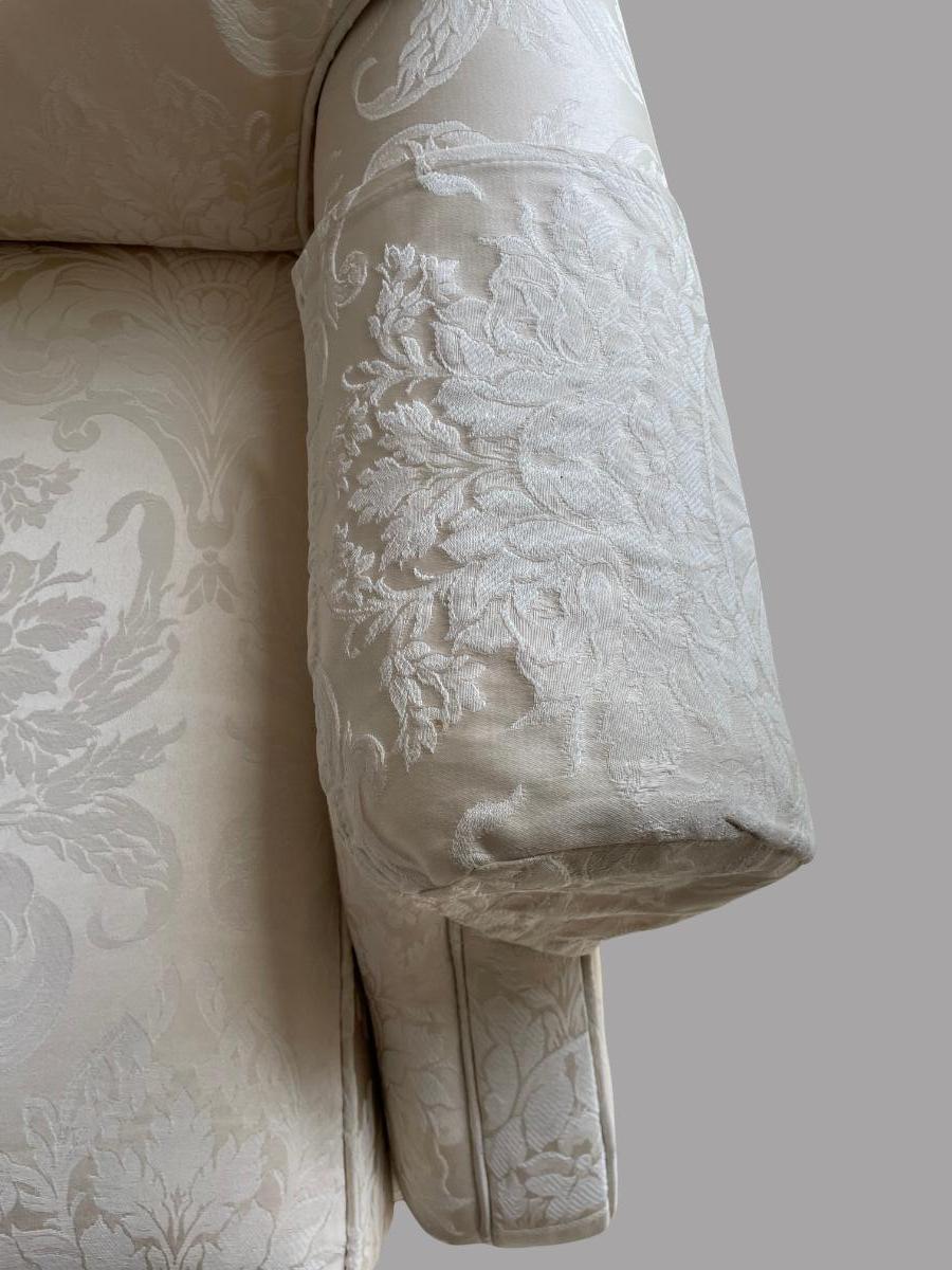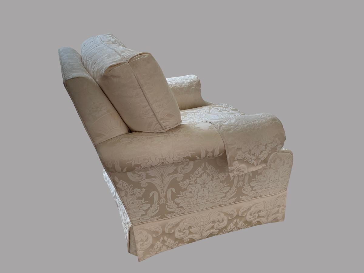 This pair of Key City upholstered armchairs featuring a white damask-patterned fabric are clean and very comfortable. The armchairs are constructed with rolled arms, a square back cushion, and a skirted base. It includes a loose seat and back cushion for added comfort. Made by Key City, established in 1927. 33h x 37w x 31d.