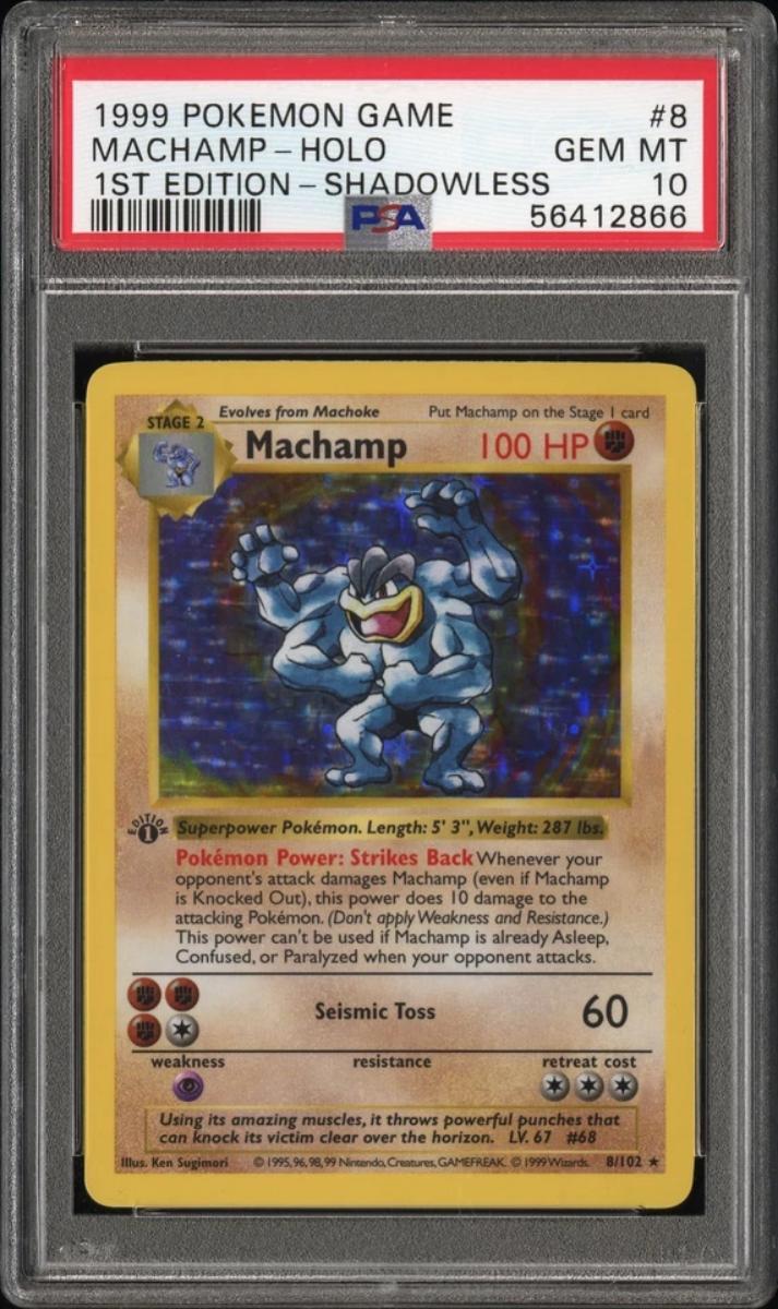PSA 10 Machamp 1st Edition Shadowless Base Holo Pokemon Card #8 GEM MINT POP 15!