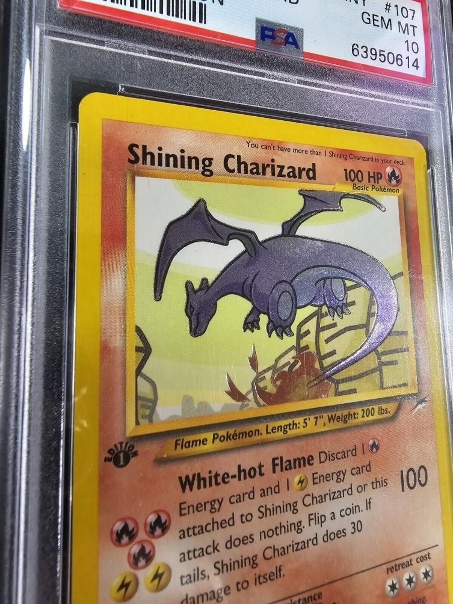 Set: Neo Destiny | Card Number: 107/105 | Card Name: Shining Charizard | Rarity: Gold Secret Rare | Features: 1st Edition | Language: English | Grade: PSA 10 GEM MINT | Grader: Professional Sports Authenticator (PSA) | Certification #: 63950614