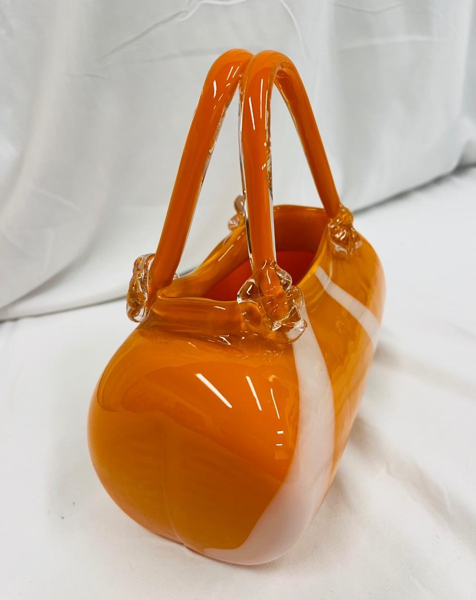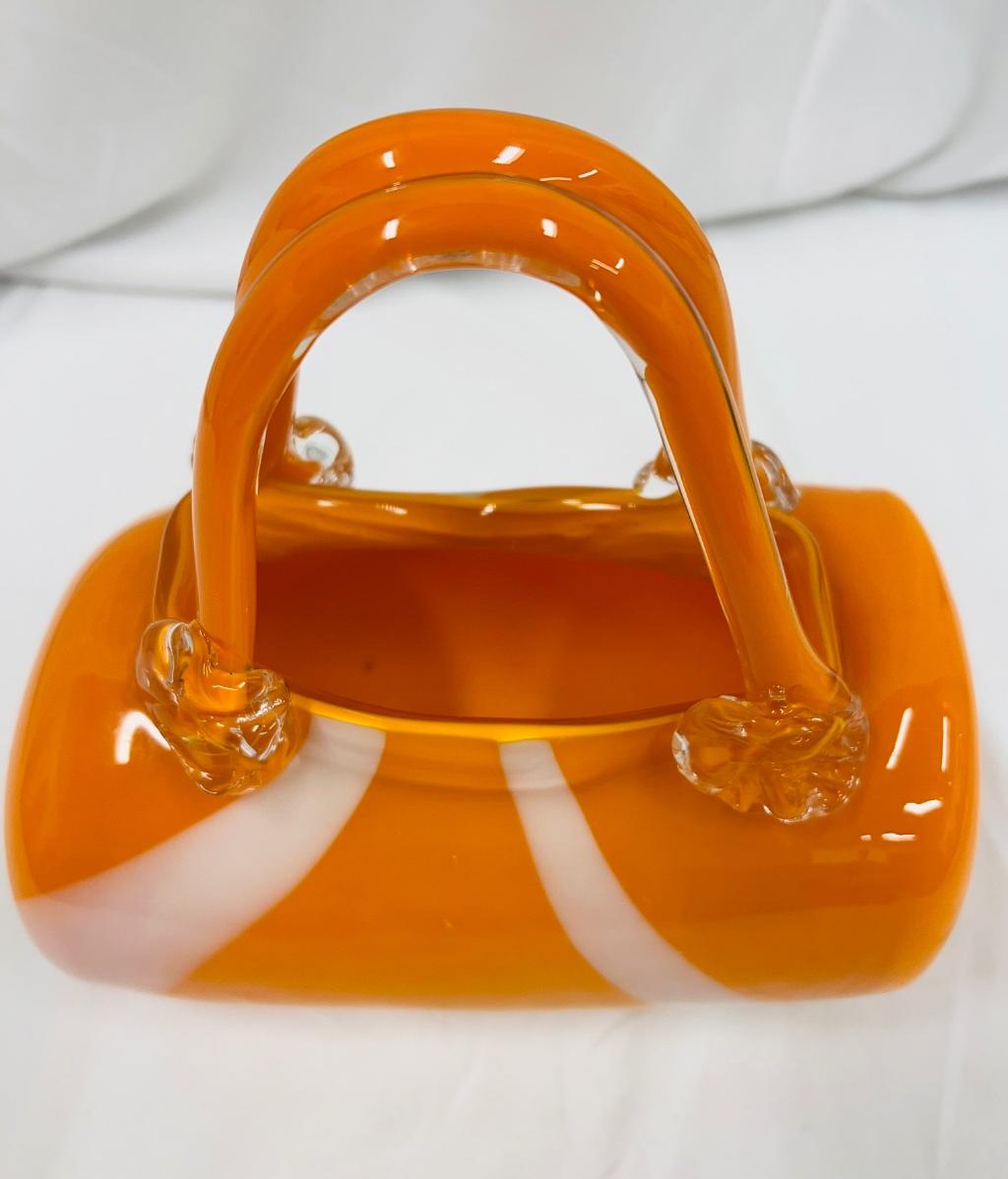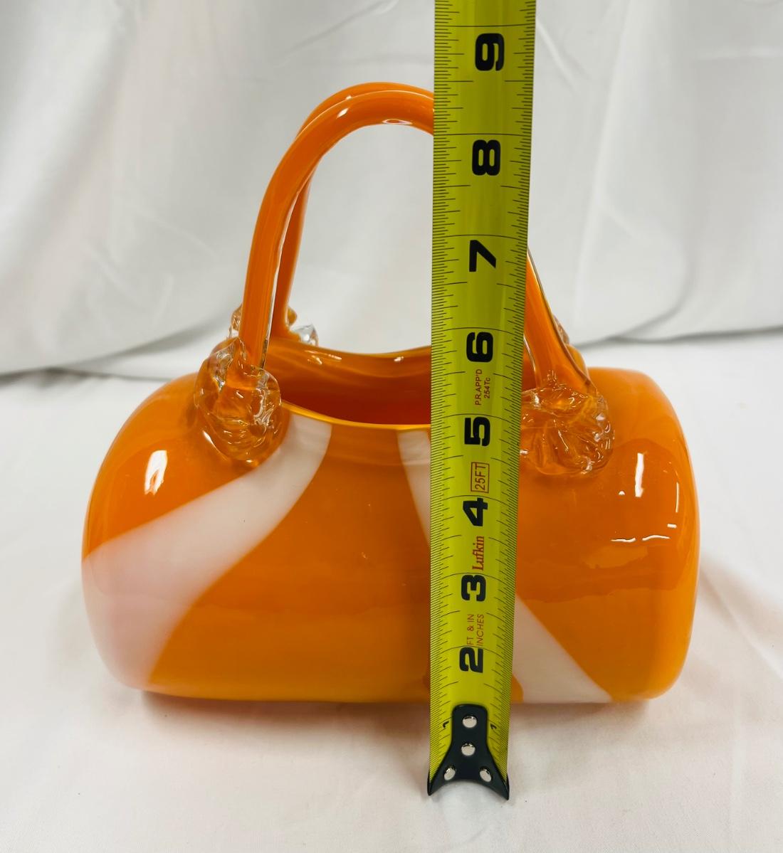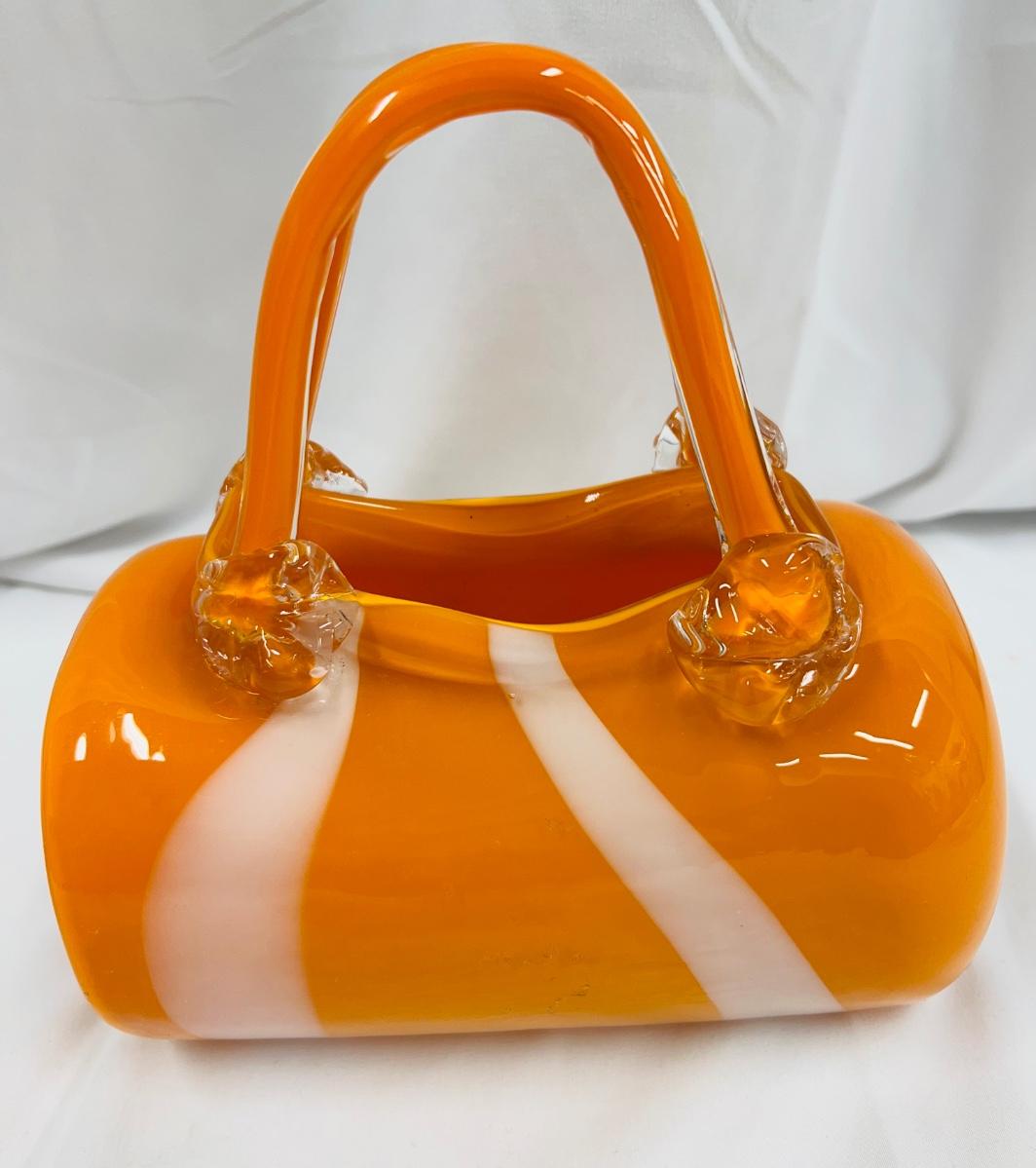 Art Deco Style Handblown Orange Art Glass Handbag Purse Vase with White lines very unique.