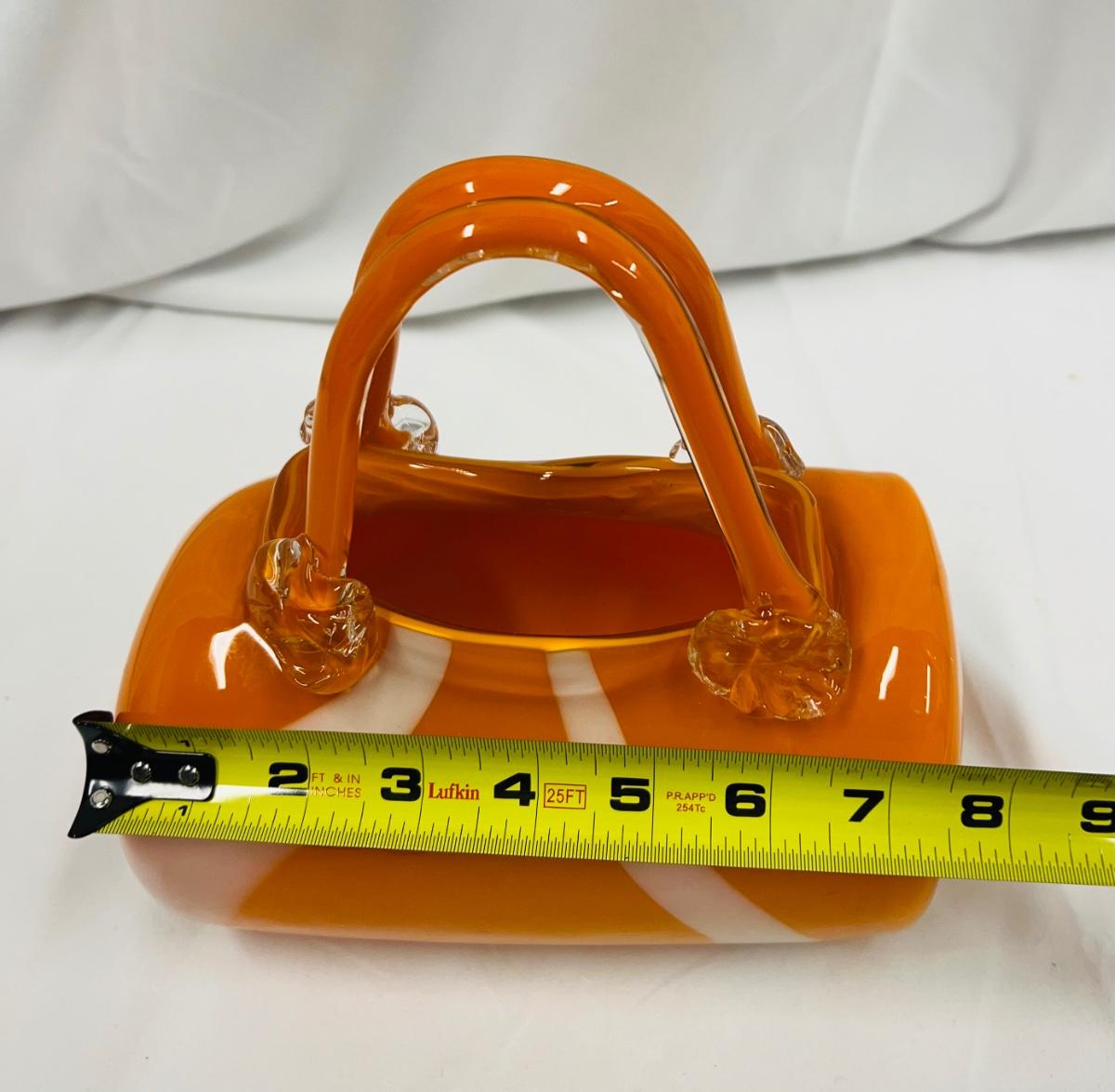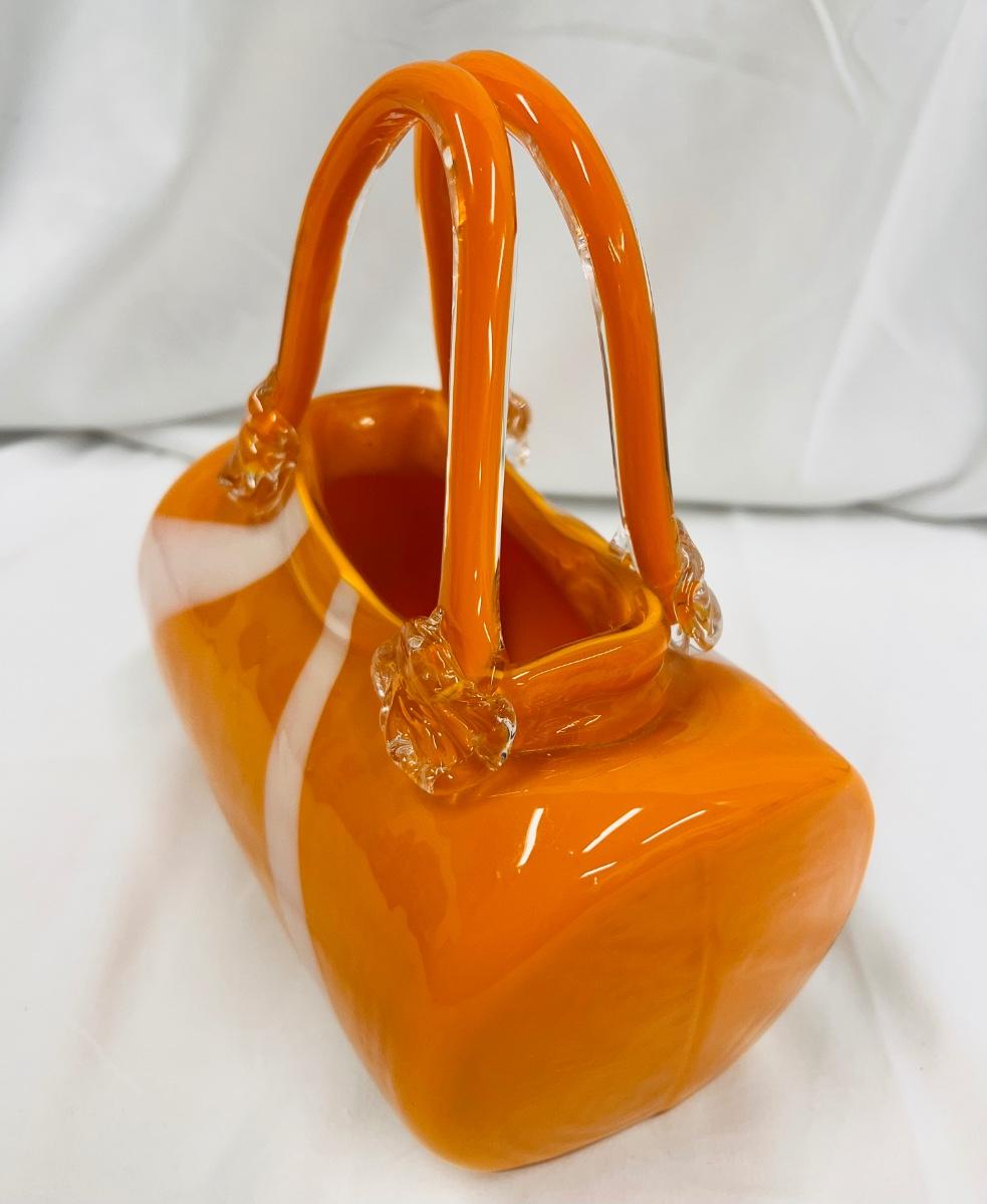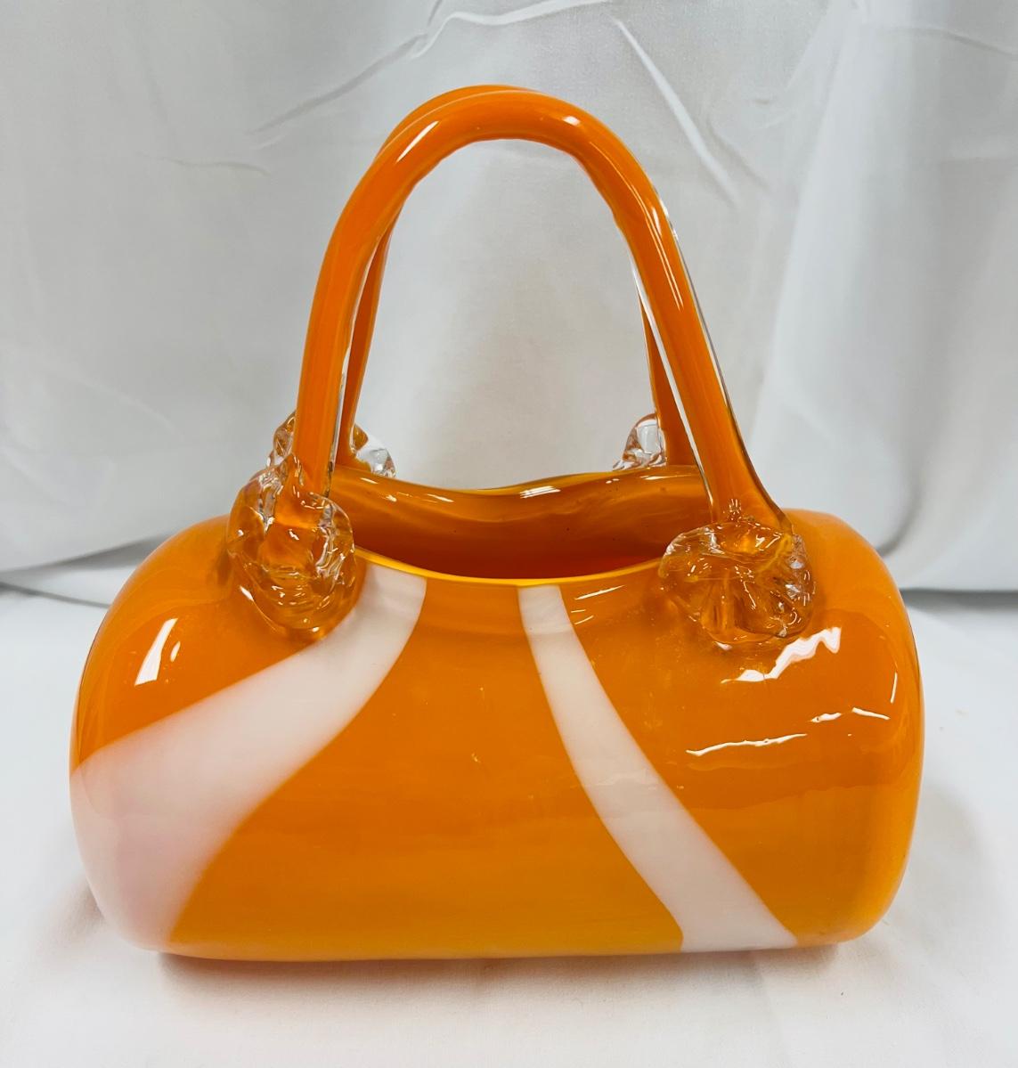 Art Deco Style Handblown Orange Art Glass Handbag Purse Vase with White lines very unique.