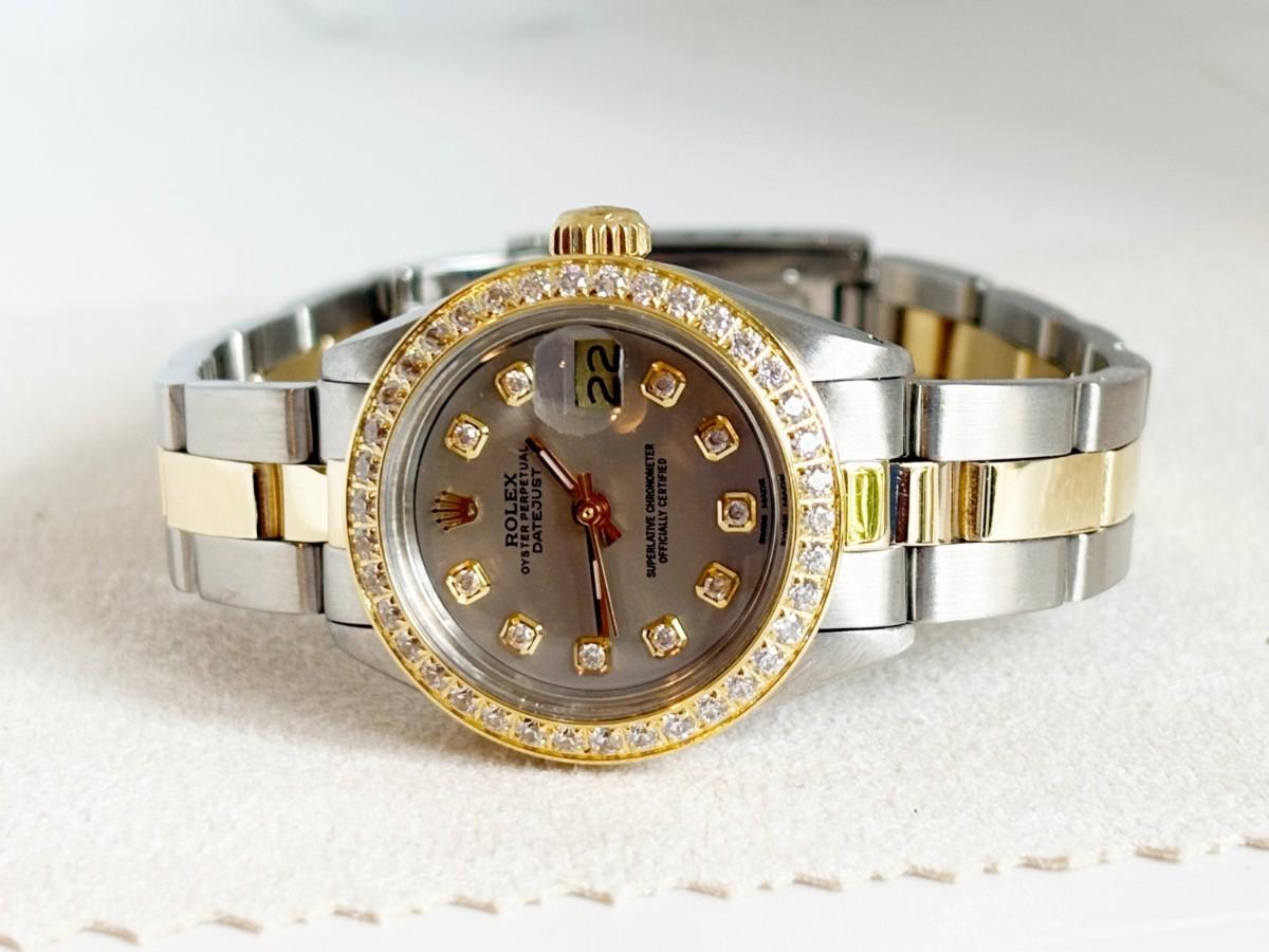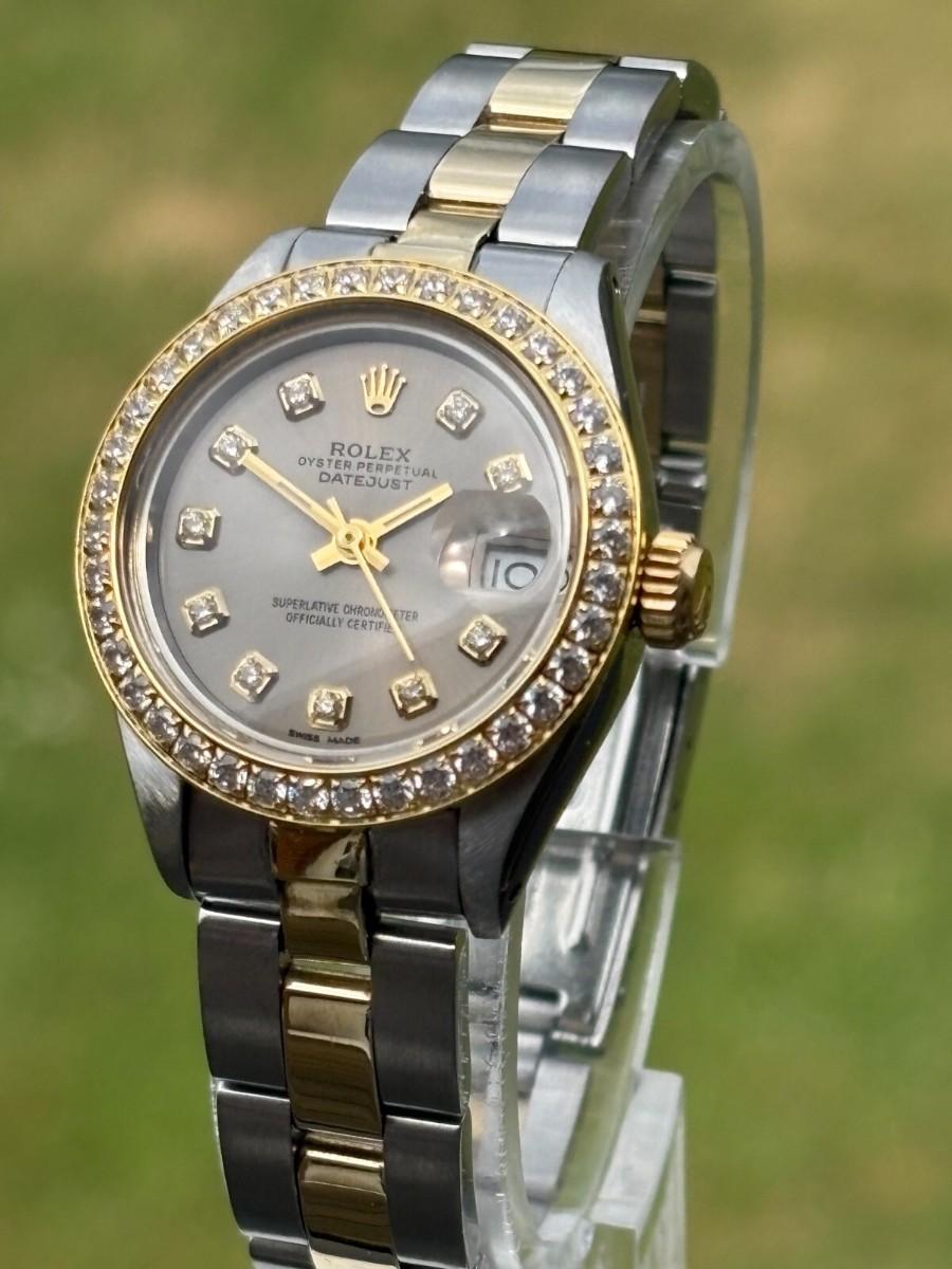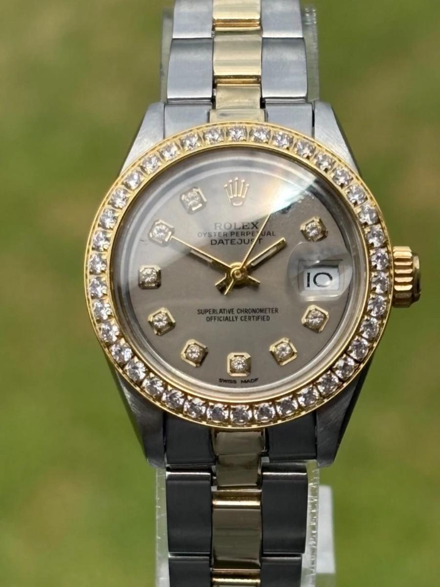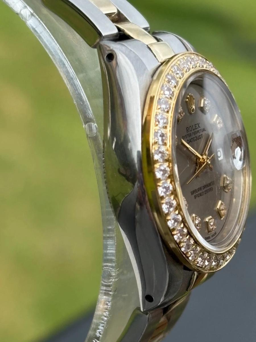 This Rolex Reference 6917 is the epitome of understated luxury. Combining the durability of stainless steel with the prestige of 18k yellow gold, this 26mm "Lady Date" features a stunning Custom Slate Dial adorned with brilliant diamond markers. The result is a sophisticated, moody aesthetic that contrasts beautifully against the gold accents.