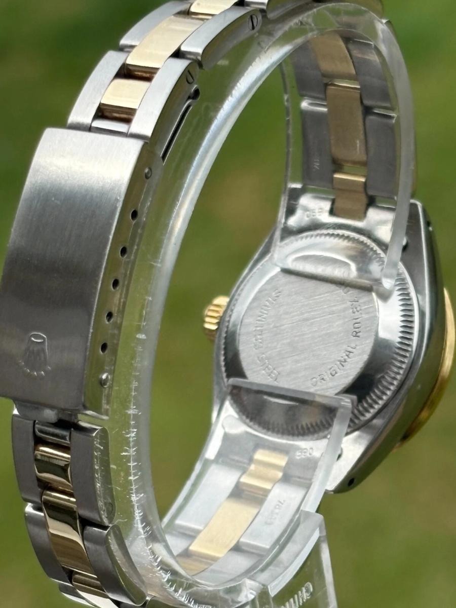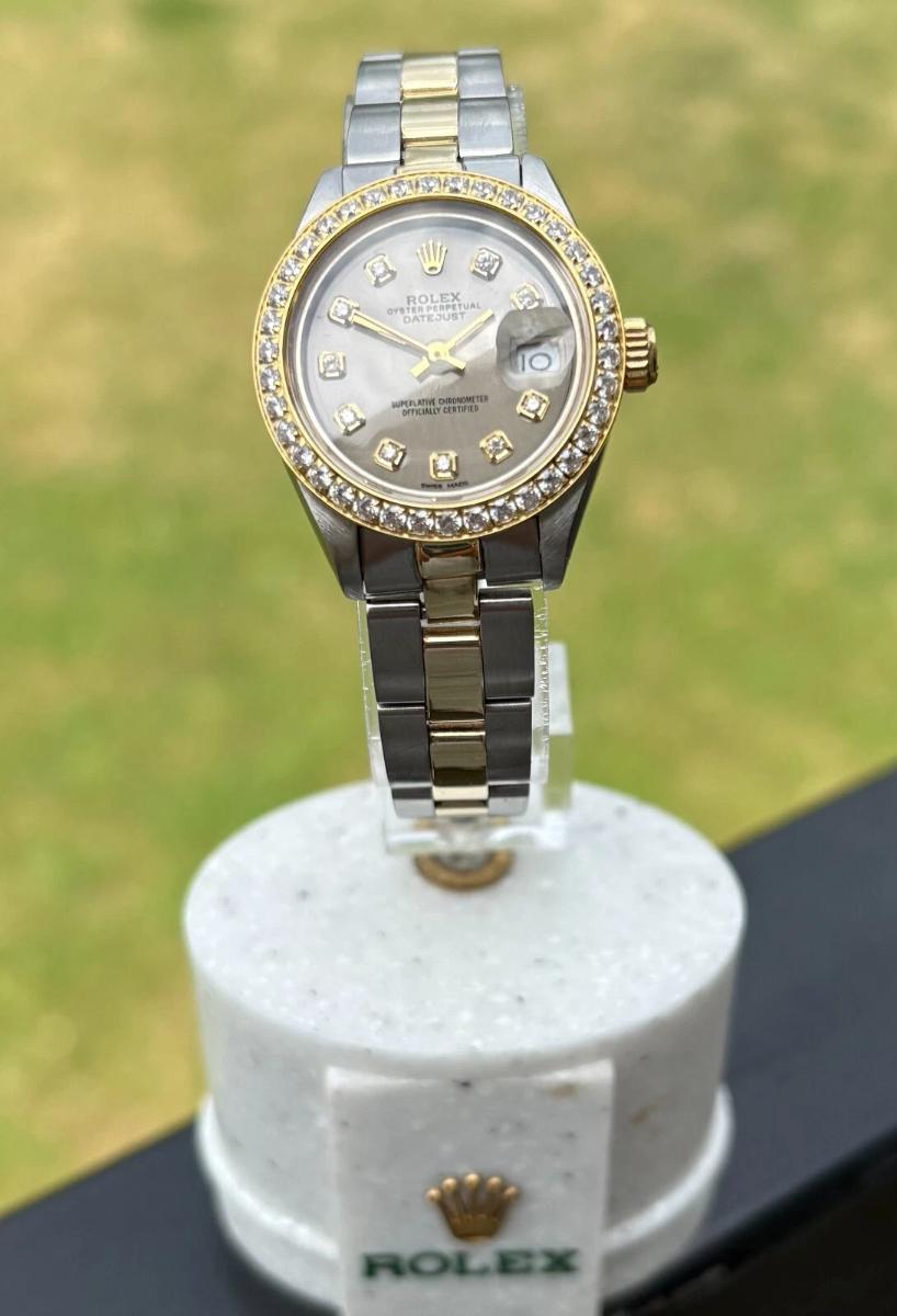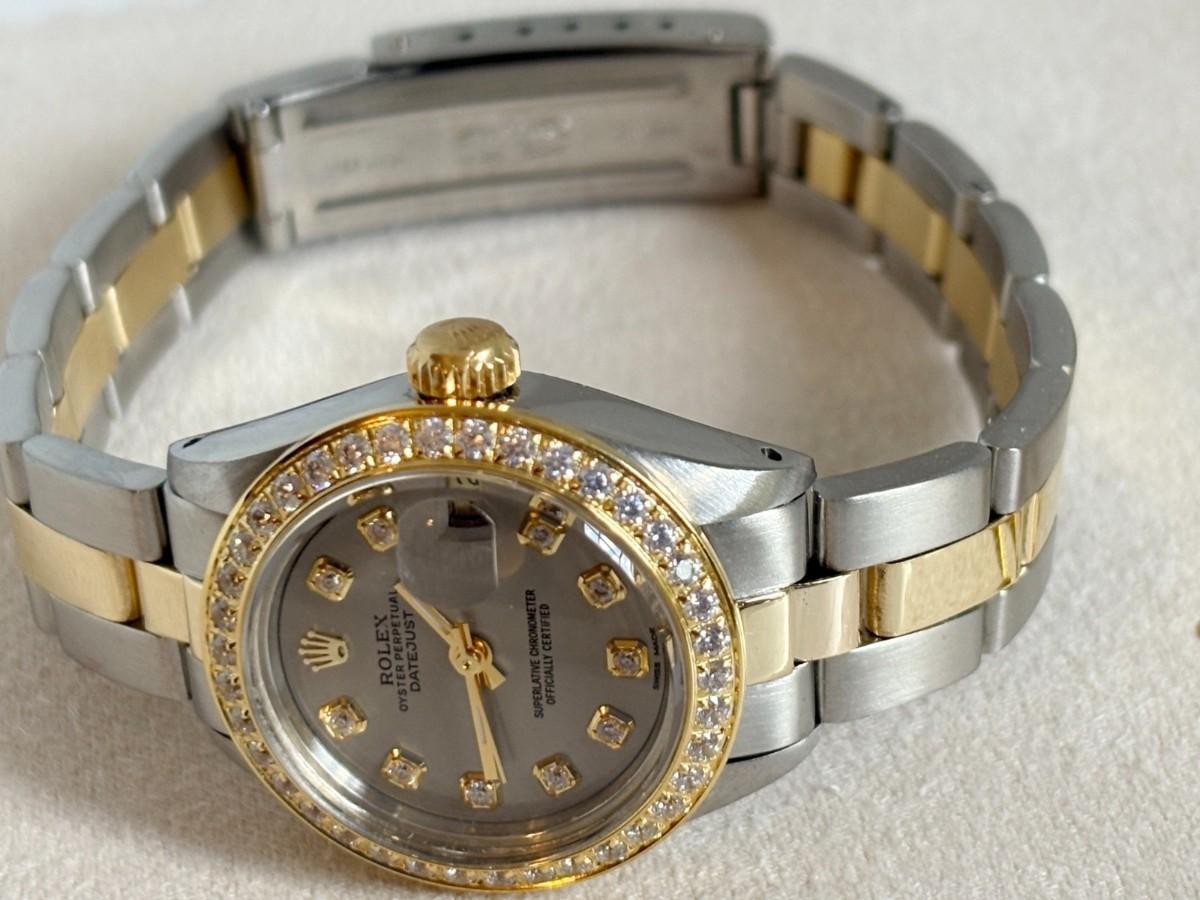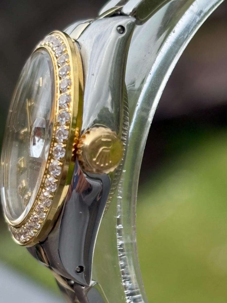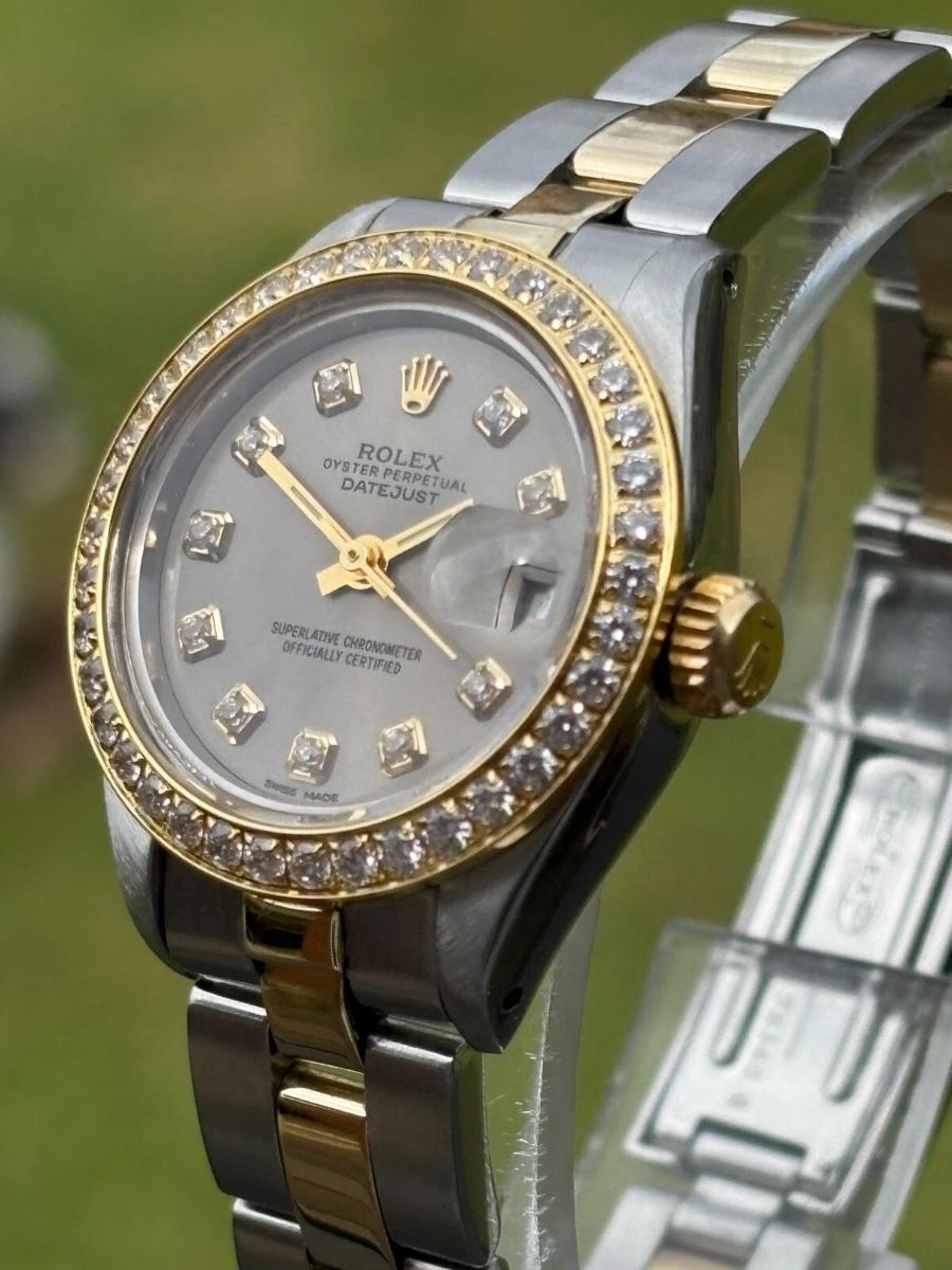 This Rolex Reference 6917 is the epitome of understated luxury. Combining the durability of stainless steel with the prestige of 18k yellow gold, this 26mm "Lady Date" features a stunning Custom Slate Dial adorned with brilliant diamond markers. The result is a sophisticated, moody aesthetic that contrasts beautifully against the gold accents.