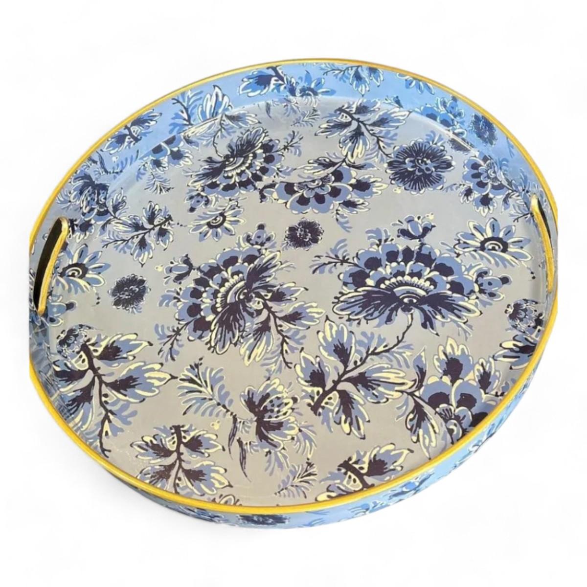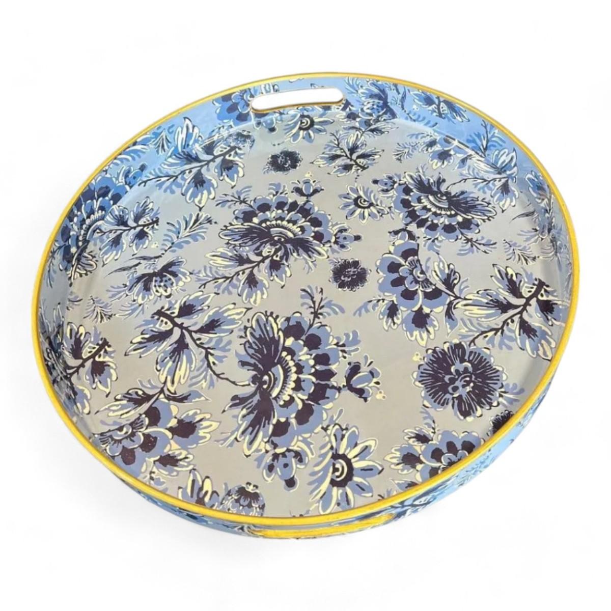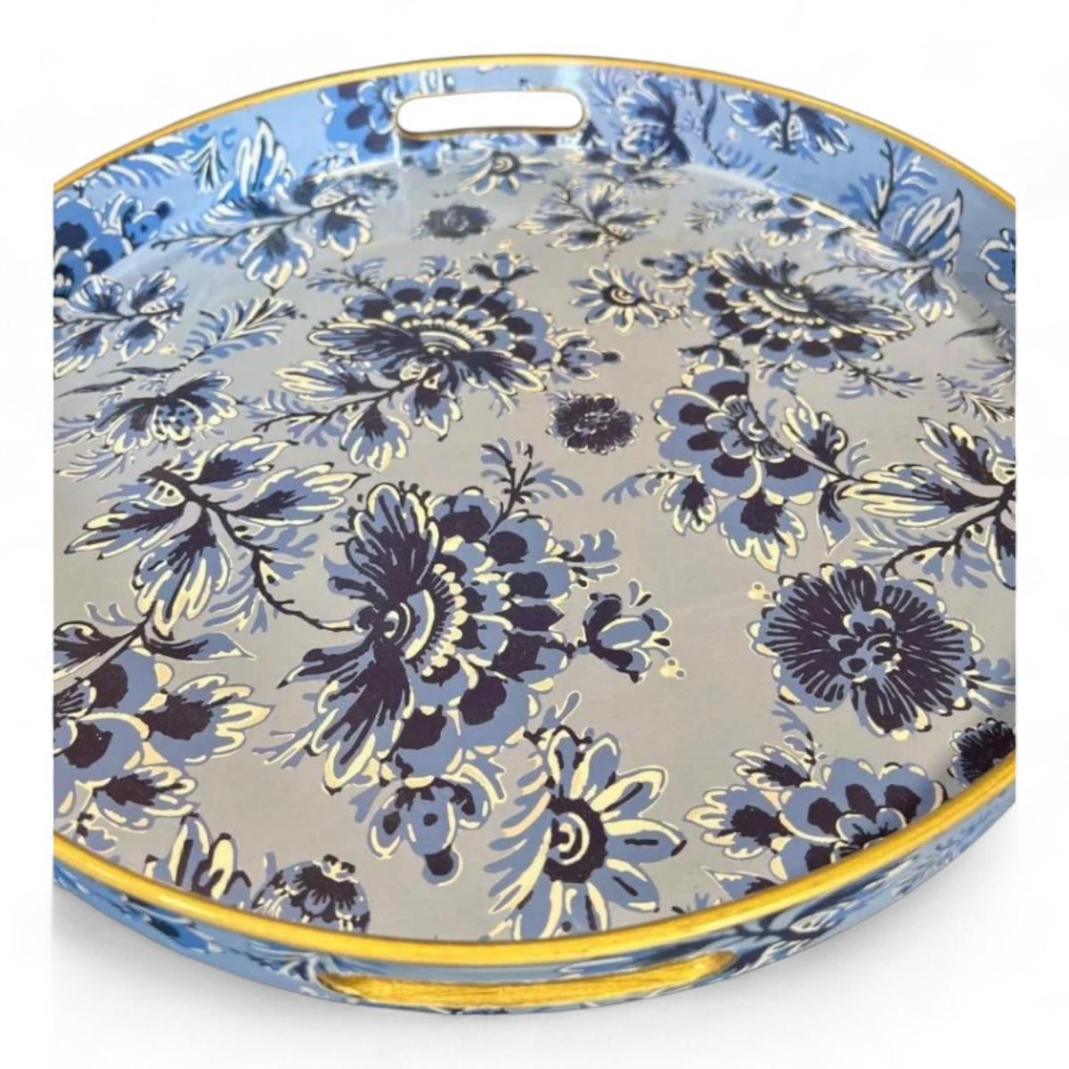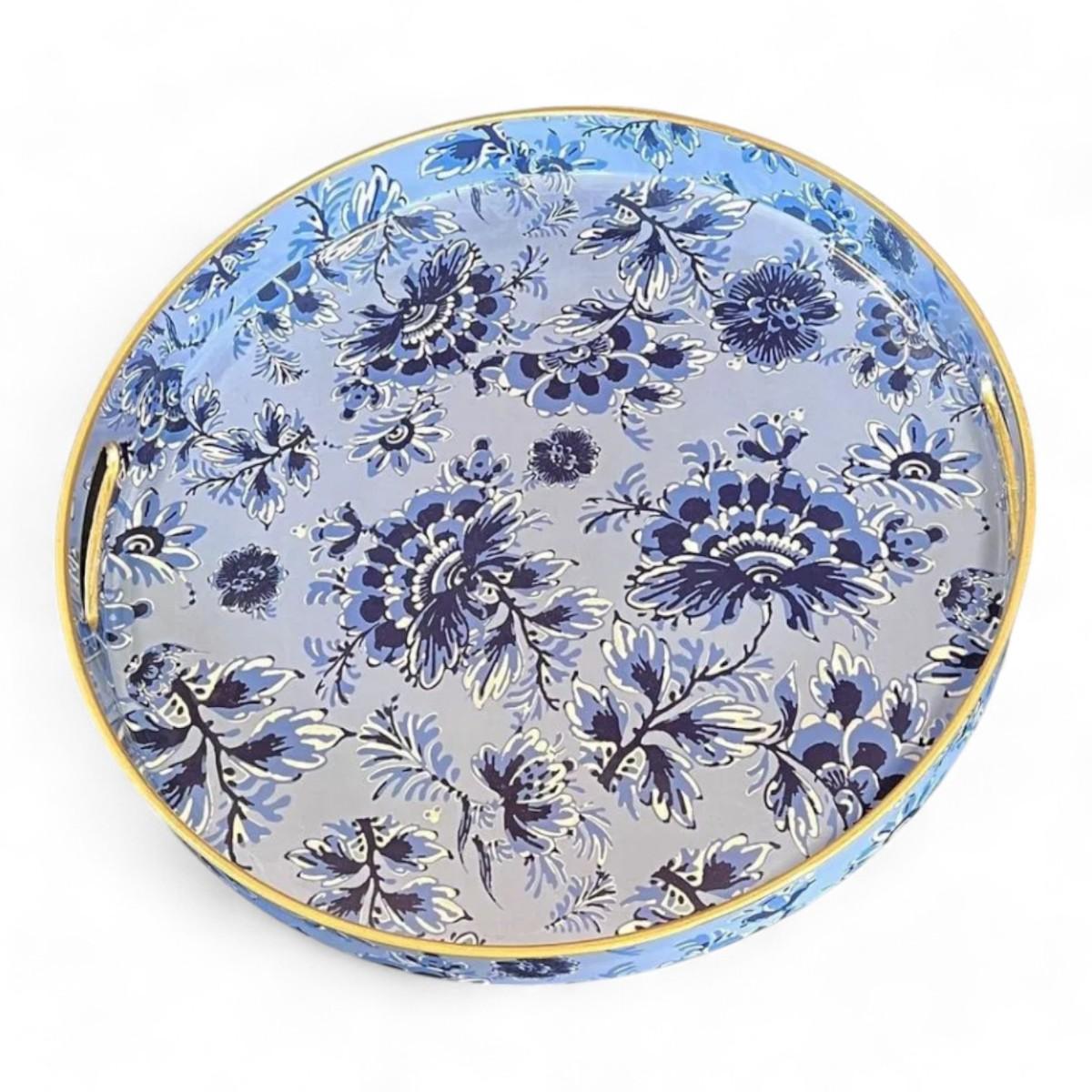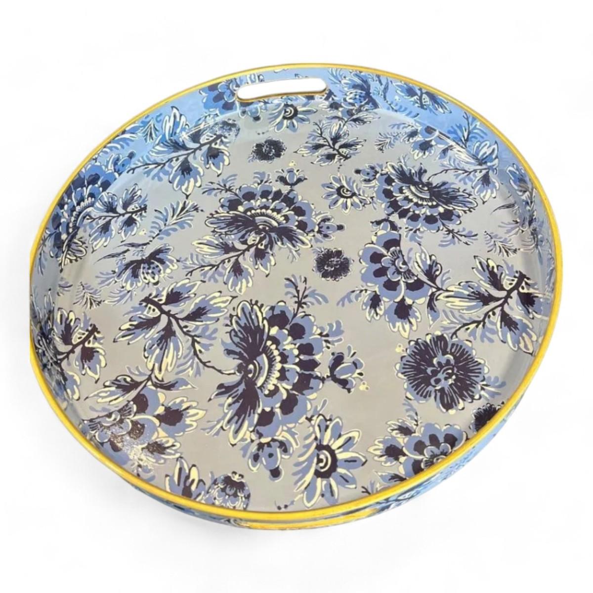 Round Decorative Serving Tray Blue And White Chinoiserie Floral Pattern Brand New