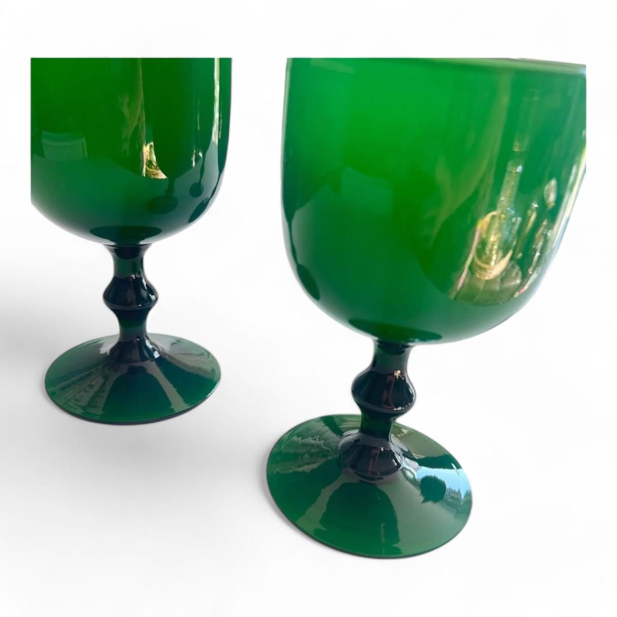 Set of 4 Italian Carlo Moretti Murano glass green wine goblets. Handcrafted elegance, perfect for entertaining, gifting, or adding luxury to your table decor and collection. Dimensions: 6” tall x 3 1/4” diameter