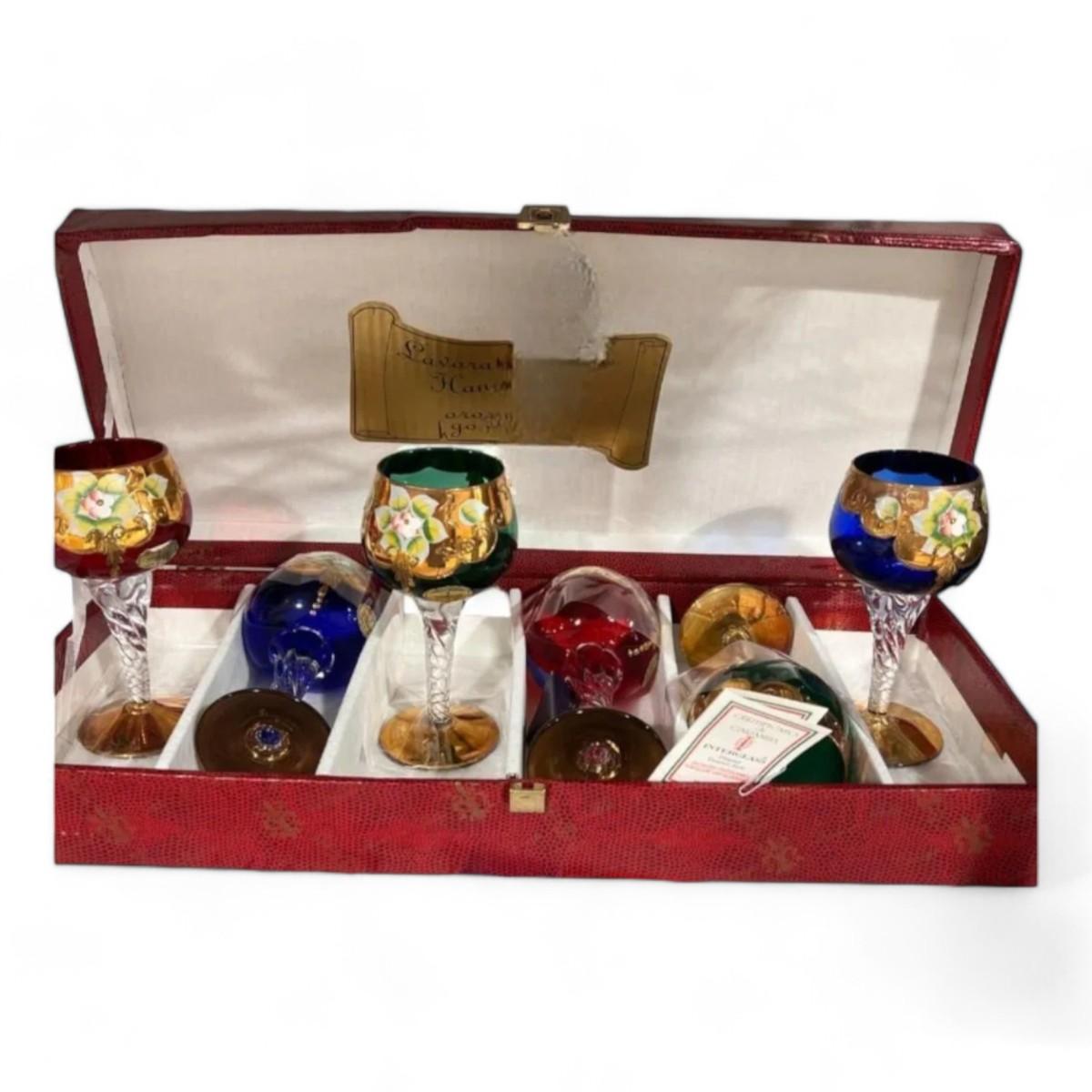 The set is brand new and comes beautifully gift-boxed making it an ideal present for special occasions or a delightful treat for yourself. The glasses are designed to enhance the enjoyment of your favorite wines while their artistic flair makes them perfect for showcasing at gatherings or adding a splash of color to your table setting. With their exquisite design and high-quality craftsmanship these Bohemian painted wine glasses are both functional and decorative bringing a touch of elegance and artistry to any occasion.