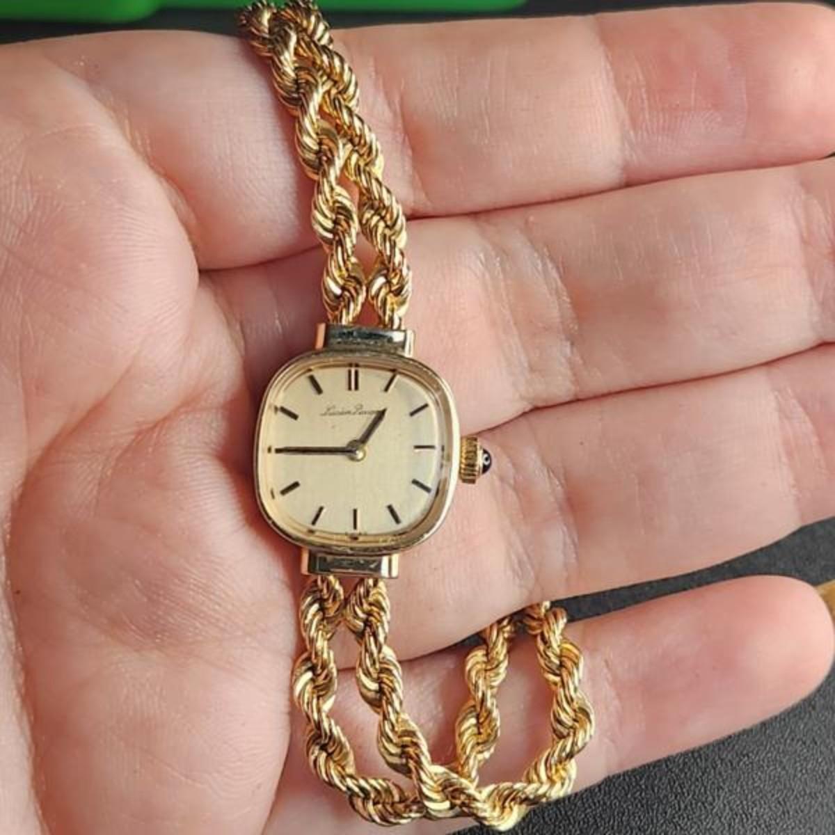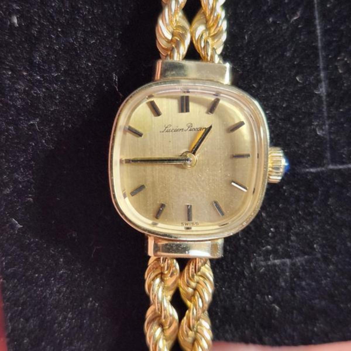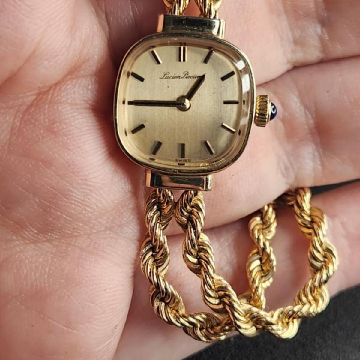vintage 14k solid gold lucien piccard watch, solid gold band and bezel. Sapphire cabochon on winder, Heavy weighs 24.95 grams. Not tested but its not working and it is easier to get a different motor.
