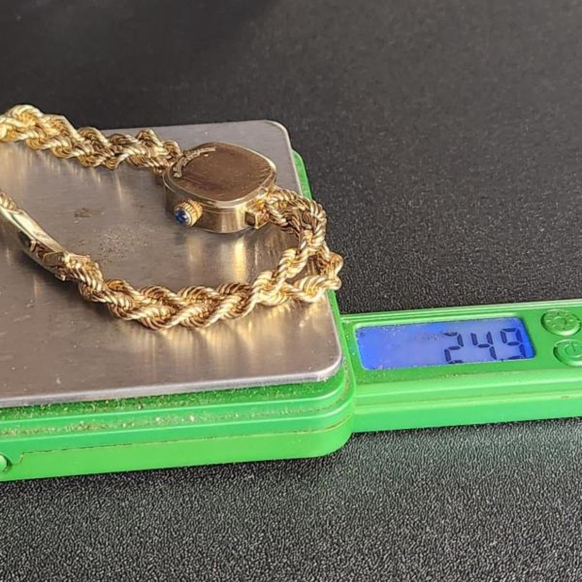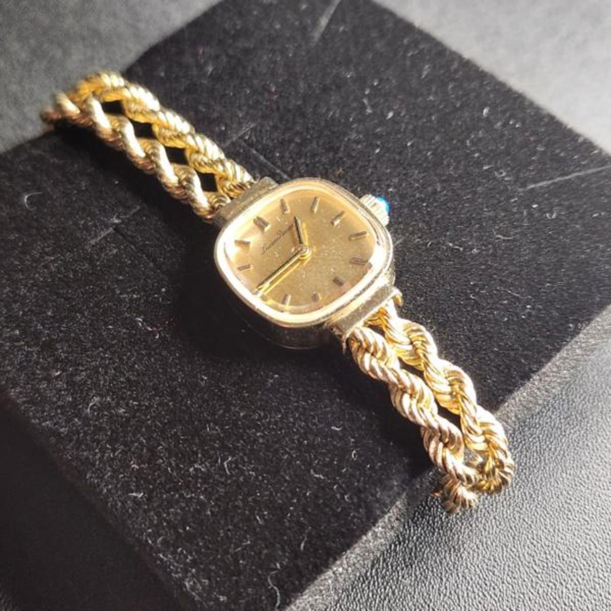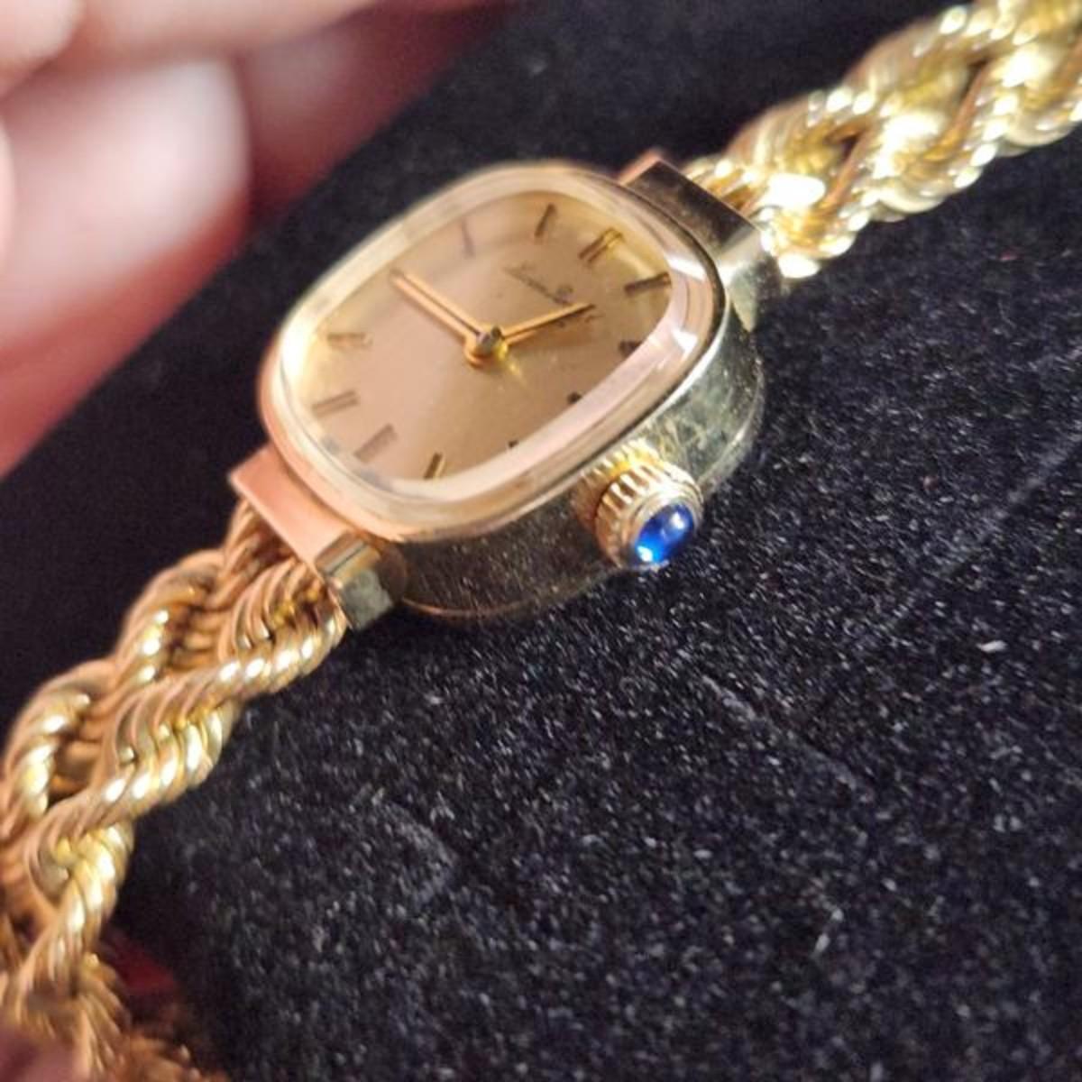 vintage 14k solid gold lucien piccard watch, solid gold band and bezel. Sapphire cabochon on winder, Heavy weighs 24.95 grams. Not tested but its not working and it is easier to get a different motor.