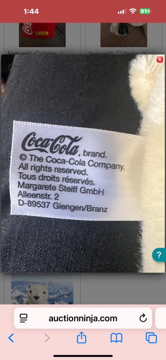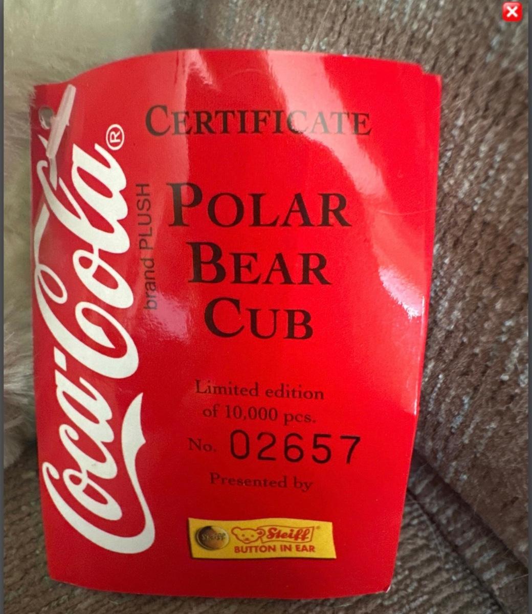 This Steiff Teddy Bear was made Exclusively fur Coca-cola. He’s made of mohair and is 8” tall limited edition 2657/10000.. has COA no box.