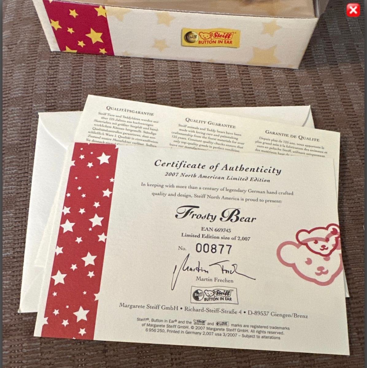 This Steiff bear is made of mohair and is 11” tall. Limited Edition 877/2007. Has COA and box