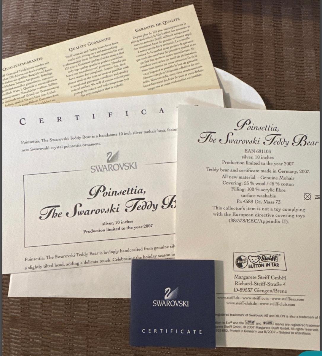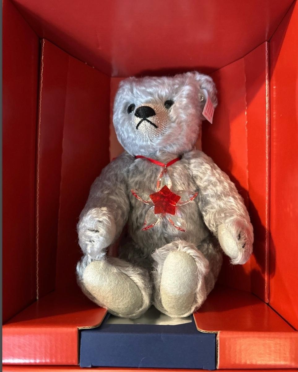 The bear was made exclusively for Swarovski. It’s made of mohair and stands 10 inches tall. Limited addition number 215/2007. Has COA and box.