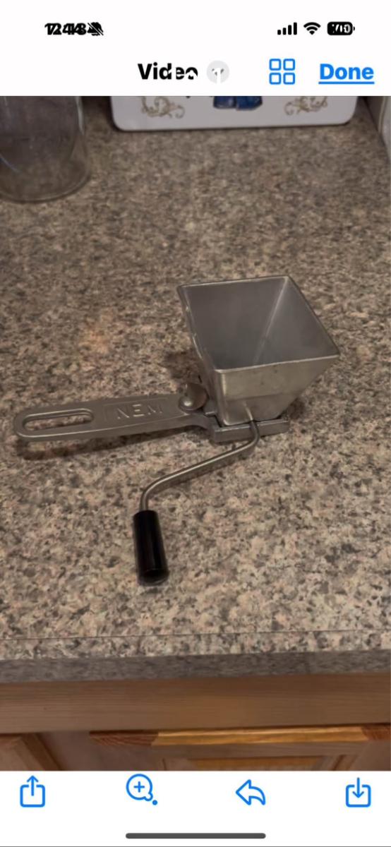 • Vintage Metal Hand-Crank Grinder (N.E.M. marked): A robust, small hand-operated metal food grinder or mincer, marked "N.E.M." A vintage kitchen gadget built to last, perfect for retro cooking enthusiasts.