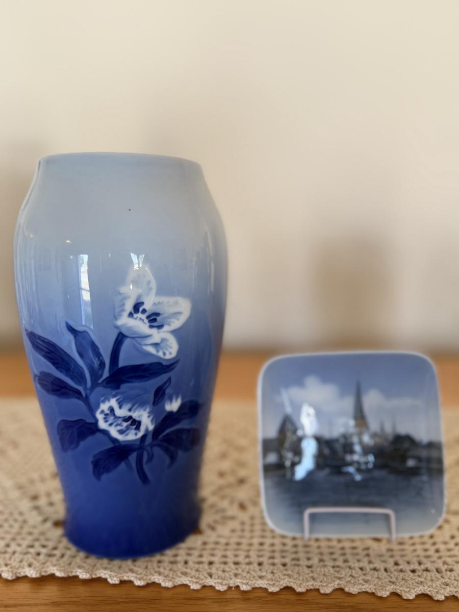 • Blue and White Porcelain Vase and Small Plate: A stunning blue and white floral-painted vase with a deep gradient and a small, square plate with a coastal/town scene. Likely high-quality Danish porcelain, perfect for a collector.