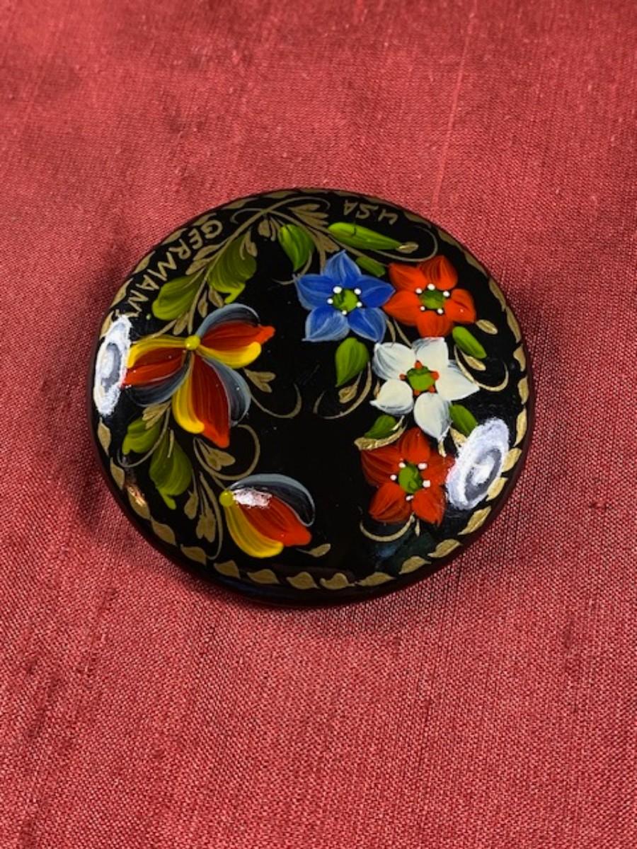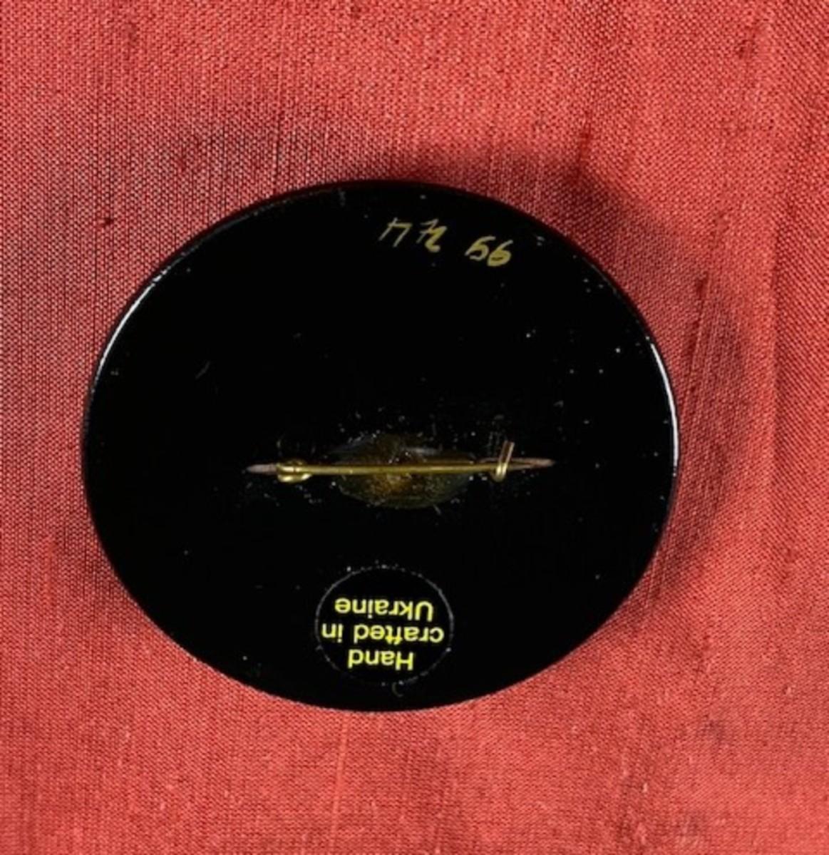 A Ukrainian Hand-Painted Wood Broach. This beautiful hand-painted broach is in the style of Russian lacquered boxes. The back states " Hand Crafted in Ukraine". On the front "USA - Germany" is written.