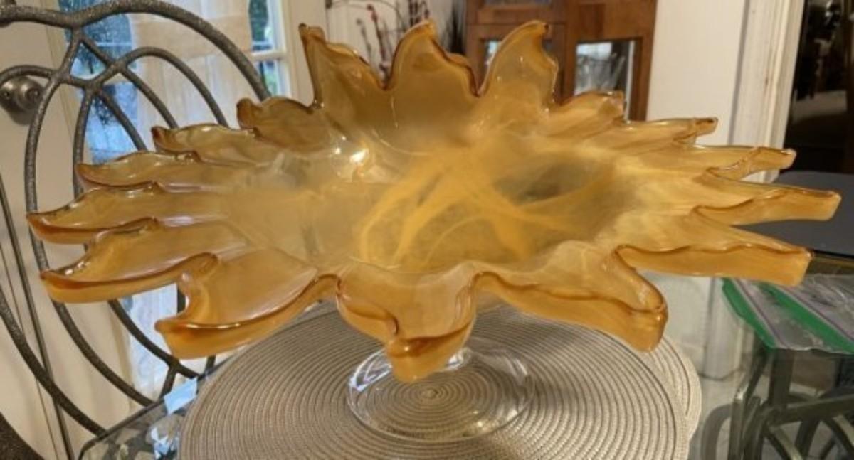 Unique Huge Mid-Century Art Glass Pedestal Bowl w/Scalloped Edges 7" Tall & 18" Wide in VG Preowned Condition.