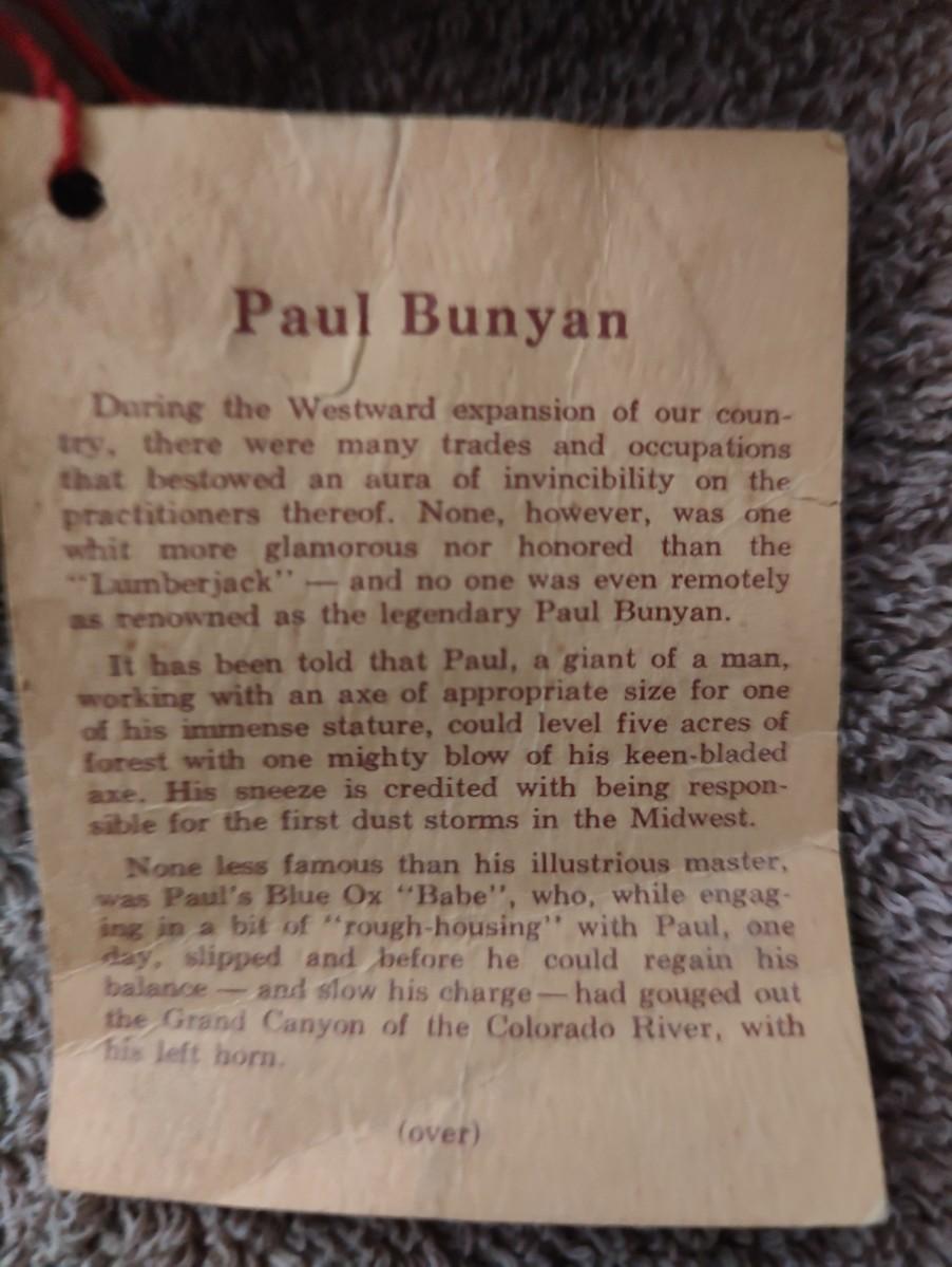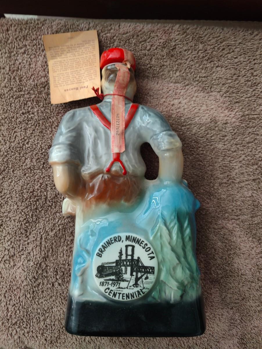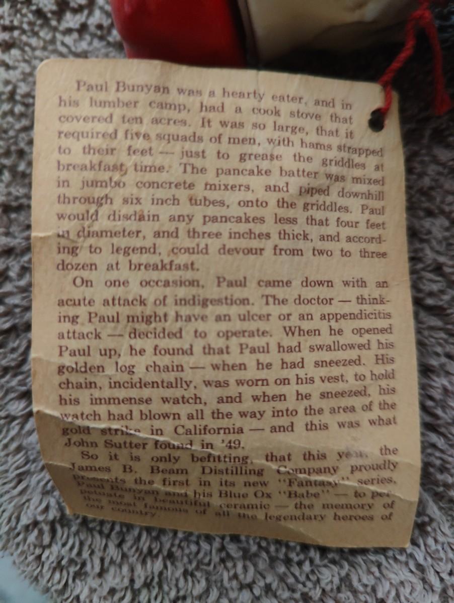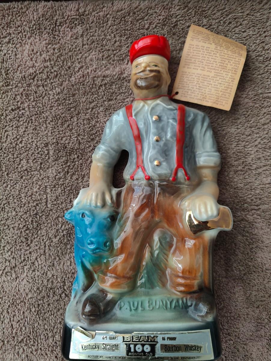 This is a vintage Beam 100 months old bottle depicting Paul Bunyon and his Blue ox. This bottle is being sold empty and as a collectors item. Bottle looks to be in good condition and includes a cardboard tag that has the story on it (tag is creased). Please look over the pictures carefully as they are part of the description of the item.